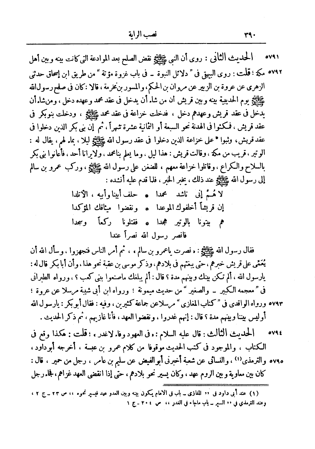 الْحَدِيثُ الثَّانِي: رُوِيَ أَنَّ النَّبِيَّ صَلَّى اللَّهُ عَلَيْهِ وَسَلَّمَ نَقَضَ الصُّلْحَ بَعْدَ الْمُوَادَعَةِ الَّتِي كَانَتْ بَيْنَهُ وَبَيْنَ أَهْلِ مَكَّةَ، قُلْت: رَوَى الْبَيْهَقِيُّ فِي "دَلَائِلِ النُّبُوَّةِ - فِي بَابِ غَزْوَةِ مُؤْتَةَ" مِنْ طَرِيقِ ابْنِ إسْحَاقَ حَدَّثَنِي الزُّهْرِيُّ عَنْ عُرْوَةَ بْنِ الزُّبَيْرِ عَنْ مَرْوَانَ بْنِ الْحَكَمِ، وَالْمِسْوَرِ بْنِ مَخْرَمَةَ، قَالَا: كَانَ فِي صُلْحِ رَسُولِ اللَّهِ صَلَّى اللَّهُ عَلَيْهِ وَسَلَّمَ يَوْمَ الْحُدَيْبِيَةِ بَيْنَهُ وَبَيْنَ قُرَيْشٍ أَنَّهُ مَنْ شَاءَ أَنْ يَدْخُلَ فِي عَقْدِ مُحَمَّدٍ وَعَهْدِهِ دَخَلَ، وَمَنْ شَاءَ أَنْ يَدْخُلَ فِي عَقْدِ قريش وعهده دَخَلَ، فَدَخَلَتْ خُزَاعَةُ فِي عَقْدِ مُحَمَّدٍ صَلَّى اللَّهُ عَلَيْهِ وَسَلَّمَ، وَدَخَلَتْ بَنُو بَكْرٍ فِي عَقْدِ قُرَيْشٍ، فَمَكَثُوا فِي الْهُدْنَةِ نَحْوَ السَّبْعَةِ أَوْ الثَّمَانِيَةَ عَشْرَةَ شَهْرًا، ثُمَّ إنَّ بَنِي بَكْرٍ الَّذِينَ دَخَلُوا فِي عَقْدِ قُرَيْشٍ، وَثَبُوا عَلَى خُزَاعَةَ الَّذِينَ دَخَلُوا فِي عَقْدِ رَسُولِ اللَّهِ صَلَّى اللَّهُ عَلَيْهِ وَسَلَّمَ لَيْلًا، بِمَاءٍ لَهُمْ، يُقَالُ لَهُ: الْوَتِيرُ، قَرِيبٌ مِنْ مَكَّةَ، وَقَالَتْ قُرَيْشٌ: هَذَا لَيْلٌ، وَمَا يَعْلَمُ بِنَا مُحَمَّدٌ، وَلَا يَرَانَا أَحَدٌ، فَأَعَانُوا بَنِي بَكْرٍ بِالسِّلَاحِ وَالْكُرَاعِ، وَقَاتَلُوا خُزَاعَةَ مَعَهُمْ، لِلضِّغْنِ عَلَى رَسُولِ اللَّهِ صَلَّى اللَّهُ عَلَيْهِ وَسَلَّمَ، وَرَكِبَ عَمْرُو بْنُ سَالِمٍ إلَى رَسُولِ اللَّهِ صَلَّى اللَّهُ عَلَيْهِ وَسَلَّمَ عِنْدَ ذَلِكَ، يُخْبِرُ الْخَبَرَ، فَلَمَّا قَدِمَ عَلَيْهِ أَنْشَدَهُ: