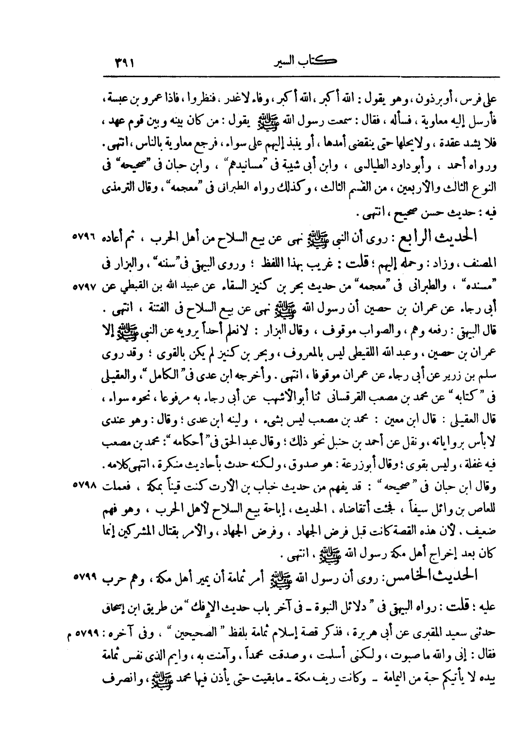 الْحَدِيثُ الرَّابِعُ: رُوِيَ أَنَّ النَّبِيَّ صَلَّى اللَّهُ عَلَيْهِ وَسَلَّمَ نَهَى عَنْ بَيْعِ السِّلَاحِ مِنْ أَهْلِ الْحَرْبِ، ثُمَّ أَعَادَهُ الْمُصَنِّفُ، وَزَادَ: وَحَمْلِهِ إلَيْهِمْ، قُلْت: غَرِيبٌ بِهَذَا اللَّفْظِ، وَرَوَى الْبَيْهَقِيُّ فِي "سُنَنِهِ"، وَالْبَزَّارُ فِي "مُسْنَدِهِ"، وَالطَّبَرَانِيُّ فِي "مُعْجَمِهِ" مِنْ حَدِيثِ بَحْرِ بْنِ كُنَيْزٍ السَّقَّاءِ عَنْ عَبْدِ اللَّهِ بْنِ اللَّقِيطِيِّ عَنْ أَبِي رَجَاءٍ عَنْ عِمْرَانَ بْنِ حُصَيْنٍ أَنَّ رَسُولَ اللَّهِ صَلَّى اللَّهُ عَلَيْهِ وَسَلَّمَ نَهَى عَنْ بَيْعِ السِّلَاحِ فِي الْفِتْنَةِ، انْتَهَى. قَالَ الْبَيْهَقِيُّ: رَفْعُهُ وَهْمٌ، وَالصَّوَابُ مَوْقُوفٌ، وَقَالَ الْبَزَّارُ: لَا نَعْلَمُ أَحَدًا يَرْوِيهِ عَنْ النَّبِيِّ صَلَّى اللَّهُ عَلَيْهِ وَسَلَّمَ إلَّا عِمْرَانَ بْنَ حُصَيْنٍ، وَعَبْدُ اللَّهِ اللَّقِيطِيُّ لَيْسَ بِالْمَعْرُوفِ، وَبَحْرُ بْنُ كُنَيْزٍ لَمْ يَكُنْ بِالْقَوِيِّ، وَقَدْ رَوَى سَالِمُ بْنُ رَزِينٍ عَنْ أَبِي رَجَاءٍ عَنْ عِمْرَانَ مَوْقُوفًا، انْتَهَى. وَأَخْرَجَهُ ابْنُ عَدِيٍّ فِي "الْكَامِلِ"، وَالْعُقَيْلِيُّ فِي "كِتَابِهِ" عَنْ مُحَمَّدِ بْنِ مُصْعَبٍ الْقَرْقَسَانِيِّ ثَنَا أَبُو الْأَشْهَبِ عَنْ أَبِي رَجَاءٍ بِهِ مَرْفُوعًا، نَحْوَهُ سَوَاءٌ، قَالَ الْعُقَيْلِيُّ: قَالَ ابْنُ مَعِينٍ: مُحَمَّدُ بْنُ مُصْعَبٍ لَيْسَ بِشَيْءٍ، وَلَيَّنَهُ ابْنُ عَدِيٍّ، وَقَالَ: وَهُوَ عِنْدِي لَا بَأْسَ بِرِوَايَاتِهِ، وَنَقَلَ عَنْ أَحْمَدَ بْنِ حَنْبَلٍ نَحْوَ ذَلِكَ، وَقَالَ عَبْدُ الْحَقِّ فِي "أَحْكَامِهِ": مُحَمَّدُ بْنُ مُصْعَبٍ فِيهِ غَفْلَةٌ، وَلَيْسَ بِقَوِيٍّ، وَقَالَ أَبُو زُرْعَةَ: هُوَ صَدُوقٌ، وَلَكِنَّهُ حَدَّثَ بِأَحَادِيثَ مُنْكَرَةٍ، انْتَهَى كَلَامُهُ. وَقَالَ ابْنُ حِبَّانَ فِي "صَحِيحِهِ": قَدْ يُفْهَمُ مِنْ حَدِيثِ خَبَّابُ بْنِ الْأَرَتِّ كُنْتُ قَيْنًا بِمَكَّةَ، فَعَمِلْتُ لِلْعَاصِ بْنِ وَائِلَ سَيْفًا، فَجِئْت أَتَقَاضَاهُ، الْحَدِيثَ، إبَاحَةُ بَيْعِ السِّلَاحِ لِأَهْلِ الْحَرْبِ، وَهُوَ فَهْمٌ ضَعِيفٌ، لِأَنَّ هَذِهِ الْقِصَّةَ كَانَتْ قَبْلَ فَرْضِ الْجِهَادِ، وَفُرِضَ الْجِهَادُ، وَالْأَمْرُ بِقِتَالِ الْمُشْرِكِينَ إنَّمَا كَانَ بَعْدَ إخْرَاجِ أَهْلِ مَكَّةَ رَسُولَ اللَّهِ صَلَّى اللَّهُ عَلَيْهِ وَسَلَّمَ، انْتَهَى.