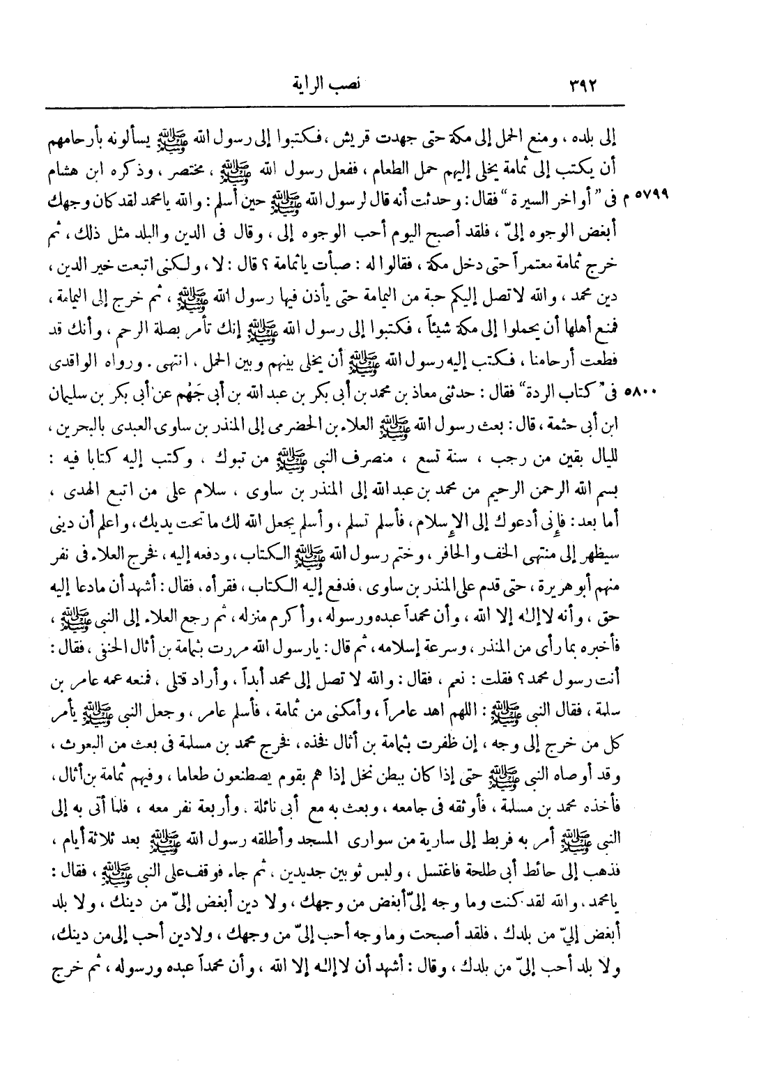 إلَى بَلَدِهِ، وَمَنَعَ الْحَمْلَ إلَى مَكَّةَ حَتَّى جَهِدَتْ قُرَيْشٌ، فَكَتَبُوا إلَى رَسُولِ اللَّهِ صَلَّى اللَّهُ عَلَيْهِ وَسَلَّمَ يَسْأَلُونَهُ بِأَرْحَامِهِمْ أَنْ يَكْتُبَ إلَى ثُمَامَةَ يُخَلِّيَ إلَيْهِمْ حَمْلَ الطَّعَامِ، فَفَعَلَ رَسُولُ اللَّهِ صَلَّى اللَّهُ عَلَيْهِ وَسَلَّمَ، مُخْتَصَرٌ، وَذَكَرَهُ ابْنُ هِشَامٍ فِي "أَوَاخِرِ السِّيرَةِ" فَقَالَ: وَحُدِّثْتُ أَنَّهُ قَالَ لِرَسُولِ اللَّهِ صَلَّى اللَّهُ عَلَيْهِ وَسَلَّمَ حِينَ أَسْلَمَ: وَاَللَّهِ يَا مُحَمَّدُ لَقَدْ كَانَ وَجْهُك أَبْغَضَ الْوُجُوهِ إلَيَّ، فَلَقَدْ أَصْبَحَ الْيَوْمَ أَحَبَّ الْوُجُوهِ إلَيَّ، وَقَالَ فِي الدِّينِ وَالْبَلَدِ مِثْلَ ذَلِكَ، ثُمَّ خَرَجَ ثُمَامَةُ مُعْتَمِرًا حَتَّى دَخَلَ مَكَّةَ، فَقَالُوا لَهُ: صَبَأْتَ يَا ثُمَامَةُ؟ قَالَ: لَا، وَلَكِنِّي اتَّبَعْتُ خَيْرَ الدِّينِ، دِينَ مُحَمَّدٍ، وَاَللَّهِ لَا تَصِلُ إلَيْكُمْ حَبَّةٌ مِنْ الْيَمَامَةِ حَتَّى يَأْذَنَ فِيهَا رَسُولُ اللَّهِ صَلَّى اللَّهُ عَلَيْهِ وَسَلَّمَ، ثُمَّ خَرَجَ إلَى الْيَمَامَةِ، فَمَنَعَ أَهْلَهَا أَنْ يَحْمِلُوا إلَى مَكَّةَ شَيْئًا، فَكَتَبُوا إلَى رَسُولِ اللَّهِ صَلَّى اللَّهُ عَلَيْهِ وَسَلَّمَ، إنَّك تَأْمُرُ بِصِلَةِ الرَّحِمِ، وَإِنَّك قَدْ قَطَعْتَ أَرْحَامَنَا، فَكَتَبَ إلَيْهِ رَسُولُ اللَّهِ صَلَّى اللَّهُ عَلَيْهِ وَسَلَّمَ أَنْ يُخَلِّيَ بَيْنَهُمْ وَبَيْنَ الْحَمْلِ، انْتَهَى. وَرَوَاهُ الْوَاقِدِيُّ فِي "كِتَابِ الرِّدَّةِ" فَقَالَ: حَدَّثَنِي مُعَاذُ بْنُ مُحَمَّدِ بْنِ أَبِي بَكْرِ بْنِ عَبْدِ اللَّهِ بن أبي جهيم عَنْ أَبِي بَكْرِ بْنِ سُلَيْمَانَ بْنِ أَبِي حَثْمَةَ، قَالَ: بَعَثَ رَسُولُ اللَّهِ صَلَّى اللَّهُ عَلَيْهِ وَسَلَّمَ الْعَلَاءَ بْنَ الْحَضْرَمِيِّ إلَى الْمُنْذِرِ بْنِ سَاوَى الْعَبْدِيِّ بِالْبَحْرَيْنِ، لِلَيَالٍ بَقِينَ مِنْ رَجَبٍ، سَنَةَ تِسْعٍ، مُنْصَرِفَ النَّبِيِّ صَلَّى اللَّهُ عَلَيْهِ وَسَلَّمَ مِنْ تَبُوكَ، وَكَتَبَ إلَيْهِ كِتَابًا فِيهِ: " بِسْمِ اللَّهِ الرَّحْمَنِ الرَّحِيمِ مِنْ مُحَمَّدِ بْنِ عَبْدِ اللَّهِ إلَى الْمُنْذِرِ بْنِ سَاوَى، سَلَامٌ عَلَى مَنْ اتَّبَعَ الْهُدَى، أَمَّا بَعْدُ: فَإِنِّي أَدْعُوك إلَى الْإِسْلَامِ، فَأَسْلِمْ تَسْلَمْ، وَأَسْلِمْ يَجْعَلْ اللَّهُ لَك مَا تَحْتَ يَدَيْك، وَاعْلَمْ أَنَّ دِينِي سَيَظْهَرُ إلَى مُنْتَهَى الْخُفِّ وَالْحَافِرِ"، وَخَتَمَ رَسُولُ اللَّهِ صَلَّى اللَّهُ عَلَيْهِ وَسَلَّمَ الْكِتَابَ، وَدَفَعَهُ إلَيْهِ، فَخَرَجَ الْعَلَاءُ فِي نَفَرٍ مِنْهُمْ أَبُو هُرَيْرَةَ، حَتَّى قَدِمَ عَلَى الْمُنْذِرِ بْنِ سَاوَى، فَدَفَعَ إلَيْهِ الْكِتَابَ، فَقَرَأَهُ، فَقَالَ: أَشْهَدُ أَنَّ مَا دَعَا إلَيْهِ حَقٌّ، وَأَنَّهُ لَا إلَهَ إلَّا اللَّهُ، وَأَنَّ مُحَمَّدًا عَبْدُهُ وَرَسُولُهُ، وَأَكْرَمَ مَنْزِلَهُ، ثُمَّ رَجَعَ الْعَلَاءُ إلَى النَّبِيِّ صَلَّى اللَّهُ عَلَيْهِ وَسَلَّمَ، فَأَخْبَرَهُ بِمَا رَأَى مِنْ الْمُنْذِرِ، وَسُرْعَةِ إسْلَامِهِ، ثُمَّ قَالَ: يَا رَسُولَ اللَّهِ مَرَرْت بِثُمَامَةَ بْنِ أُثَالٍ الْحَنَفِيِّ، فَقَالَ: أَنْتَ رَسُولُ مُحَمَّدٍ؟ فَقُلْت: نَعَمْ، فَقَالَ: وَاَللَّهِ لَا تَصِلُ إلَى مُحَمَّدٍ أَبَدًا، وَأَرَادَ قَتْلِي، فَمَنَعَهُ عَمُّهُ عَامِرُ بْنُ سَلَمَةَ، فَقَالَ النَّبِيُّ صَلَّى اللَّهُ عَلَيْهِ وَسَلَّمَ: "اللَّهُمَّ اهْدِ عَامِرًا، وَأَمْكِنِّي مِنْ ثُمَامَةَ"، فَأَسْلَمَ عَامِرٌ، وَجَعَلَ النَّبِيُّ صَلَّى اللَّهُ عَلَيْهِ وَسَلَّمَ يَأْمُرُ كُلَّ مَنْ خَرَجَ إلَى وَجْهٍ، إنْ ظَفِرْت بِثُمَامَةَ بْنِ أُثَالٍ فَخُذْهُ، فَخَرَجَ مُحَمَّدُ بْنُ م