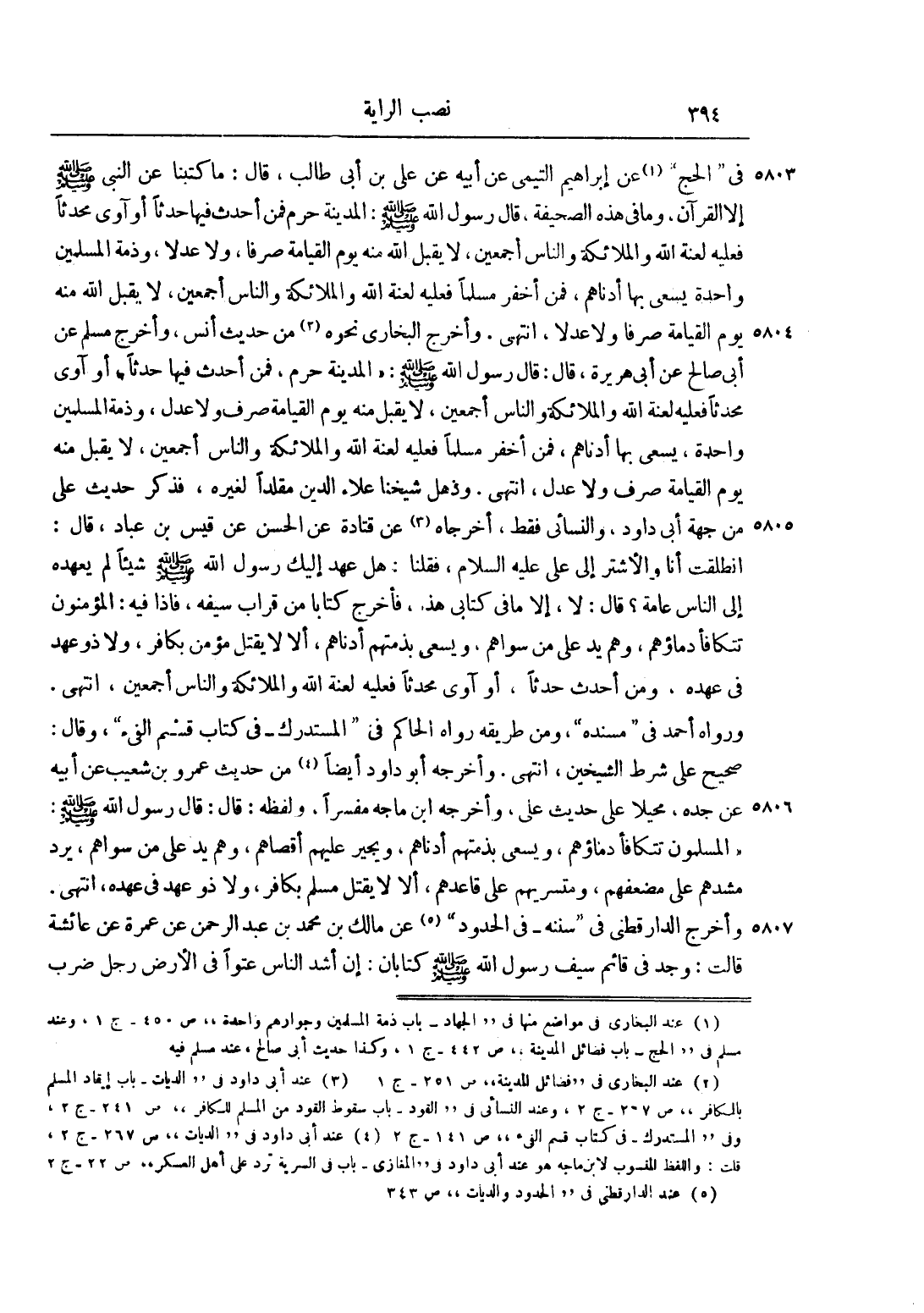 فِي "الْحَجِّ" 1 عَنْ إبْرَاهِيمَ التَّيْمِيِّ عَنْ أَبِيهِ عَنْ عَلِيِّ بْنِ أَبِي طَالِبٍ، قَالَ: مَا كَتَبْنَا عَنْ النَّبِيِّ صَلَّى اللَّهُ عَلَيْهِ وَسَلَّمَ إلَّا الْقُرْآنَ، وَمَا فِي هَذِهِ الصَّحِيفَةِ، قَالَ رَسُولُ اللَّهِ صَلَّى اللَّهُ عَلَيْهِ وَسَلَّمَ: " الْمَدِينَةُ حَرَمٌ فَمَنْ أَحْدَثَ فِيهَا حَدَثًا أَوْ آوَى مُحْدِثًا فَعَلَيْهِ لَعْنَةُ اللَّهِ وَالْمَلَائِكَةِ وَالنَّاسِ أَجْمَعِينَ، لَا يَقْبَلُ اللَّهُ مِنْهُ يَوْمَ الْقِيَامَةِ صَرْفًا، وَلَا عَدْلًا، وَذِمَّةُ الْمُسْلِمِينَ وَاحِدَةٌ يَسْعَى بِهَا أَدْنَاهُمْ، فَمَنْ أَخْفَرَ مُسْلِمًا فَعَلَيْهِ لَعْنَةُ اللَّهِ وَالْمَلَائِكَةِ وَالنَّاسِ أَجْمَعِينَ، لَا يَقْبَلُ اللَّهُ مِنْهُ يَوْمَ الْقِيَامَةِ صَرْفًا وَلَا عَدْلًا"، انْتَهَى. وَأَخْرَجَ الْبُخَارِيُّ نَحْوَهُ 2 مِنْ حديث أنس، وأخرجه مُسْلِمٌ عَنْ أَبِي صَالِحٍ عَنْ أَبِي هُرَيْرَةَ، قَالَ: قَالَ رَسُولُ اللَّهِ صَلَّى اللَّهُ عَلَيْهِ وَسَلَّمَ: "الْمَدِينَةُ حَرَمٌ، فَمَنْ أَحْدَثَ فِيهَا حَدَثًا، أَوْ آوَى مُحْدِثًا فَعَلَيْهِ لَعْنَةُ اللَّهِ وَالْمَلَائِكَةِ وَالنَّاسِ أَجْمَعِينَ، لَا يُقْبَلُ مِنْهُ يَوْمَ الْقِيَامَةِ صَرْفٌ وَلَا عَدْلٌ، وَذِمَّةُ الْمُسْلِمِينَ وَاحِدَةٌ، يَسْعَى بِهَا أَدْنَاهُمْ، فَمَنْ أَخْفَرَ مُسْلِمًا فَعَلَيْهِ لَعْنَةُ اللَّهِ وَالْمَلَائِكَةِ وَالنَّاسِ أجمعين، ولا يُقْبَلُ مِنْهُ يَوْمَ الْقِيَامَةِ صَرْفٌ وَلَا عَدْلٌ"، انْتَهَى. وَذَهِلَ شَيْخُنَا عَلَاءُ الدِّينِ مُقَلِّدًا لِغَيْرِهِ، فَذَكَرَ حَدِيثَ عَلِيٍّ مِنْ جِهَةِ أَبِي دَاوُد، وَالنَّسَائِيُّ فَقَطْ، أَخْرَجَاهُ 3 عَنْ قَتَادَةَ عَنْ الْحَسَنِ عَنْ قَيْسِ بْنِ عَبَّادٍ، قَالَ: انْطَلَقْت أَنَا وَالْأَشْتَرُ إلَى عَلِيٍّ عليه السلام، فَقُلْنَا: هَلْ عَهِدَ إلَيْك رَسُولُ اللَّهِ صَلَّى اللَّهُ عَلَيْهِ وَسَلَّمَ شَيْئًا لَمْ يَعْهَدْهُ إلَى النَّاسِ عَامَّةً؟ قَالَ: لَا، إلَّا مَا في كتابي هذا، فَأَخْرَجَ كِتَابًا مِنْ قِرَابِ سَيْفِهِ، فَإِذَا فِيهِ: الْمُؤْمِنُونَ تَتَكَافَأُ دِمَاؤُهُمْ، وَهُمْ يَدٌ عَلَى مَنْ سِوَاهُمْ، وَيَسْعَى بِذِمَّتِهِمْ أَدْنَاهُمْ، أَلَا لَا يُقْتَلُ مُؤْمِنٌ بِكَافِرٍ، وَلَا ذُو عَهْدٍ فِي عَهْدِهِ، ومن أحدث محدثاً، أَوْ آوَى مُحْدِثًا فَعَلَيْهِ لَعْنَةُ اللَّهِ وَالْمَلَائِكَةِ وَالنَّاسِ أَجْمَعِينَ، انْتَهَى. وَرَوَاهُ أَحْمَدُ فِي "مُسْنَدِهِ"، وَمِنْ طَرِيقِهِ رَوَاهُ الْحَاكِمُ فِي "الْمُسْتَدْرَكِ - فِي كِتَابِ قَسْمِ الْفَيْءِ"، وَقَالَ: صَحِيحٌ عَلَى شَرْطِ الشَّيْخَيْنِ، انْتَهَى. وَأَخْرَجَهُ أَبُو دَاوُد أَيْضًا 4 مِنْ حَدِيثِ عَمْرِو بْنِ شُعَيْبٍ عَنْ أَبِيهِ عَنْ جَدِّهِ، مُحِيلًا عَلَى حَدِيثِ عَلِيٍّ، وَأَخْرَجَهُ ابْنُ مَاجَهْ مُفَسَّرًا، وَلَفْظُهُ: قَالَ: قَالَ رَسُولُ اللَّهِ صَلَّى اللَّهُ عَلَيْهِ وَسَلَّمَ: " الْمُسْلِمُونَ تَتَكَافَأُ دِمَاؤُهُمْ، وَيَسْعَى بِذِمَّتِهِمْ أَدْنَاهُمْ، وَيُجِيرُ عَلَيْهِمْ أَقْصَاهُمْ، وَهُمْ يَدٌ عَلَى مَنْ سِوَاهُمْ، يَرُدُّ مُشِدُّهُمْ عَلَى مُضْعِفِهِمْ، وَمُتَسَرِّيهِمْ عَلَى قَاعِدِهِمْ، أَلَا لَا يُقْتَلُ مُسْلِمٌ بِكَافِرٍ، وَلَا ذُو عَهْدٍ فِي عَهْدِهِ"، انْتَهَى. وأخرجه الدَّارَقُطْنِيُّ فِي "سُنَنِهِ - فِي الْحُدُودِ" 5 عَنْ مَالِكِ بْنِ مُحَمَّدِ بْنِ عَبْدِ الرَّحْمَنِ عَنْ عَمْرَةَ عَنْ عَائِشَةَ قَالَتْ: وُجِدَ فِي قَائِمِ سَيْفِ رَسُولِ اللَّهِ صَلَّى اللَّهُ عَلَيْهِ وَسَلَّمَ كِتَابَانِ: إنَّ أَشَدَّ النَّاسِ عُتُوًّا فِي الْأَرْضِ رَجُلٌ ضَرَبَ
