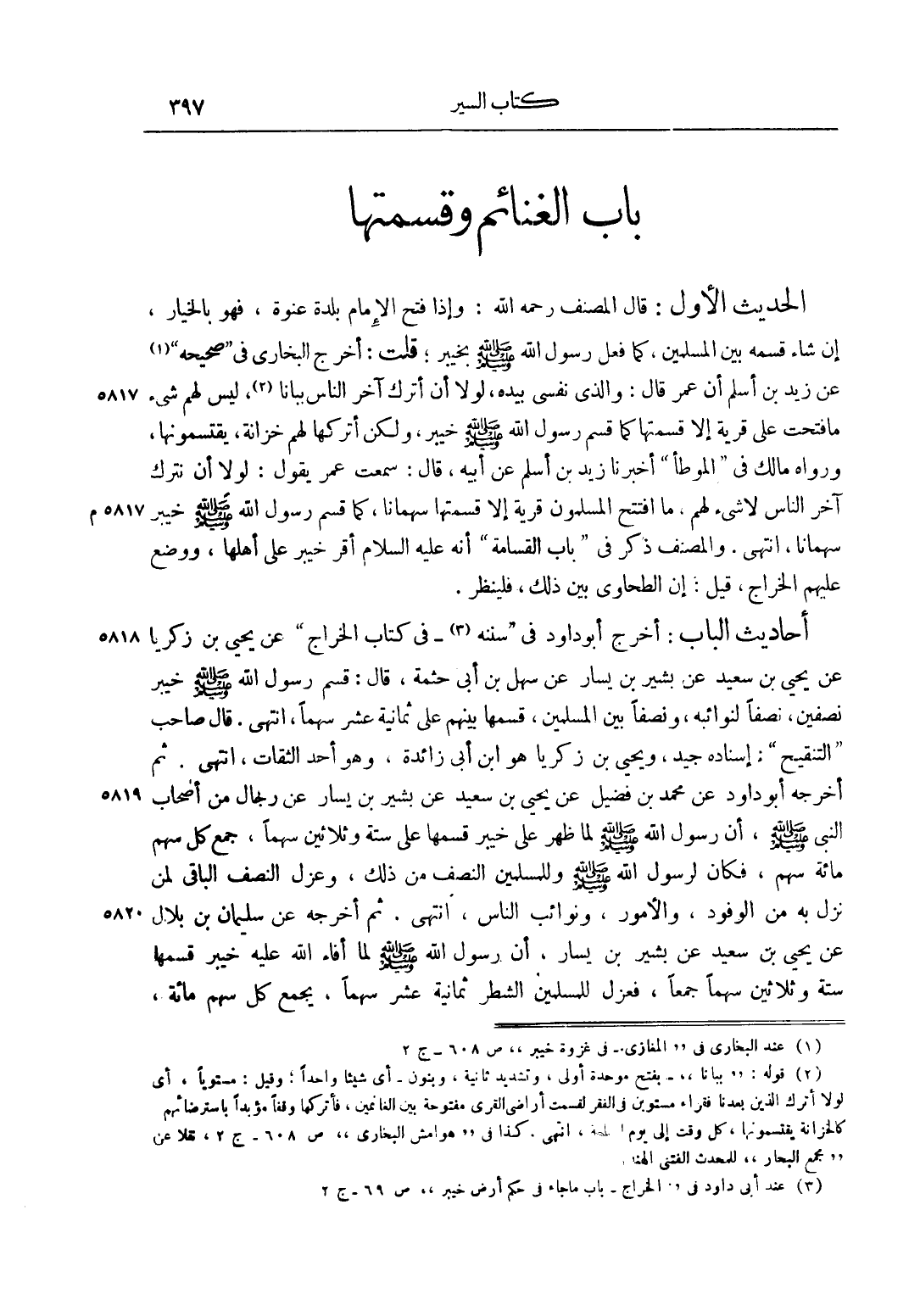أَحَادِيثُ الْبَابِ: أَخْرَجَ أَبُو دَاوُد فِي "سُنَنِهِ 3 - فِي كِتَابِ الْخَرَاجِ" عَنْ يَحْيَى بْنِ زَكَرِيَّا عَنْ يَحْيَى بْنِ سَعِيدٍ عَنْ بَشِيرِ بْنِ يَسَارٍ عَنْ سَهْلِ بْنِ أَبِي حَثْمَةَ، قَالَ: قَسَمَ رَسُولُ اللَّهِ صَلَّى اللَّهُ عَلَيْهِ وَسَلَّمَ خَيْبَرَ نِصْفَيْنِ، نِصْفًا لِنَوَائِبِهِ، وَنِصْفًا بَيْنَ الْمُسْلِمِينَ، قَسَمَهَا بَيْنَهُمْ عَلَى ثَمَانِيَةَ عَشَرَ سَهْمًا، انْتَهَى. قَالَ صَاحِبُ "التَّنْقِيحِ": إسْنَادُهُ جَيِّدٌ، وَيَحْيَى بْنُ زَكَرِيَّا هُوَ ابْنُ أَبِي زَائِدَةَ، وَهُوَ أَحَدُ الثِّقَاتِ، انْتَهَى. ثُمَّ أَخْرَجَهُ أَبُو دَاوُد عَنْ مُحَمَّدِ بْنِ فُضَيْلٍ عَنْ يَحْيَى بْنِ سَعِيدٍ عَنْ بَشِيرِ بْنِ يَسَارٍ عَنْ رِجَالٍ مِنْ أَصْحَابِ النَّبِيِّ صَلَّى اللَّهُ عَلَيْهِ وَسَلَّمَ، أَنَّ رَسُولَ اللَّهِ صَلَّى اللَّهُ عَلَيْهِ وَسَلَّمَ لَمَّا ظَهَرَ عَلَى خَيْبَرَ قَسَمَهَا عَلَى سِتَّةٍ وَثَلَاثِينَ سَهْمًا، جَمْعُ كُلِّ منهم مِائَةُ سَهْمٍ، فَكَانَ لِرَسُولِ اللَّهِ صَلَّى اللَّهُ عَلَيْهِ وَسَلَّمَ وَلِلْمُسْلِمِينَ النِّصْفُ مِنْ ذَلِكَ، وَعَزَلَ النِّصْفَ الْبَاقِيَ لِمَنْ نَزَلَ بِهِ مِنْ الْوُفُودِ، وَالْأُمُورِ، وَنَوَائِبِ النَّاسِ، انْتَهَى. ثُمَّ أَخْرَجَهُ عَنْ سُلَيْمَانَ بْنِ بِلَالٍ عَنْ يَحْيَى بْنِ سَعِيدٍ عَنْ بَشِيرِ بْنِ يَسَارٍ، أَنَّ رَسُولَ اللَّهِ صَلَّى اللَّهُ عَلَيْهِ وَسَلَّمَ لَمَّا أَفَاءَ اللَّهُ عَلَيْهِ خَيْبَرَ قَسَمَهَا سِتَّةً وَثَلَاثِينَ سَهْمًا جَمْعًا، فَعَزَلَ لِلْمُسْلِمِينَ الشَّطْرَ ثَمَانِيَةَ عَشَرَ سَهْمًا، يَجْمَعُ كُلُّ سَهْمٍ مِائَةً،
