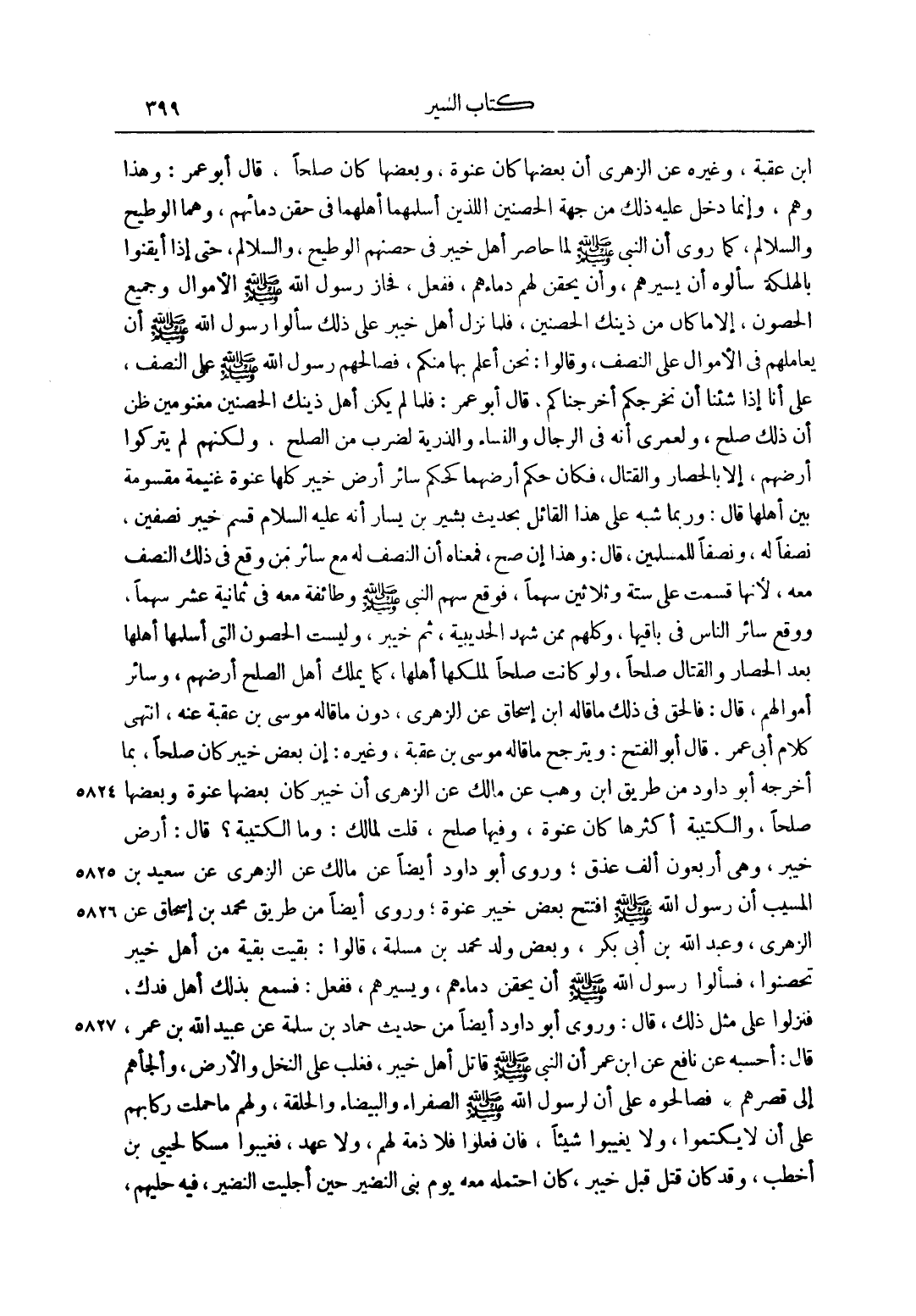 بْنُ عُقْبَةَ، وَغَيْرُهُ عَنْ الزُّهْرِيِّ أَنَّ بَعْضَهَا كَانَ عَنْوَةً، وَبَعْضَهَا كَانَ صُلْحًا، قَالَ أَبُو عُمَرَ: وَهَذَا وَهْمٌ، وَإِنَّمَا دَخَلَ عَلَيْهِ ذَلِكَ مِنْ جِهَةِ الْحِصْنَيْنِ اللَّذَيْنِ أَسْلَمَهُمَا أَهْلَهُمَا فِي حَقْنِ دِمَائِهِمْ، وَهُمَا الْوَطِيحُ وَالسَّلَالِمُ، كَمَا رُوِيَ أَنَّ النَّبِيَّ صَلَّى اللَّهُ عَلَيْهِ وَسَلَّمَ لَمَّا حَاصَرَ أَهْلَ خَيْبَرَ فِي حِصْنِهِمْ الْوَطِيحِ، وَالسَّلَالِمِ، حَتَّى إذَا أَيْقَنُوا بِالْهَلَكَةِ سَأَلُوهُ أَنْ يُسَيِّرَهُمْ، وَأَنْ يَحْقِنَ لَهُمْ دِمَاءَهُمْ، فَفَعَلَ، فَحَازَ رَسُولُ اللَّهِ صَلَّى اللَّهُ عَلَيْهِ وَسَلَّمَ الْأَمْوَالَ وجمع الْحُصُونِ، إلَّا مَا كَانَ مِنْ ذَيْنِك الْحِصْنَيْنِ، فَلَمَّا نَزَلَ أَهْلُ خَيْبَرَ عَلَى ذَلِكَ سَأَلُوا رَسُولَ اللَّهِ صَلَّى اللَّهُ عَلَيْهِ وَسَلَّمَ أَنْ يُعَامِلَهُمْ فِي الْأَمْوَالِ عَلَى النِّصْفِ، وَقَالُوا: نَحْنُ أَعْلَمُ بِهَا مِنْكُمْ، فَصَالَحَهُمْ رَسُولُ اللَّهِ صَلَّى اللَّهُ عَلَيْهِ وَسَلَّمَ عَلَى النِّصْفِ، عَلَى أَنَّا إذَا شِئْنَا أَنْ نُخْرِجَكُمْ أَخْرَجْنَاكُمْ، قَالَ أَبُو عُمَرَ: فَلَمَّا لَمْ يَكُنْ أَهْلُ ذَيْنِك الْحِصْنَيْنِ مَغْنُومَيْنِ ظُنَّ أَنَّ ذَلِكَ صُلْحٌ، وَلَعَمْرِي إنَّهُ فِي الرِّجَالِ وَالنِّسَاءِ وَالذُّرِّيَّةِ لَضَرْبٌ مِنْ الصُّلْحِ، وَلَكِنَّهُمْ لَمْ يَتْرُكُوا أَرْضَهُمْ، إلَّا بِالْحِصَارِ وَالْقِتَالِ، فَكَانَ حُكْمُ أَرْضِهِمَا كَحُكْمِ سَائِرِ أَرْضِ خَيْبَرَ كُلِّهَا عَنْوَةً غَنِيمَةً مَقْسُومَةً بَيْنَ أَهْلِهَا قَالَ وَرُبَّمَا شُبِّهَ عَلَى هَذَا الْقَائِلُ بِحَدِيثِ بَشِيرِ بْنِ يَسَارٍ أَنَّهُ عليه السلام قَسَمَ خَيْبَرَ نِصْفَيْنِ، نِصْفًا لَهُ، وَنِصْفًا لِلْمُسْلِمِينَ، قَالَ: وَهَذَا إنْ صَحَّ، فَمَعْنَاهُ أَنَّ النِّصْفَ لَهُ مَعَ سَائِرِ مَنْ وَقَعَ فِي ذَلِكَ النِّصْفِ مَعَهُ، لِأَنَّهَا قُسِمَتْ عَلَى سِتَّةٍ وَثَلَاثِينَ سَهْمًا، فَوَقَعَ سَهْمُ النَّبِيِّ صَلَّى اللَّهُ عَلَيْهِ وَسَلَّمَ وَطَائِفَةٍ مَعَهُ فِي ثَمَانِيَةَ عَشَرَ سَهْمًا، وَوَقَعَ سَائِرُ النَّاسِ فِي بَاقِيهَا، وَكُلُّهُمْ مِمَّنْ شَهِدَ الْحُدَيْبِيَةَ، ثُمَّ خَيْبَرَ، وَلَيْسَتْ الْحُصُونُ الَّتِي أَسْلَمَهَا أَهْلُهَا بَعْدَ الْحِصَارِ وَالْقِتَالِ صُلْحًا، وَلَوْ كَانَتْ صُلْحًا لَمَلَكَهَا أَهْلُهَا، كَمَا يَمْلِكُ أَهْلُ الصُّلْحِ أَرْضَهُمْ، وَسَائِرَ أَمْوَالِهِمْ، قَالَ: فَالْحَقُّ فِي ذَلِكَ مَا قَالَهُ ابْنُ إسْحَاقَ عَنْ الزُّهْرِيِّ، دُونَ مَا قَالَهُ مُوسَى بْنُ عُقْبَةَ عَنْهُ، انْتَهَى كَلَامُ أَبِي عُمَرَ. قَالَ أَبُو الْفَتْحِ: وَيَتَرَجَّحُ مَا قَالَهُ مُوسَى بْنُ عُقْبَةَ، وَغَيْرُهُ: إنَّ بَعْضَ خَيْبَرَ كَانَ صُلْحًا، بِمَا أَخْرَجَهُ أَبُو دَاوُد مِنْ طَرِيقِ ابْنِ وَهْبٍ عَنْ مَالِكٍ عَنْ الزُّهْرِيِّ أَنَّ خَيْبَرَ كَانَ بَعْضُهَا عَنْوَةً وَبَعْضُهَا صُلْحًا، وَالْكَتِيبَةُ أَكْثَرُهَا كَانَ عَنْوَةً، وَفِيهَا صُلْحٌ، قُلْت لِمَالِكٍ: وَمَا الْكَتِيبَةُ؟ قَالَ: أَرْضُ خَيْبَرَ، وَهِيَ أَرْبَعُونَ أَلْفَ عِذْقٍ، وَرَوَى أَبُو دَاوُد أَيْضًا عَنْ مَالِكٍ عَنْ الزُّهْرِيِّ عَنْ سَعِيدِ بْنِ الْمُسَيِّبِ أَنَّ رَسُولَ اللَّهِ صَلَّى اللَّهُ عَلَيْهِ وَسَلَّمَ افتتح بَعْضَ خَيْبَرَ عَنْوَةً، وَرُوِيَ أَيْضًا مِنْ طَرِيقِ مُحَمَّدِ بْنِ إسْحَاقَ عَنْ الزُّهْرِيِّ، وَعَبْدِ اللَّهِ بْنِ أَبِي بَكْرٍ، وَبَعْضِ وَلَدِ مُحَمَّدِ بْنِ مَسْلَمَةً، قَالُوا: بَقِيَتْ بَقِيَّةٌ مِنْ أَهْلِ خَيْبَرَ تَحَصَّنُوا، فَسَأَلُوا رَسُولَ اللَّهِ صَلَّى اللَّهُ عَلَيْهِ وَسَ