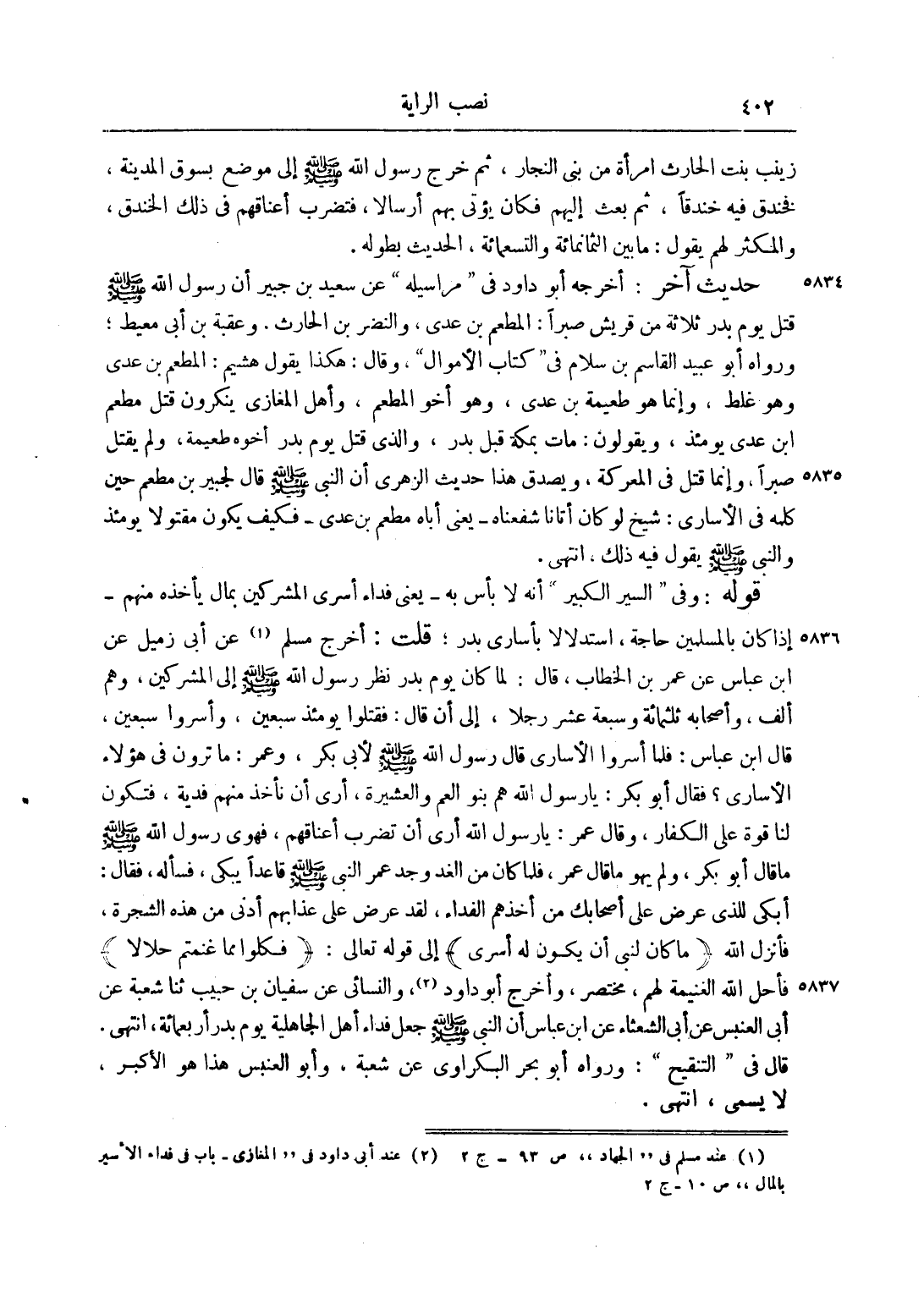 حَدِيثٌ آخَرُ: أَخْرَجَهُ أَبُو دَاوُد فِي "مَرَاسِيلِهِ" عَنْ سَعِيدِ بْنِ جُبَيْرٍ أَنَّ رَسُولَ اللَّهِ صَلَّى اللَّهُ عَلَيْهِ وَسَلَّمَ قَتَلَ يَوْمَ بَدْرٍ ثَلَاثَةً مِنْ قُرَيْشٍ صَبْرًا: الْمُطْعِمَ بْنَ عَدِيٍّ، وَالنَّضْرَ بْنَ الْحَارِثِ، وَعُقْبَةَ بْنَ أَبِي مُعَيْطٍ، وَرَوَاهُ أَبُو عُبَيْدٍ الْقَاسِمُ بْنُ سَلَّامٍ فِي "كِتَابِ الْأَمْوَالِ"، وَقَالَ: هَكَذَا يَقُولُ هُشَيْمِ: الْمُطْعِمُ بْنُ عَدِيٍّ وَهُوَ غَلَطٌ، وَإِنَّمَا هُوَ طُعَيْمَةُ بْنُ عَدِيٍّ، وَهُوَ أَخُو الْمُطْعِمِ، وَأَهْلُ الْمَغَازِي يُنْكِرُونَ قَتْلَ مُطْعِمِ بْنِ عَدِيٍّ يَوْمَئِذٍ، وَيَقُولُونَ: مَاتَ بِمَكَّةَ قَبْلَ بَدْرٍ، وَاَلَّذِي قُتِلَ يَوْمَ بَدْرٍ أَخُو طُعَيْمَةَ، وَلَمْ يُقْتَلْ صَبْرًا، وَإِنَّمَا قُتِلَ فِي الْمَعْرَكَةِ، ويصدق هذا الحديث الزُّهْرِيِّ أَنَّ النَّبِيَّ صَلَّى اللَّهُ عَلَيْهِ وَسَلَّمَ قَالَ لِجُبَيْرِ بْنِ مُطْعِمٍ حِينَ كَلَّمَهُ فِي الْأُسَارَى: "شَيْخٌ لَوْ كَانَ أَتَانَا شَفَّعْنَاهُ" - يَعْنِي أَبَاهُ مُطْعِمَ بْنَ عَدِيٍّ - فَكَيْفَ يَكُونُ مَقْتُولًا يَوْمَئِذٍ وَالنَّبِيُّ صَلَّى اللَّهُ عَلَيْهِ وَسَلَّمَ يَقُولُ فِيهِ ذَلِكَ، انْتَهَى.
