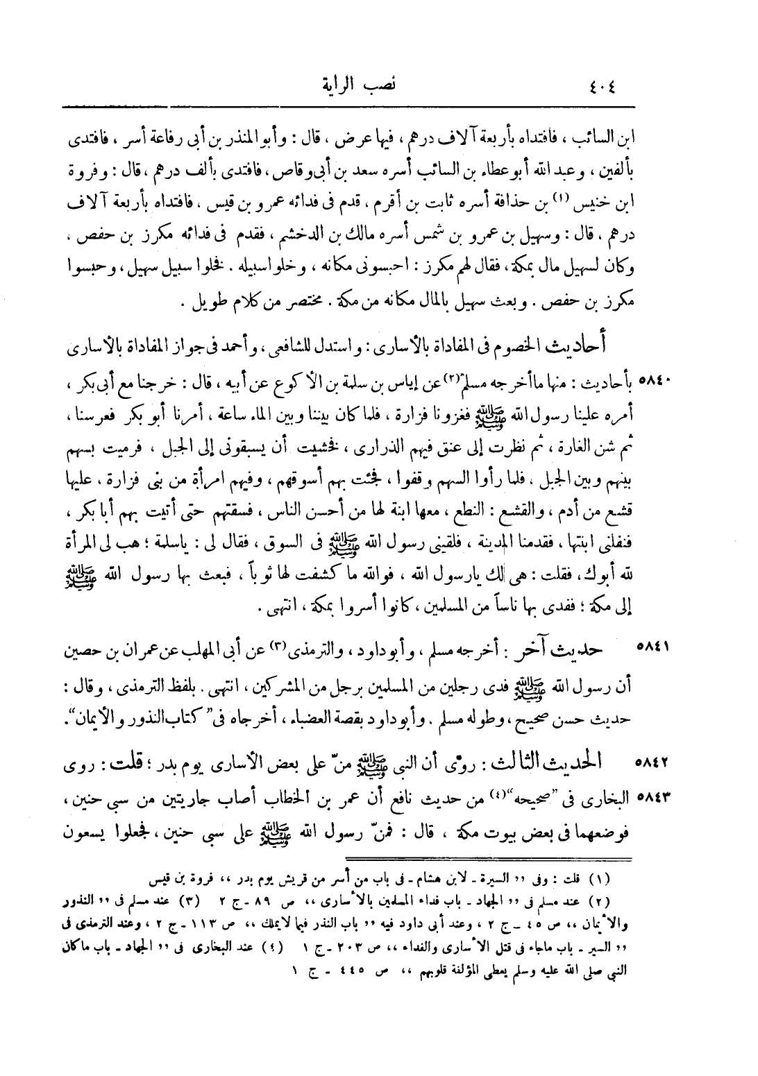 أَحَادِيثُ الْخُصُومِ فِي الْمُفَادَاةِ بِالْأُسَارَى: وَاسْتُدِلَّ لِلشَّافِعِيِّ، وَأَحْمَدَ فِي جَوَازِ الْمُفَادَاةِ بِالْأَسَارَى بِأَحَادِيثَ: مِنْهَا مَا أَخْرَجَهُ مُسْلِمٌ 2 عَنْ إيَاسِ بْنِ سَلَمَةَ بْنِ الْأَكْوَعِ عَنْ أَبِيهِ، قَالَ: خَرَجْنَا مَعَ أَبِي بَكْرٍ، أَمَّرَهُ عَلَيْنَا رَسُولُ اللَّهِ صَلَّى اللَّهُ عَلَيْهِ وَسَلَّمَ فَغَزَوْنَا فَزَارَةَ، فَلَمَّا كَانَ بَيْنَنَا وَبَيْنَ الْمَاءِ سَاعَةٌ، أَمَرَنَا أَبُو بَكْرٍ فَعَرَّسْنَا، ثُمَّ شَنَّ الْغَارَةَ، ثُمَّ نَظَرْت إلَى عُنُقٍ فِيهِمْ الذَّرَارِيُّ، فَخَشِيتُ أَنْ يَسْبِقُونِي إلَى الْجَبَلِ، فَرَمَيْتُ بِسَهْمٍ بَيْنَهُمْ وَبَيْنَ الْجَبَلِ، فَلَمَّا رَأَوْا السَّهْمَ وَقَفُوا، فَجِئْتُ بِهِمْ أَسُوقُهُمْ، وَفِيهِمْ امْرَأَةٌ مِنْ بَنِي فَزَارَةَ، عَلَيْهَا قَشْعٌ مِنْ أُدْمٍ، وَالْقَشْعُ: النِّطَعُ، مَعَهَا ابْنَةٌ لَهَا مِنْ أَحْسَنِ النَّاسِ، فَسُقْتُهُمْ حَتَّى أَتَيْت بِهِمْ أَبَا بَكْرٍ، فَنَفَّلَنِي ابْنَتَهَا، فَقَدِمْنَا الْمَدِينَةَ، فَلَقِيَنِي رَسُولُ اللَّهِ صَلَّى اللَّهُ عَلَيْهِ وَسَلَّمَ فِي السُّوقِ، فَقَالَ لِي: " يَا سَلَمَةَ، هَبْ لِي الْمَرْأَةَ لِلَّهِ أَبُوك"، فَقُلْتُ: هِيَ لَك يَا رَسُولَ اللَّهِ، فَوَاَللَّهِ مَا كَشَفْتُ لَهَا ثَوْبًا، فَبَعَثَ بِهَا رَسُولُ اللَّهِ صَلَّى اللَّهُ عَلَيْهِ وَسَلَّمَ إلَى مَكَّةَ، فَفَدَى بِهَا نَاسًا مِنْ الْمُسْلِمِينَ، كَانُوا أُسِرُوا بِمَكَّةَ، انْتَهَى.