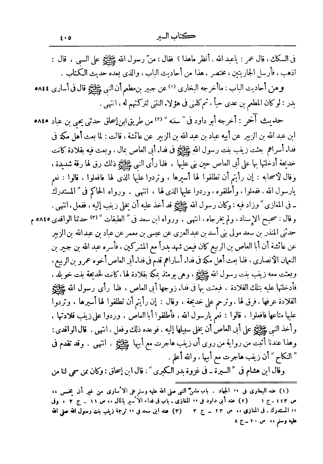 حَدِيثٌ آخَرُ: أَخْرَجَهُ أَبُو دَاوُد فِي "سُنَنِهِ"2 مِنْ طَرِيقِ ابْنِ إسْحَاقَ حَدَّثَنِي يَحْيَى بْنُ عَبَّادِ بْنِ عَبْدِ اللَّهِ بْنِ الزُّبَيْرِ عَنْ أَبِيهِ عَبَّادِ بْنِ عَبْدِ اللَّهِ بْنِ الزُّبَيْرِ عَنْ عَائِشَةَ، قَالَتْ: لَمَّا بَعَثَ أَهْلُ مَكَّةَ فِي فِدَاءِ أَسْرَاهُمْ بَعَثَتْ زَيْنَبُ بِنْتُ رَسُولِ اللَّهِ صَلَّى اللَّهُ عَلَيْهِ وَسَلَّمَ فِي فِدَاءِ أَبِي الْعَاصِ بِمَالٍ، وَبَعَثَ فِيهِ بِقِلَادَةٍ كَانَتْ خَدِيجَةُ أَدْخَلَتْهَا بِهَا عَلَى أَبِي الْعَاصِ حِينَ بَنَى عَلَيْهَا، فَلَمَّا رَأَى النَّبِيُّ صَلَّى اللَّهُ عَلَيْهِ وَسَلَّمَ ذَلِكَ رَقَّ لَهَا رِقَّةً شَدِيدَةً، وَقَالَ لِأَصْحَابِهِ: " إنْ رَأَيْتُمْ أَنْ تُطْلِقُوا لَهَا أَسِيرَهَا، وَتَرُدُّوا عَلَيْهَا الَّذِي لَهَا فَافْعَلُوا"، قَالُوا: نَعَمْ يَا رَسُولَ اللَّهِ، فَفَعَلُوا، وَأَطْلَقُوهُ، وَرَدُّوا عَلَيْهَا الَّذِي لَهَا، انْتَهَى. وَرَوَاهُ الْحَاكِمُ فِي "الْمُسْتَدْرَكِ - فِي الْمَغَازِي" وَزَادَ فِيهِ: وَكَانَ رَسُولُ اللَّهِ صَلَّى اللَّهُ عَلَيْهِ وَسَلَّمَ قَدْ أَخَذَ عَلَيْهِ أَنْ يُخَلِّيَ زَيْنَبَ إلَيْهِ، فَفَعَلَ، انْتَهَى. وَقَالَ: صَحِيحُ الْإِسْنَادِ، وَلَمْ يُخَرِّجَاهُ، انْتَهَى. وَرَوَاهُ ابْنُ سَعْدٍ فِي "الطَّبَقَاتِ"3 حَدَّثَنَا الْوَاقِدِيُّ حَدَّثَنِي الْمُنْذِرُ بْنُ سَعْدٍ مَوْلَى بَنِي أَسَدِ بْنِ عَبْدِ الْعُزَّى عَنْ عِيسَى بْنِ مَعْمَرٍ عَنْ عَبَّادِ بْنِ عَبْدِ اللَّهِ بْنِ الزُّبَيْرِ عَنْ عَائِشَةَ أَنَّ أَبَا الْعَاصِ بْنَ الرَّبِيعِ كَانَ فِيمَنْ شَهِدَ بَدْرًا مَعَ الْمُشْرِكِينَ، فَأَسَرَهُ عَبْدُ اللَّهِ بْنُ جُبَيْرِ بْنِ النُّعْمَانِ الْأَنْصَارِيُّ، فَلَمَّا بَعَثَ أَهْلُ مَكَّةَ فِي فِدَاءِ أَسَارَاهُمْ قَدِمَ فِي فِدَاءِ أَبِي الْعَاصِ أَخُوهُ عَمْرُو بْنُ الرَّبِيعِ، وَبَعَثَتْ مَعَهُ زَيْنَبُ بِنْتُ رَسُولِ اللَّهِ صَلَّى اللَّهُ عَلَيْهِ وَسَلَّمَ، وَهِيَ يَوْمَئِذٍ بِمَكَّةَ بِقِلَادَةٍ لَهَا، كَانَتْ لِخَدِيجَةَ بِنْتِ خُوَيْلِدٍ، فَأَدْخَلَتْهَا عَلَيْهِ بِتِلْكَ الْقِلَادَةِ، فَبَعَثَتْ بِهَا فِي فِدَاءِ زَوْجِهَا أَبِي الْعَاصِ، فَلَمَّا رَأَى رَسُولُ اللَّهِ صَلَّى اللَّهُ عَلَيْهِ وَسَلَّمَ الْقِلَادَةَ عَرَفَهَا، فَرَّقَ لَهَا، وَتَرَحَّمَ عَلَى خَدِيجَةَ، وَقَالَ: " إنْ رَأَيْتُمْ أَنْ تُطْلِقُوا لَهَا أَسِيرَهَا، وَتَرُدُّوا عَلَيْهَا مَتَاعَهَا فَافْعَلُوا"، قَالُوا: نَعَمْ يَا رَسُولَ اللَّهِ، فَأَطْلَقُوا أَبَا الْعَاصِ، وَرَدُّوا عَلَى زَيْنَبَ قِلَادَتَهَا، وَأَخَذَ النَّبِيُّ صَلَّى اللَّهُ عَلَيْهِ وَسَلَّمَ عَلَى أَبِي الْعَاصِ أَنْ يُخَلِّيَ سَبِيلَهَا إلَيْهِ، فَوَعَدَهُ ذَلِكَ وَفَعَلَ، انْتَهَى. قَالَ الْوَاقِدِيُّ: وَهَذَا عِنْدَنَا أَثْبَتُ مِنْ رِوَايَةِ مَنْ رَوَى أَنَّ زَيْنَبَ هَاجَرَتْ مَعَ أَبِيهَا صَلَّى اللَّهُ عَلَيْهِ وَسَلَّمَ، انْتَهَى. وَقَدْ تَقَدَّمَ فِي "النِّكَاحِ" أَنَّ زَيْنَبَ هَاجَرَتْ مَعَ أَبِيهَا، وَاَللَّهُ أَعْلَمُ.