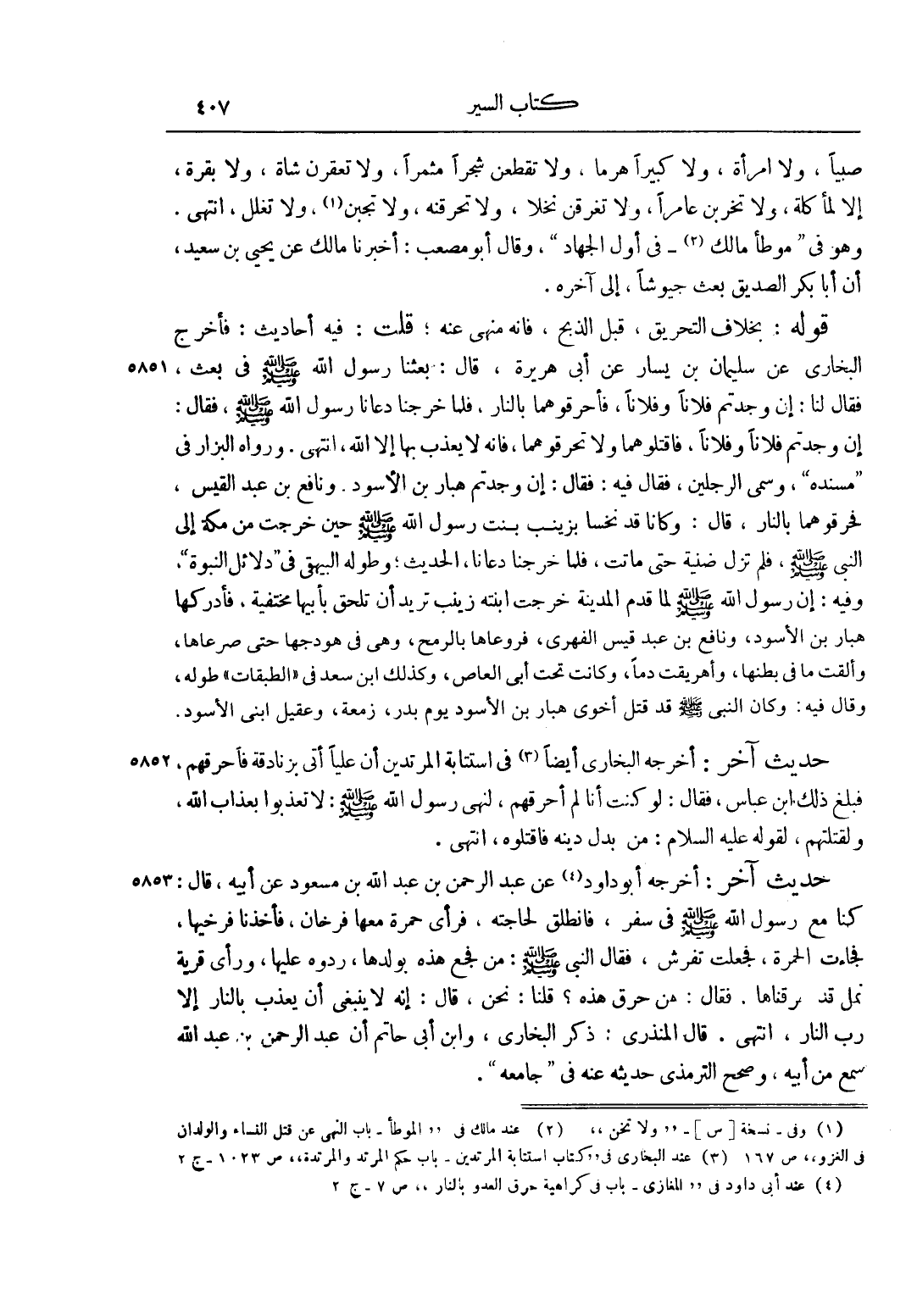 قَوْلُهُ: بِخِلَافِ التَّحْرِيقِ، قَبْلَ الذَّبْحِ، فَإِنَّهُ مَنْهِيٌّ عَنْهُ، قُلْت: فِيهِ أَحَادِيثُ: فَأَخْرَجَ الْبُخَارِيُّ عَنْ سُلَيْمَانَ بْنِ يَسَارٍ عَنْ أَبِي هُرَيْرَةَ، قَالَ: بَعَثَنَا رَسُولُ اللَّهِ صَلَّى اللَّهُ عَلَيْهِ وَسَلَّمَ فِي بَعْثٍ، فَقَالَ لَنَا: " إنْ وَجَدْتُمْ فُلَانًا وَفُلَانًا، فَأَحْرِقُوهُمَا بِالنَّارِ"، فَلَمَّا خَرَجْنَا دَعَانَا رَسُولُ اللَّهِ صَلَّى اللَّهُ عَلَيْهِ وَسَلَّمَ، فَقَالَ: " إنْ وَجَدْتُمْ فُلَانًا وَفُلَانًا، فَاقْتُلُوهُمَا وَلَا تَحْرِقُوهُمَا، فَإِنَّهُ لَا يُعَذِّبُ بِهَا إلَّا اللَّهُ"، انْتَهَى. وَرَوَاهُ الْبَزَّارُ فِي "مُسْنَدِهِ"، وَسَمَّى الرَّجُلَيْنِ، فَقَالَ فِيهِ: فَقَالَ: "إنْ وَجَدْتُمْ هَبَّارَ بْنَ الْأَسْوَدِ. وَنَافِعَ بْنَ عَبْدِ الْقَيْسِ، فَحَرِّقُوهُمَا بِالنَّارِ"، قَالَ: وَكَانَا قَدْ نَخَسَا بِزَيْنَبِ بِنْتِ رَسُولِ اللَّهِ صَلَّى اللَّهُ عَلَيْهِ وَسَلَّمَ حِينَ خَرَجَتْ مِنْ مَكَّةَ إلَى النَّبِيِّ صَلَّى اللَّهُ عَلَيْهِ وَسَلَّمَ، فَلَمْ تَزَلْ ضَنِيَّةً حَتَّى مَاتَتْ، فَلَمَّا خَرَجْنَا دَعَانَا، الْحَدِيثَ، وَطَوَّلَهُ الْبَيْهَقِيُّ فِي "دَلَائِلِ النُّبُوَّةِ"، وَفِيهِ: إنَّ رَسُولَ اللَّهِ صَلَّى اللَّهُ عَلَيْهِ وَسَلَّمَ لَمَّا قَدِمَ الْمَدِينَةَ خَرَجَتْ ابْنَتُهُ زَيْنَبُ تُرِيدُ أَنْ تَلْحَقَ بِأَبِيهَا مُخْتَفِيَةً، فَأَدْرَكَهَا هَبَّارُ بْنُ الْأَسْوَدِ، وَنَافِعُ بْنُ قَيْسٍ الْفِهْرِيُّ، فَرَوَّعَاهَا بِالرُّمْحِ، وَهِيَ فِي هَوْدَجِهَا حَتَّى صَرَعَاهَا، وَأَلْقَتْ مَا فِي بَطْنِهَا، وَأُهْرِيقَتْ دَمًا، وَكَانَتْ تَحْتَ أَبِي الْعَاصِ، وَكَذَلِكَ ابْنُ سَعْدٍ فِي "الطَّبَقَاتِ" طَوَّلَهُ، وَقَالَ فِيهِ: وَكَانَ النَّبِيُّ صَلَّى اللَّهُ عَلَيْهِ وَسَلَّمَ قَدْ قَتَلَ أَخَوَيْ هَبَّارِ بْنِ الْأَسْوَدِ يَوْمَ بَدْرٍ، زَمْعَةَ، وَعَقِيلَ ابْنَيْ الْأَسْوَدِ.