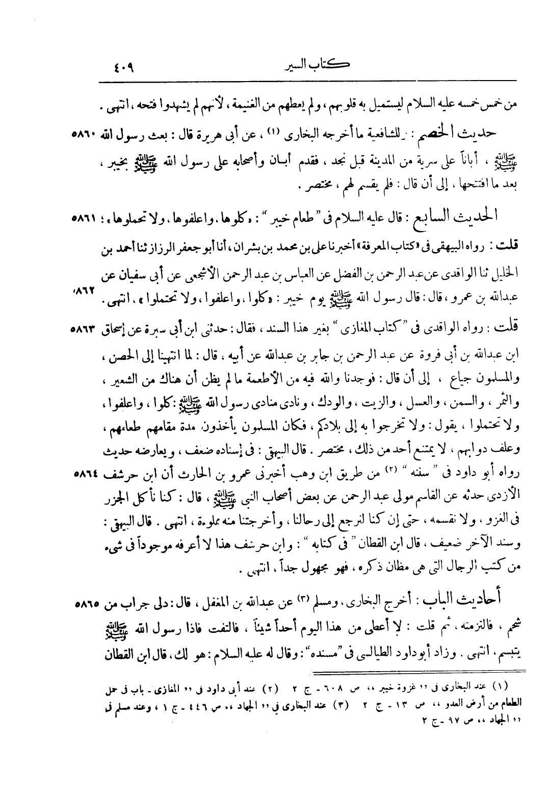 الْحَدِيثُ السَّابِعُ: قَالَ عليه السلام فِي طَعَامِ خَيْبَرَ: "كُلُوهَا، وَاعْلِفُوهَا، وَلَا تَحْمِلُوهَا"،قُلْت: رَوَاهُ الْبَيْهَقِيُّ فِي "كِتَابِ الْمَعْرِفَةِ" أَخْبَرَنَا عَلِيُّ بْنُ مُحَمَّدِ بْنِ بِشْرٍ، أَنَا أَبُو جَعْفَرٍ الرَّزَّازُ ثَنَا أَحْمَدُ بْنُ الْخَلِيلِ ثَنَا الْوَاقِدِيُّ عَنْ عَبْدِ الرَّحْمَنِ بْنِ الْفَضْلِ عَنْ الْعَبَّاسِ بْنِ عَبْدِ الرَّحْمَنِ الْأَشْجَعِيِّ عَنْ أَبِي سُفْيَانَ عَنْ عَبْدِ اللَّهِ بْنِ عَمْرٍو، قَالَ: قَالَ رَسُولُ اللَّهِ صَلَّى اللَّهُ عَلَيْهِ وَسَلَّمَ يَوْمَ خَيْبَرَ: "كُلُوا، وَاعْلِفُوا، وَلَا تَحْتَمِلُوا"، انْتَهَى. قُلْت: رَوَاهُ الْوَاقِدِيُّ فِي "كِتَابِ الْمَغَازِي" بِغَيْرِ هَذَا السَّنَدِ، فَقَالَ: حَدَّثَنِي ابْنُ أَبِي سَبْرَةَ عَنْ إسْحَاقَ بْنِ عَبْدِ اللَّهِ بْنِ أَبِي فَرْوَةَ عَنْ عَبْدِ الرَّحْمَنِ بْنِ جَابِرِ بْنِ عَبْدِ اللَّهِ عَنْ أَبِيهِ، قَالَ: لَمَّا انْتَهَيْنَا إلَى الْحِصْنِ، وَالْمُسْلِمُونَ جِيَاعٌ، إلَى أَنْ قَالَ: فَوَجَدْنَا وَاَللَّهِ فِيهِ مِنْ الْأَطْعِمَةِ مَا لَمْ يَظُنَّ أَنَّ هُنَاكَ من الشعير، والثمر، وَالسَّمْنِ، وَالْعَسَلِ، وَالزَّيْتِ، وَالْوَدَكِ، وَنَادَى مُنَادِي رَسُولِ اللَّهِ صَلَّى اللَّهُ عَلَيْهِ وَسَلَّمَ: " كُلُوا، وَاعْلِفُوا، وَلَا تَحْتَمِلُوا"، يَقُولُ: وَلَا تَخْرُجُوا بِهِ إلَى بِلَادِكُمْ، فَكَانَ الْمُسْلِمُونَ يَأْخُذُونَ مُدَّةَ مَقَامِهِمْ طَعَامَهُمْ، وَعَلْفَ دَوَابِّهِمْ، لَا يَمْتَنِعُ أَحَدٌ مِنْ ذَلِكَ، مُخْتَصَرٌ، قَالَ الْبَيْهَقِيُّ: فِي إسْنَادِهِ ضَعْفٌ، وَيُعَارِضُهُ حَدِيثٌ رَوَاهُ أَبُو دَاوُد فِي "سُنَنِهِ" 2 مِنْ طَرِيقِ ابْنِ وَهْبٍ أَخْبَرَنِي عَمْرُو بْنُ الْحَارِثِ أَنَّ ابْنَ حَرْشَفٍ الْأَزْدِيَّ حَدَّثَهُ عَنْ الْقَاسِمِ مَوْلَى عَبْدِ الرَّحْمَنِ عَنْ بَعْضِ أَصْحَابِ النَّبِيِّ صَلَّى اللَّهُ عَلَيْهِ وَسَلَّمَ، قَالَ: كُنَّا نَأْكُلُ الْجَزَرَ فِي الْغَزْوِ، وَلَا نَقْسِمُهُ، حَتَّى إنْ كُنَّا لَنَرْجِعُ إلَى رِحَالِنَا، وَأَخْرِجَتُنَا مِنْهُ مَمْلُوءَةٌ، انْتَهَى. قَالَ الْبَيْهَقِيُّ: وَسَنَدُ الْآخَرِ ضَعِيفٌ، قَالَ ابْنُ الْقَطَّانِ "فِي كِتَابِهِ": وَابْنُ حَرْشَفٍ هَذَا لَا أَعْرِفُهُ مَوْجُودًا فِي شَيْءٍ مِنْ كُتُبِ الرِّجَالِ الَّتِي هِيَ مَظَانُّ ذِكْرِهِ، فَهُوَ مَجْهُولٌ جِدًّا، انْتَهَى.