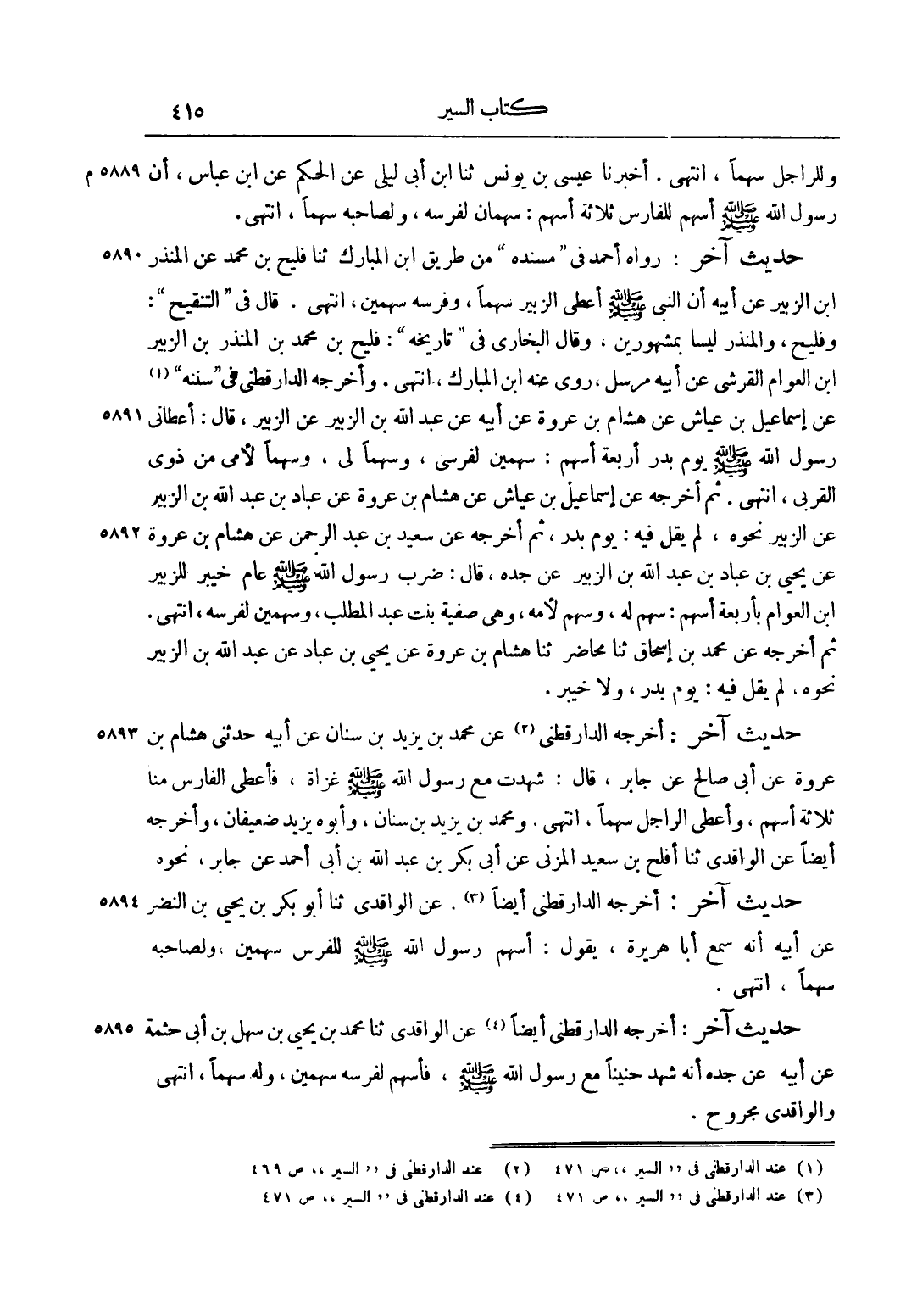 حَدِيثٌ آخَرُ: أَخْرَجَهُ الدَّارَقُطْنِيُّ أَيْضًا 4 عَنْ الْوَاقِدِيِّ ثَنَا مُحَمَّدُ بْنُ يَحْيَى بْنِ سَهْلِ بْنِ أَبِي حَثْمَةَ عَنْ أَبِيهِ عَنْ جَدِّهِ أَنَّهُ شَهِدَ حُنَيْنًا مَعَ رَسُولِ اللَّهِ صَلَّى اللَّهُ عَلَيْهِ وَسَلَّمَ، فَأَسْهَمَ لِفَرَسِهِ سَهْمَيْنِ، وَلَهُ سَهْمًا، انْتَهَى. وَالْوَاقِدِيُّ مَجْرُوحٌ.