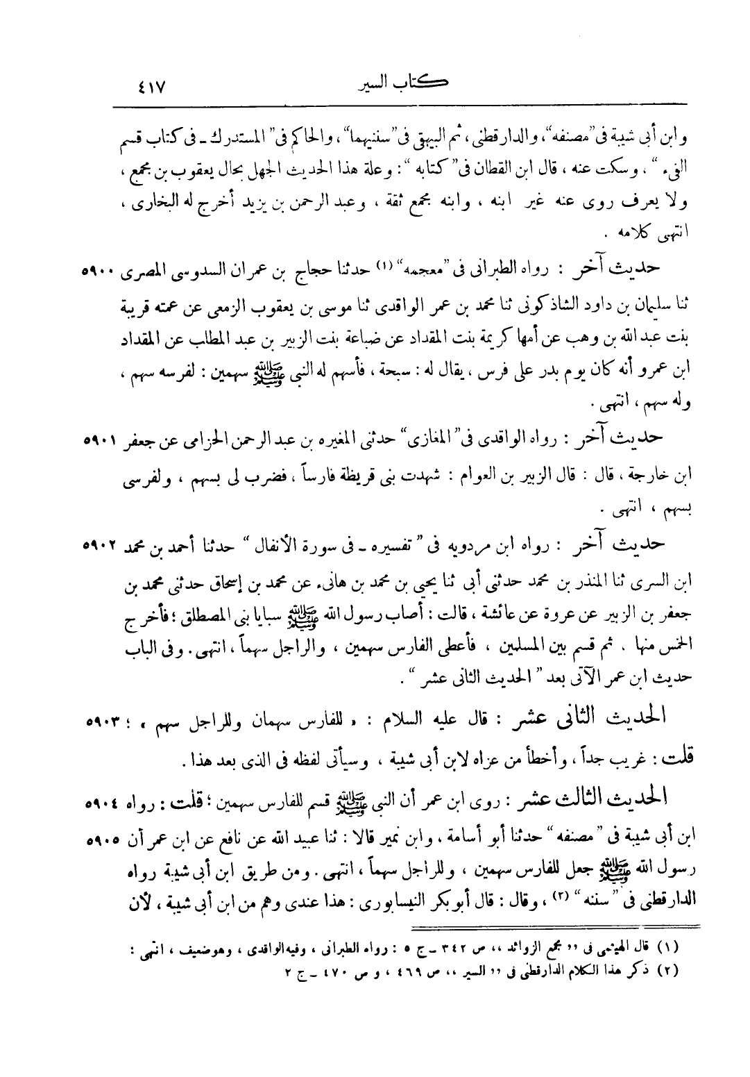 حَدِيثٌ آخَرُ: رَوَاهُ الطَّبَرَانِيُّ فِي "مُعْجَمِهِ"1 حَدَّثَنَا حَجَّاجُ بْنُ عِمْرَانَ السَّدُوسِيُّ الْمِصْرِيُّ ثَنَا سُلَيْمَانُ بْنُ دَاوُد الشَّاذَكُونِيُّ ثَنَا مُحَمَّدُ بْنُ عُمَرَ الْوَاقِدِيُّ ثَنَا مُوسَى بْنُ يَعْقُوبَ الزَّمْعِيُّ عَنْ عَمَّتِهِ قُرَيْبَةَ بِنْتِ عَبْدِ اللَّهِ بْنِ وَهْبٍ عَنْ أُمِّهَا كَرِيمَةَ بِنْتِ الْمِقْدَادِ عَنْ ضُبَاعَةَ بِنْتِ الزُّبَيْرِ بْنِ عَبْدِ الْمُطَّلِبِ عَنْ الْمِقْدَادِ بْنِ عَمْرٍو أَنَّهُ كَانَ يَوْمَ بَدْرٍ عَلَى فَرَسٍ، يُقَالُ لَهُ: سُبْحَةٌ، فَأَسْهَمَ لَهُ النَّبِيُّ صَلَّى اللَّهُ عَلَيْهِ وَسَلَّمَ سَهْمَيْنِ: لِفَرَسِهِ سَهْمٌ، وَلَهُ سَهْمٌ، انْتَهَى.