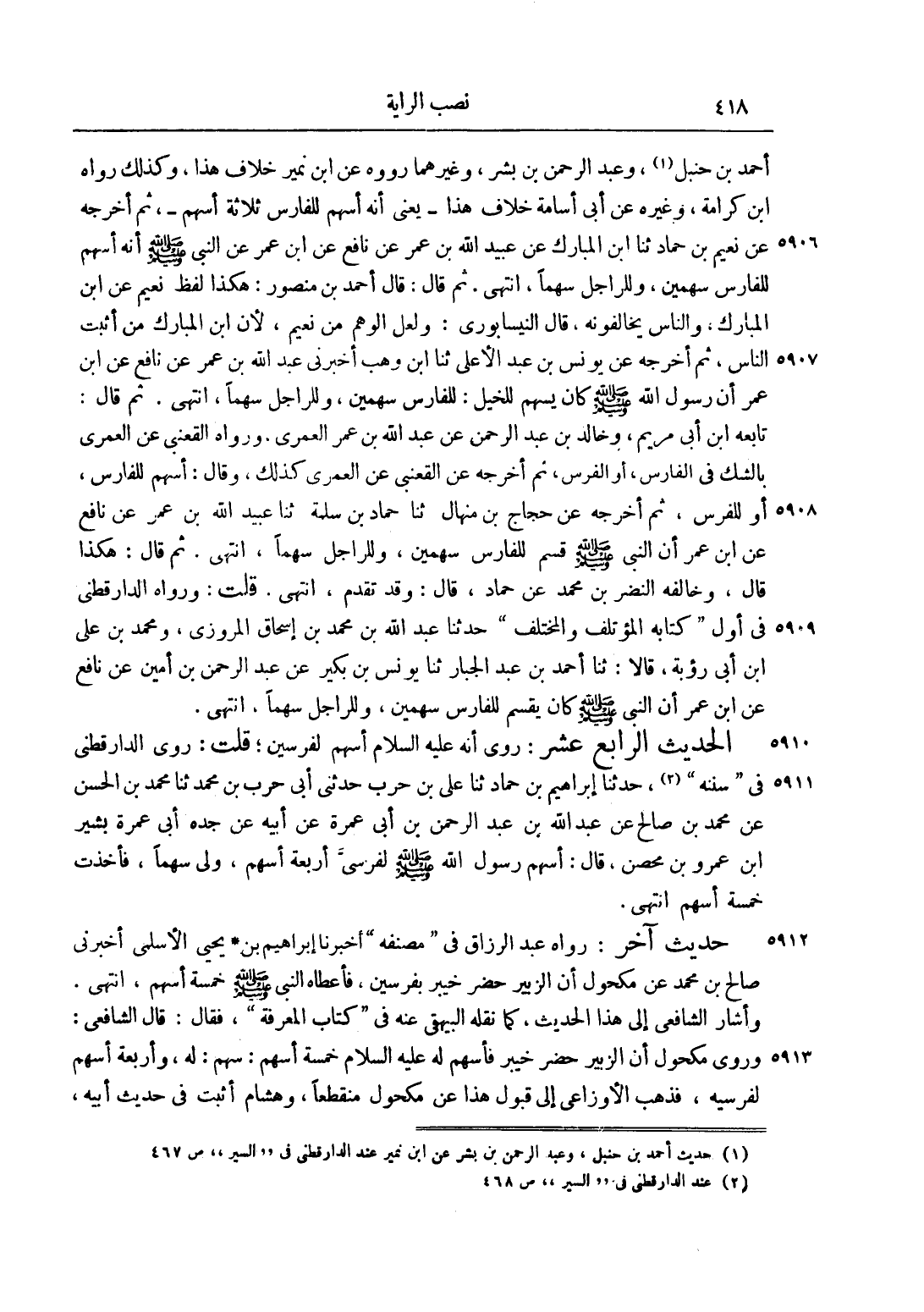 أَحْمَدَ بْنَ حَنْبَلٍ1، وَعَبْدَ الرَّحْمَنِ بْنَ بِشْرٍ، وَغَيْرَهُمَا رَوَوْهُ عَنْ ابْنِ نُمَيْرٍ خِلَافَ هَذَا، وَكَذَلِكَ رَوَاهُ ابْنُ كَرَامَةَ، وَغَيْرُهُ عَنْ أَبِي أُسَامَةَ خِلَافَ هَذَا - يَعْنِي أَنَّهُ أَسْهَمَ لِلْفَارِسِ ثَلَاثَةَ أَسْهُمٍ - ثُمَّ أَخْرَجَهُ عَنْ نُعَيْمِ بْنِ حَمَّادٍ ثَنَا ابْنُ الْمُبَارَكِ عَنْ عُبَيْدِ اللَّهِ بْنِ عمر عن نافع عن ابن عُمَرَ عَنْ النَّبِيِّ صَلَّى اللَّهُ عَلَيْهِ وَسَلَّمَ أَنَّهُ أَسْهَمَ لِلْفَارِسِ سَهْمَيْنِ، وَلِلرَّاجِلِ سَهْمًا، انْتَهَى. ثُمَّ قَالَ: قَالَ أَحْمَدُ بْنُ مَنْصُورٍ: هَكَذَا لَفْظُ نُعَيْمٍ عَنْ ابْنِ الْمُبَارَكِ، وَالنَّاسُ يُخَالِفُونَهُ، قَالَ النَّيْسَابُورِيُّ: وَلَعَلَّ الْوَهْمَ مِنْ نُعَيْمٍ، لِأَنَّ ابْنَ الْمُبَارَكِ مِنْ أَثْبَتِ النَّاسِ، ثُمَّ أَخْرَجَهُ عَنْ يُونُسَ بْنِ عَبْدِ الْأَعْلَى ثَنَا ابْنُ وَهْبٍ أَخْبَرَنِي عَبْدُ اللَّهِ بْنُ عُمَرَ عَنْ نَافِعٍ عَنْ ابْنِ عُمَرَ أَنَّ رَسُولَ اللَّهِ صَلَّى اللَّهُ عَلَيْهِ وَسَلَّمَ كَانَ يُسْهِمُ لِلْخَيْلِ: لِلْفَارِسِ سَهْمَيْنِ، وَلِلرَّاجِلِ سَهْمًا، انْتَهَى. ثُمَّ قَالَ: تَابَعَهُ ابْنُ أَبِي مَرْيَمَ، وَخَالِدُ بْنُ عَبْدِ الحمن عَنْ عَبْدِ اللَّهِ بْنِ عُمَرَ الْعُمَرِيِّ، وَرَوَاهُ الْقَعْنَبِيُّ عَنْ الْعُمَرِيِّ بِالشَّكِّ فِي الْفَارِسِ، وَالْفَرَسِ، ثُمَّ أَخْرَجَهُ عَنْ الْقَعْنَبِيِّ عَنْ الْعُمَرِيِّ كَذَلِكَ، وَقَالَ: أَسْهَمَ لِلْفَارِسِ، أَوْ لِلْفَرَسِ، ثُمَّ أَخْرَجَهُ عَنْ حَجَّاجِ بْنِ مِنْهَالٍ ثَنَا حَمَّادُ بْنُ سَلَمَةَ ثَنَا عُبَيْدُ اللَّهِ بْنُ عُمَرَ عَنْ نَافِعٍ عَنْ ابْنِ عُمَرَ أَنَّ النَّبِيَّ صَلَّى اللَّهُ عَلَيْهِ وَسَلَّمَ قَسَمَ لِلْفَارِسِ سَهْمَيْنِ، وَلِلرَّاجِلِ سَهْمًا، انْتَهَى. ثُمَّ قَالَ: هَكَذَا قَالَ، وَخَالَفَهُ النَّضْرُ بْنُ مُحَمَّدٍ عَنْ حَمَّادٍ، قَالَ: وَقَدْ تَقَدَّمَ، انْتَهَى. قُلْت: وَرَوَاهُ الدَّارَقُطْنِيُّ فِي أَوَّلِ "كِتَابِهِ الْمُؤْتَلِفِ وَالْمُخْتَلِفِ" حَدَّثَنَا عَبْدُ اللَّهِ بْنُ مُحَمَّدِ بْنِ إسْحَاقَ الْمَرْوَزِيِّ، وَمُحَمَّدُ بْنُ عَلِيِّ بْنِ أَبِي رُؤْبَةَ، قَالَا: ثَنَا أَحْمَدُ بْنُ عَبْدِ الْجَبَّارِ ثَنَا يُونُسُ بْنُ بُكَيْر عَنْ عَبْدِ الرَّحْمَنِ بْنِ أَمِينٍ عَنْ نَافِعٍ عَنْ ابْنِ عُمَرَ أَنَّ النَّبِيَّ صَلَّى اللَّهُ عَلَيْهِ وَسَلَّمَ كَانَ يَقْسِمُ لِلْفَارِسِ سَهْمَيْنِ، وَلِلرَّاجِلِ سَهْمًا، انْتَهَى.