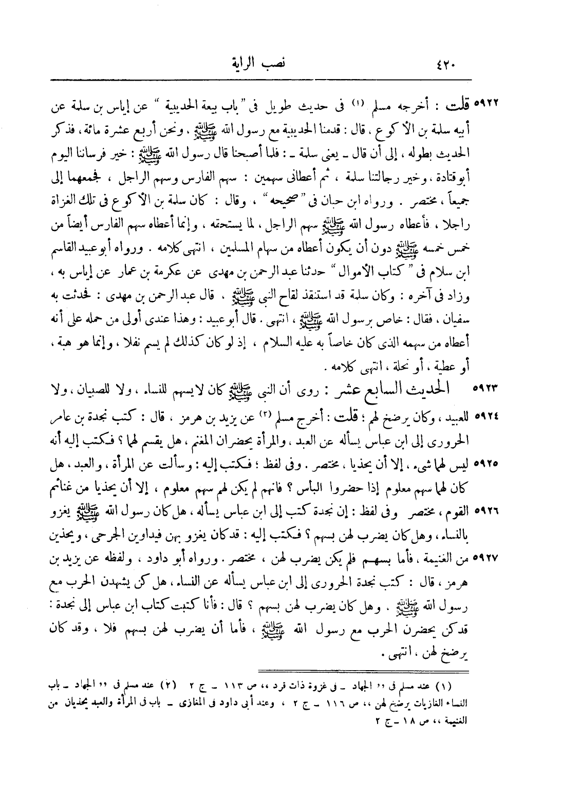 قُلْت: أَخْرَجَهُ مُسْلِمٌ 1 فِي حَدِيثٍ طَوِيلٍ فِي "بَابِ بَيْعَةِ الْحُدَيْبِيَةِ" عَنْ إيَاسِ بْنِ سَلَمَةَ عَنْ أَبِيهِ سَلَمَةَ بْنِ الْأَكْوَعِ، قَالَ: قَدِمْنَا الْحُدَيْبِيَةَ مَعَ رَسُولِ اللَّهِ صَلَّى اللَّهُ عَلَيْهِ وَسَلَّمَ، وَنَحْنُ أَرْبَعَ عَشْرَةَ مِائَةً، فَذَكَرَ الْحَدِيثَ بِطُولِهِ، إلَى أَنْ قَالَ - يَعْنِي سَلَمَةَ -: فَلَمَّا أَصْبَحْنَا قال رسول الله عليه وسلم: " خَيْرُ فُرْسَانِنَا الْيَوْمَ أَبُو قَتَادَةَ، وَخَيْرُ رَجَّالَتِنَا سَلَمَةُ"، ثُمَّ أَعْطَانِي سَهْمَيْنِ: سَهْمَ الْفَارِسِ وَسَهْمَ الرَّاجِلِ، فَجَمَعَهُمَا إلَيَّ جَمِيعًا، مُخْتَصَرٌ، وَرَوَاهُ ابْنُ حِبَّانَ فِي "صَحِيحِهِ"، وَقَالَ: كَانَ سَلَمَةُ بْنُ الْأَكْوَعِ فِي تِلْكَ الْغُزَاةِ رَاجِلًا، فَأَعْطَاهُ رَسُولُ اللَّهِ صَلَّى اللَّهُ عَلَيْهِ وَسَلَّمَ سَهْمَ الرَّاجِلِ، لِمَا يَسْتَحِقُّهُ، وَإِنَّمَا أَعْطَاهُ سَهْمَ الْفَارِسِ أَيْضًا مِنْ خُمُسِ خُمُسِهِ صَلَّى اللَّهُ عَلَيْهِ وَسَلَّمَ دُونَ أَنْ يَكُونَ أَعْطَاهُ مِنْ سِهَامِ الْمُسْلِمِينَ، انْتَهَى كلامه. ورواه أبو عبيدة الْقَاسِمُ بْنُ سَلَّامٍ فِي "كِتَابِ الْأَمْوَالِ" حَدَّثَنَا عَبْدُ الرَّحْمَنِ بْنُ مَهْدِيٍّ عَنْ عِكْرِمَةَ بْنِ عَمَّارٍ عَنْ إيَاسٍ بِهِ، وَزَادَ فِي آخِرِهِ: وَكَانَ سَلَمَةُ قَدْ اسْتَنْقَذَ لِقَاحَ النَّبِيِّ صَلَّى اللَّهُ عَلَيْهِ وَسَلَّمَ، قَالَ عَبْدُ الرَّحْمَنِ بْنُ مَهْدِيٍّ: فَحَدَّثْت بِهِ سُفْيَانَ، فَقَالَ: خَاصٌّ بِرَسُولِ اللَّهِ صَلَّى اللَّهُ عَلَيْهِ وَسَلَّمَ، انْتَهَى. قال أبو عبيدة: وَهَذَا عِنْدِي أَوْلَى مِنْ حَمْلِهِ عَلَى أَنَّهُ أَعْطَاهُ مِنْ سَهْمِهِ الَّذِي كَانَ خَاصًّا بِهِ عليه السلام، إذْ لَوْ كَانَ كَذَلِكَ لَمْ يُسَمِّ نَفْلًا، وَإِنَّمَا هُوَ هِبَةً، أَوْ عَطِيَّةً، أَوْ نِحْلَةً، انْتَهَى كَلَامُهُ.