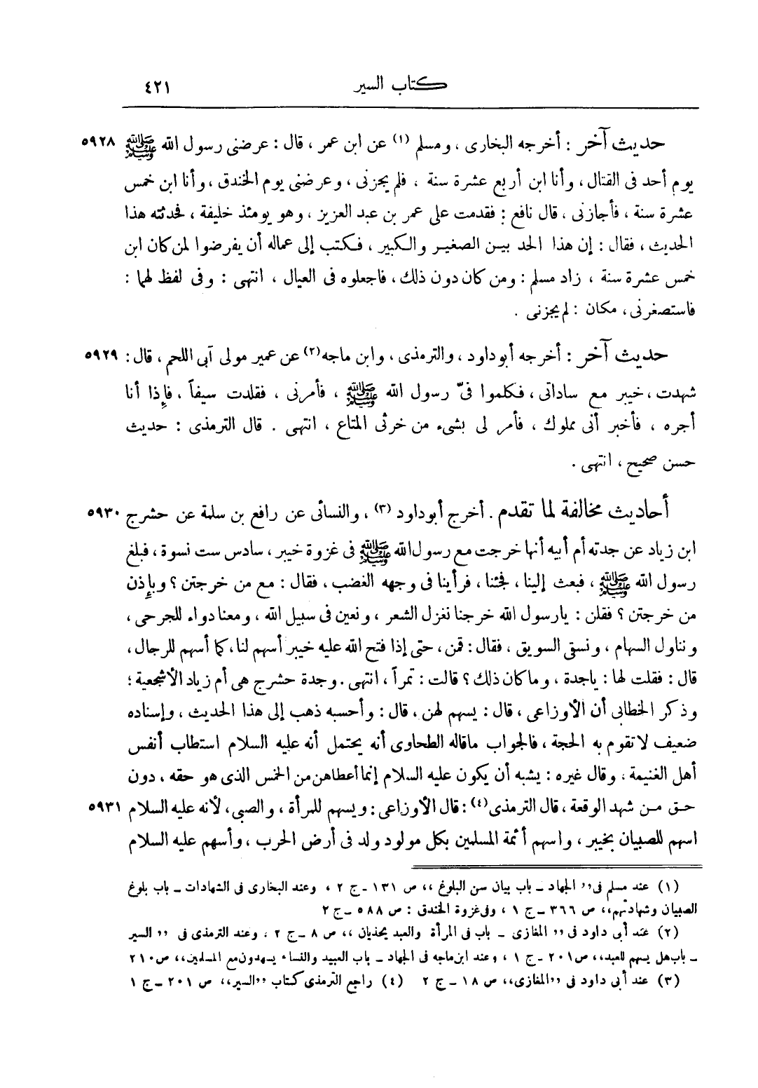 1 عند مسلم في "الجهاد - باب بيان سن البلوغ" ص 131 - ج 2، وعند البخاري في الشهادات - باب بلوغ الصبيان وشهادتهم" ص 366 - ج 1، وفي غزوة الخندق: ص 588 - ج 2.
