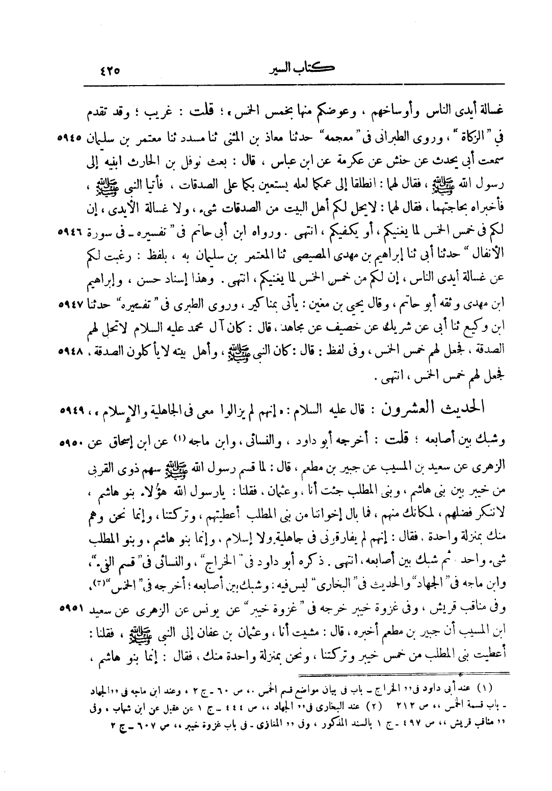 غُسَالَةَ أَيْدِي النَّاسِ وَأَوْسَاخَهُمْ، وَعَوَّضَكُمْ مِنْهَا بِخُمُسِ الْخُمُسِ"، قُلْت: غَرِيبٌ، وَقَدْ تَقَدَّمَ فِي "الزَّكَاةِ"، وَرَوَى الطَّبَرَانِيُّ فِي "مُعْجَمِهِ" حَدَّثَنَا مُعَاذُ بْنُ الْمُثَنَّى ثَنَا مُسَدَّدٌ ثَنَا مُعْتَمِرُ بْنُ سُلَيْمَانَ سَمِعْت أَبِي يُحَدِّثُ عَنْ حَنَشٍ عَنْ عِكْرِمَةَ عَنْ ابْنِ عَبَّاسٍ، قَالَ: بَعَثَ نَوْفَلُ بْنُ الْحَارِثِ ابْنَيْهِ إلَى رَسُولِ اللَّهِ صَلَّى اللَّهُ عَلَيْهِ وَسَلَّمَ، فَقَالَ لَهُمَا: "انْطَلِقَا إلَى عَمِّكُمَا لَعَلَّهُ يَسْتَعِينُ بِكَمَا عَلَى الصَّدَقَاتِ"، فَأَتَيَا النَّبِيَّ صَلَّى اللَّهُ عَلَيْهِ وَسَلَّمَ، فَأَخْبَرَاهُ بِحَاجَتِهِمَا، فَقَالَ لَهُمَا: "لَا يَحِلُّ لَكُمْ أَهْلَ الْبَيْتِ مِنْ الصَّدَقَاتِ شَيْءٌ، وَلَا غُسَالَةُ الْأَيْدِي، إنَّ لَكُمْ فِي خُمُسِ الْخُمُسِ لَمَا يُغْنِيكُمْ، أَوْ يَكْفِيكُمْ"، انْتَهَى. وَرَوَاهُ ابْنُ أَبِي حَاتِمٍ فِي "تَفْسِيرِهِ - فِي سُورَةِ الْأَنْفَالِ" حَدَّثَنَا أَبِي ثَنَا إبْرَاهِيمُ بْنُ مَهْدِيٍّ الْمِصِّيصِيِّ ثَنَا الْمُعْتَمِرُ بْنُ سُلَيْمَانَ بِهِ، بِلَفْظِ: رَغِبْت لَكُمْ عَنْ غُسَالَةِ أَيْدِي النَّاسِ، إنَّ لَكُمْ مِنْ خُمُسِ الْخُمُسِ لَمَا يُغْنِيكُمْ، انْتَهَى. وَهَذَا إسْنَادٌ حَسَنٌ، وَإِبْرَاهِيمُ بْنُ مَهْدِيٍّ وَثَّقَهُ أَبُو حَاتِمٍ، وَقَالَ يَحْيَى بْنُ مَعِينٍ: يَأْتِي بِمَنَاكِيرَ، وَرَوَى الطَّبَرِيُّ فِي "تَفْسِيرِهِ" حَدَّثَنَا ابْنُ وَكِيعٍ ثَنَا أبي شريك عن حصيف عَنْ مُجَاهِدٍ، قَالَ: كَانَ آلُ مُحَمَّدٍ عليه السلام لَا تَحِلُّ لَهُمْ الصَّدَقَةُ، فَجَعَلَ لَهُمْ خُمُسَ الْخُمُسِ، وَفِي لَفْظٍ: قَالَ: كَانَ النَّبِيُّ صَلَّى اللَّهُ عَلَيْهِ وَسَلَّمَ، وَأَهْلُ بَيْتِهِ لَا يَأْكُلُونَ الصَّدَقَةَ، فَجَعَلَ لَهُمْ خُمُسَ الْخُمُسِ، انْتَهَى.