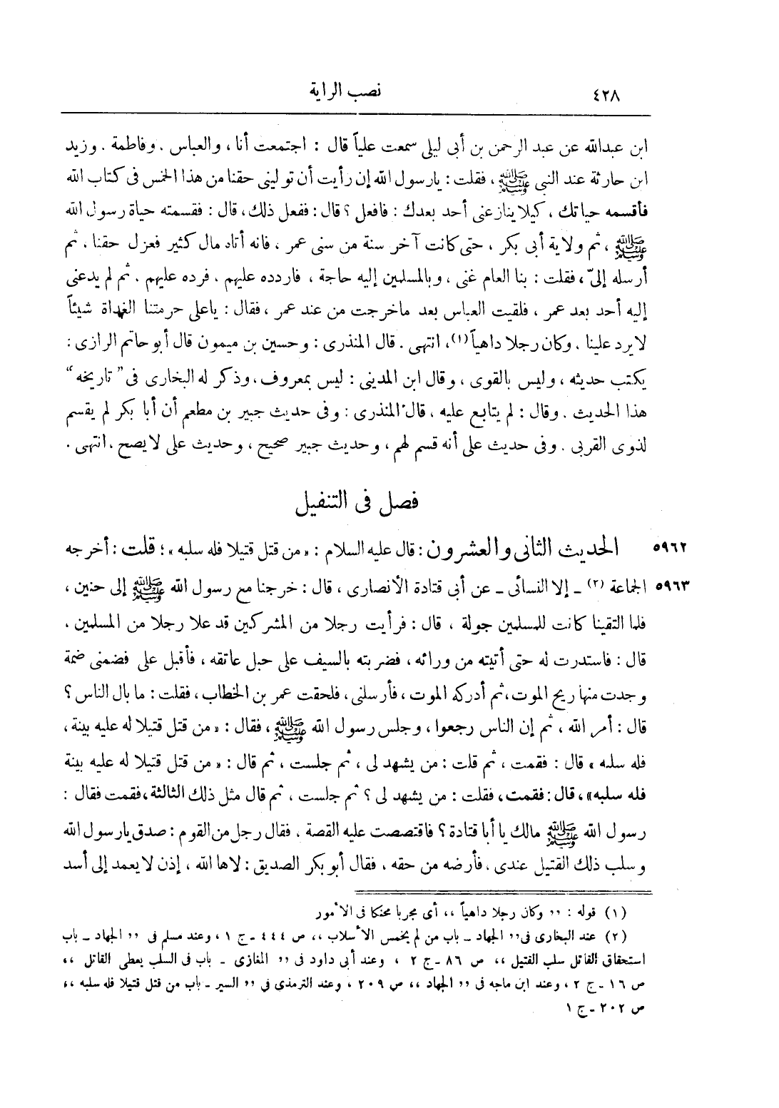 2 عند البخاري في "الجهاد - باب من لم يخمس الأسباب" ص 444 - ج 1، وعند مسلم في "الجهاد - باب استحقاق القائل سلب القتيل" ص 86 - ج 2، وعند أبي داود في "المغازي - باب في السلب يعطى القائل" ص 16 - ج 2، وعند ابن ماجه في "الجهاد" ص 209، وعند الترمذي في "السير - باب من قتل قتيلا فله سلبه" ص 202 - ج 1.