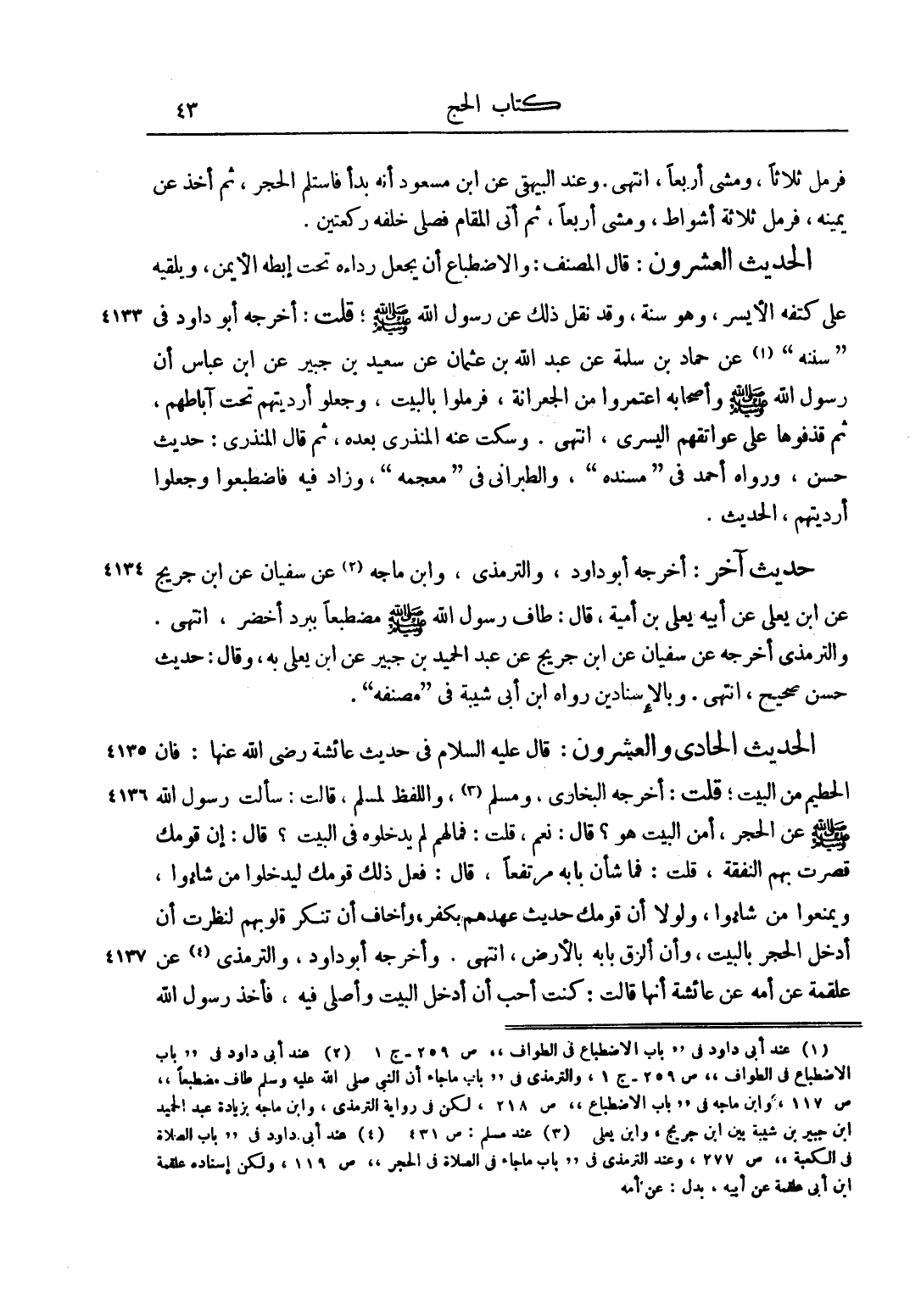 الْحَدِيثُ الْعِشْرُونَ: قَالَ الْمُصَنِّفُ: وَالِاضْطِبَاعُ أَنْ يَجْعَلَ رِدَاءَهُ تَحْتَ إبْطِهِ الْأَيْمَنِ، وَيُلْقِيَهُ عَلَى كَتِفِهِ الْأَيْسَرِ، وَهُوَ سُنَّةٌ، وَقَدْ نُقِلَ ذَلِكَ عَنْ رَسُولِ اللَّهِ صَلَّى اللَّهُ عَلَيْهِ وَسَلَّمَ، قُلْت: أَخْرَجَهُ أَبُو دَاوُد فِي "سُنَنِهِ"1 عَنْ حَمَّادِ بْنِ سَلَمَةَ عَنْ عَبْدِ اللَّهِ بْنِ عُثْمَانَ عَنْ سَعِيدِ بْنِ جُبَيْرٍ عَنْ ابْنِ عَبَّاسٍ أَنَّ رَسُولَ اللَّهِ صَلَّى اللَّهُ عَلَيْهِ وَسَلَّمَ وَأَصْحَابَهُ اعْتَمَرُوا مِنْ الْجِعْرَانَةِ، فَرَمَلُوا بِالْبَيْتِ، وَجَعَلُوا أَرْدِيَتَهُمْ تَحْتَ آبَاطِهِمْ، ثُمَّ قَذَفُوهَا عَلَى عَوَاتِقِهِمْ الْيُسْرَى، انْتَهَى. وَسَكَتَ عَنْهُ الْمُنْذِرِيُّ بَعْدَهُ، ثُمَّ قَالَ الْمُنْذِرِيُّ: حَدِيثٌ حَسَنٌ، وَرَوَاهُ أَحْمَدُ فِي "مُسْنَدِهِ"، وَالطَّبَرَانِيُّ فِي "مُعْجَمِهِ"، وَزَادَ فِيهِ فَاضْطَبَعُوا وَجَعَلُوا أَرْدِيَتَهُمْ، الْحَدِيثَ.