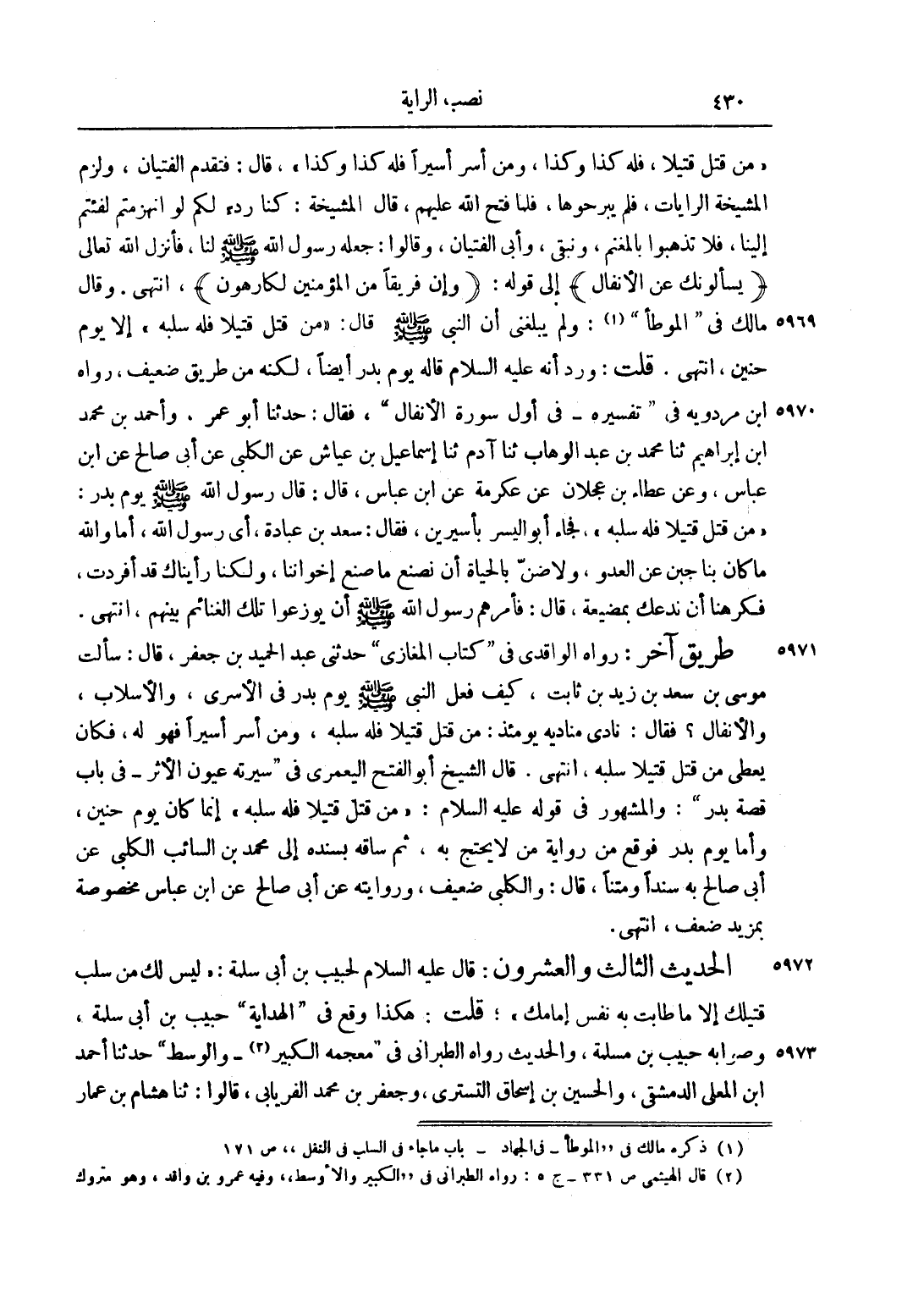 الْحَدِيثُ الثَّالِثُ وَالْعِشْرُونَ: قَالَ عليه السلام لِحَبِيبِ بْنِ أَبِي سَلَمَةَ: "لَيْسَ لَك مِنْ سَلَبِ قَتِيلِك إلَّا مَا طَابَتْ بِهِ نَفْسُ إمَامِك"، قُلْت: هَكَذَا وَقَعَ فِي "الْهِدَايَةِ" حَبِيبُ بْنُ أَبِي سَلَمَةَ، وَصَوَابُهُ حَبِيبُ بْنُ مَسْلَمَةً، وَالْحَدِيثُ رَوَاهُ الطَّبَرَانِيُّ فِي "مُعْجَمِهِ الكبير 2 - والوسط" حَدَّثَنَا أَحْمَدُ بْنُ الْمُعَلَّى الدِّمَشْقِيُّ، وَالْحُسَيْنُ بْنُ إسْحَاقَ التُّسْتَرِيُّ، وَجَعْفَرُ بْنُ مُحَمَّدٍ الْفِرْيَابِيُّ، قَالُوا: ثَنَا هِشَامُ بْنُ عَمَّارٍ