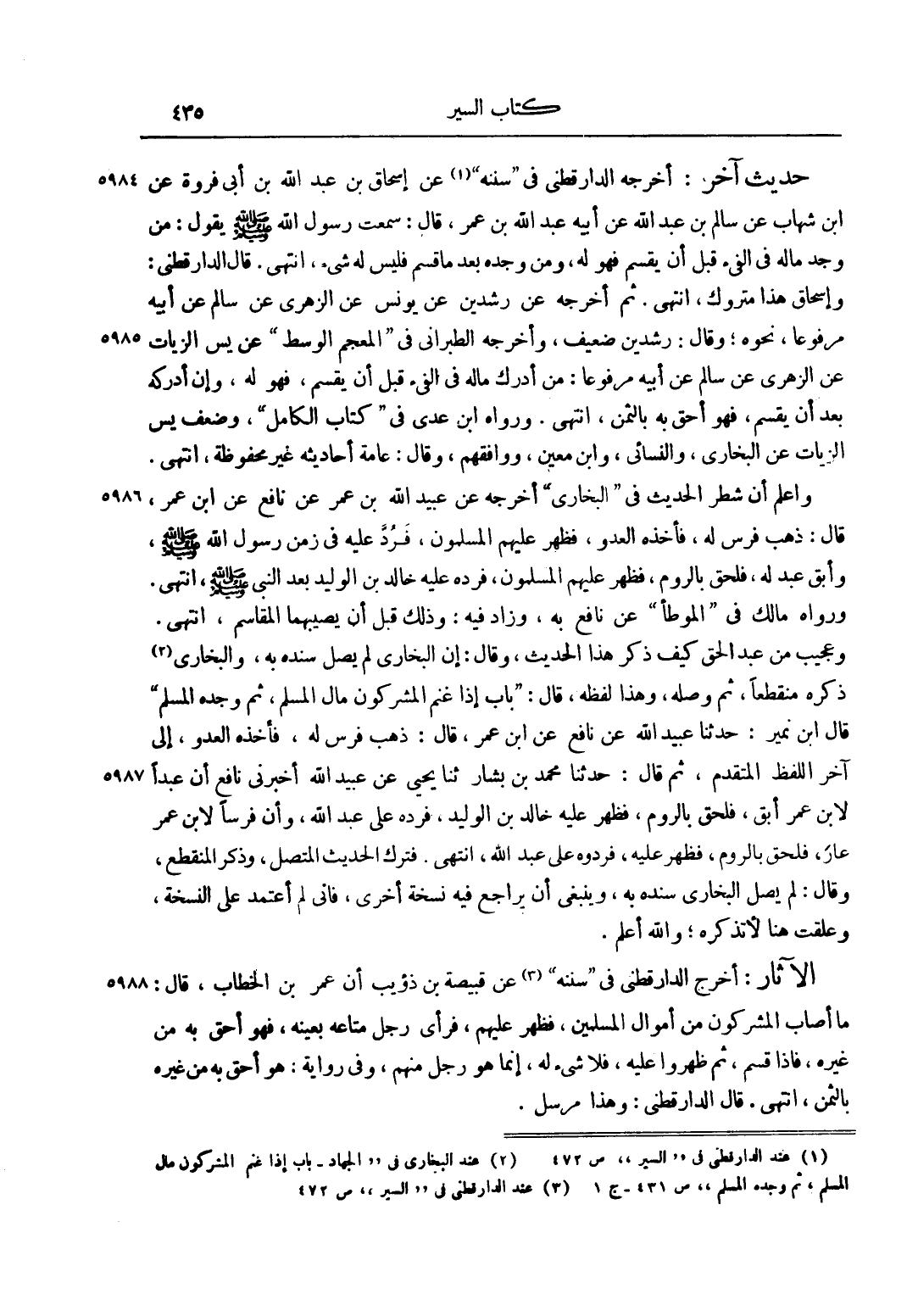 الْآثَارُ: أَخْرَجَ الدَّارَقُطْنِيُّ فِي "سُنَنِهِ" 3 عَنْ قَبِيصَةَ بْنِ ذُؤَيْبٍ أَنَّ عُمَرَ بْنَ الْخَطَّابِ، قَالَ: مَا أَصَابَ الْمُشْرِكُونَ مِنْ أَمْوَالِ الْمُسْلِمِينَ، فَظَهَرَ عَلَيْهِمْ، فَرَأَى رَجُلٌ مَتَاعَهُ بِعَيْنِهِ، فَهُوَ أَحَقُّ بِهِ مِنْ غَيْرِهِ، فَإِذَا قُسِمَ، ثُمَّ ظَهَرُوا عَلَيْهِ، فَلَا شَيْءَ لَهُ، إنَّمَا هُوَ رَجُلٌ مِنْهُمْ، وَفِي رِوَايَةٍ: هُوَ أَحَقُّ بِهِ مِنْ غَيْرِهِ بِالثَّمَنِ، انْتَهَى. قَالَ الدَّارَقُطْنِيُّ: وَهَذَا مُرْسَلٌ.