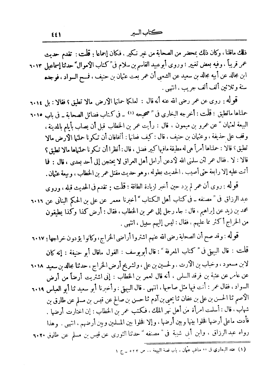 ذَلِكَ مَا قُلْنَا، وَكَانَ ذَلِكَ بِمَحْضَرٍ مِنْ الصَّحَابَةِ مِنْ غَيْرِ نَكِيرٍ، فَكَانَ إجْمَاعًا، قُلْت: تَقَدَّمَ حَدِيثُ عُمَرَ قَرِيبًا، وَفِيهِ بَعْضُ تَغْيِيرٍ، وَرَوَى أَبُو عُبَيْدٍ الْقَاسِمُ بْنُ سَلَّامٍ فِي "كِتَابِ الْأَمْوَالِ" حَدَّثَنَا إسْمَاعِيلُ بْنُ مُجَالِدٍ عَنْ أَبِيهِ مُجَالِدِ بْنِ سَعِيدٍ عَنْ الشَّعْبِيِّ أَنَّ عُمَرَ بَعَثَ عُثْمَانَ بْنَ حُنَيْفٍ، فَمَسَحَ السَّوَادَ، فَوَجَدَهُ سِتَّةً وَثَلَاثِينَ أَلْفَ أَلْفِ جَرِيبٍ، انْتَهَى.