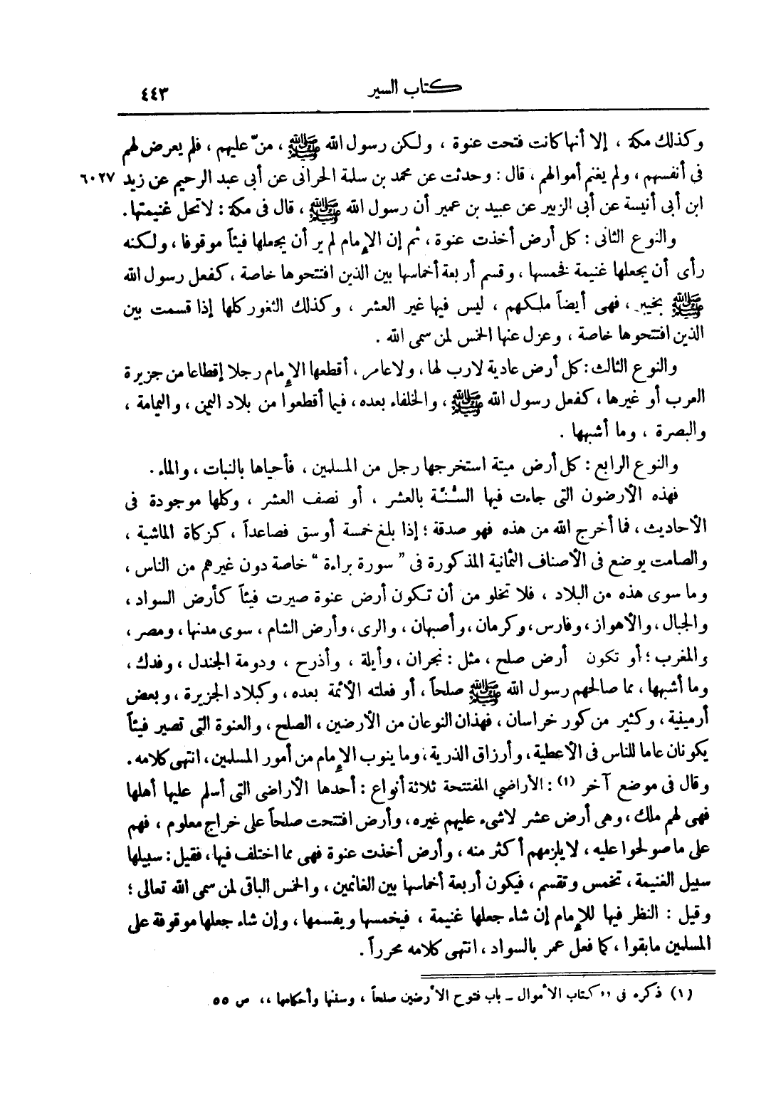 فَهَذِهِ الْأَرْضُونَ الَّتِي جَاءَتْ فِيهَا السُّنَّةُ بِالْعُشْرِ، أَوْ نِصْفِ الْعُشْرِ، وَكُلُّهَا مَوْجُودَةٌ فِي الْأَحَادِيثِ، فَمَا أَخْرَجَ اللَّهُ مِنْ هَذِهِ فَهُوَ صَدَقَةٌ، إذَا بَلَغَ خَمْسَةَ أَوْسُقٍ فَصَاعِدًا، كَزَكَاةِ الْمَاشِيَةِ، وَالصَّامِتُ يُوضَعُ فِي الْأَصْنَافِ الثَّمَانِيَةِ الْمَذْكُورَةِ فِي "سُورَةِ بَرَاءَةٌ" خَاصَّةً دُونَ غَيْرِهِمْ مِنْ النَّاسِ، وَمَا سِوَى هَذِهِ من البلاد، فلا تخلوا مِنْ أَنْ تَكُونَ أَرْضَ عَنْوَةٍ صُيِّرَتْ فَيْئًا كَأَرْضِ السَّوَادِ، وَالْجِبَالِ، وَالْأَهْوَازِ، وَفَارِسَ، وَكَرْمَانَ، وَأَصْبَهَانَ، وَالرَّيِّ، وَأَرْضِ الشَّامِ، سِوَى مُدُنِهَا، وَمِصْرَ، وَالْمَغْرِبِ، أَوْ يَكُونَ، أَرْضَ صُلْحٍ، مِثْلُ: نَجْرَانَ، وَأَيْلَةَ، وَأَذْرَحَ، وَدُومَةَ الْجَنْدَلِ، وَفَدَكَ، وَمَا أَشْبَهَهَا، مِمَّا صَالَحَهُمْ رَسُولُ اللَّهِ صَلَّى اللَّهُ عَلَيْهِ وَسَلَّمَ صُلْحًا، أَوْ فَعَلَتْهُ الْأَئِمَّةُ بَعْدَهُ، وَكَبِلَادِ الْجَزِيرَةِ، وَبَعْضِ أَرْمِينِيَةَ، وَكَثِيرٍ مِنْ كُوَرِ خُرَاسَانَ، فَهَذَانِ النَّوْعَانِ مِنْ الْأَرَضِينَ، الصُّلْحُ، وَالْعَنْوَةُ الَّتِي تَصِيرُ فَيْئًا يَكُونَانِ عَامًّا لِلنَّاسِ فِي الْأَعْطِيَةِ، وَأَرْزَاقِ الذُّرِّيَّةِ، وَمَا يَنُوبُ الْإِمَامُ مِنْ أُمُورِ الْمُسْلِمِينَ، انْتَهَى كَلَامُهُ. وَقَالَ فِي مَوْضِعٍ آخَرَ1: الْأَرْضُ الْمُفْتَتَحَةُ ثَلَاثَةُ أَنْوَاعٍ: أَحَدُهَا الْأَرَاضِي الَّتِي أَسْلَمَ عَلَيْهَا أَهْلُهَا فَهِيَ لَهُمْ مِلْكٌ، وَهِيَ أَرْضُ عُشْرٍ لَا شيء عليهم غيرها، وَأَرْضٌ اُفْتُتِحَتْ صُلْحًا عَلَى خَرَاجٍ مَعْلُومٍ، فَهُمْ عَلَى مَا صُولِحُوا عَلَيْهِ، لَا يَلْزَمُهُمْ أَكْثَرُ مِنْهُ، وَأَرْضٌ أُخِذَتْ عَنْوَةً فَهِيَ مِمَّا اُخْتُلِفَ فِيهَا، فَقِيلَ: سَبِيلُهَا سَبِيلُ الْغَنِيمَةِ، تُخَمَّسُ وَتُقْسَمُ، فَيَكُونُ أَرْبَعَةُ أَخْمَاسِهَا بَيْنَ الْغَانِمِينَ، وَالْخُمُسُ الْبَاقِي لِمَنْ سَمَّى اللَّهُ تَعَالَى، وَقِيلَ: النَّظَرُ فِيهَا لِلْإِمَامِ إنْ شَاءَ جَعَلَهَا غَنِيمَةً، فَيُخَمِّسُهَا وَيَقْسِمُهَا، وَإِنْ شَاءَ جَعَلَهَا مَوْقُوفَةً عَلَى الْمُسْلِمِينَ مَا بَقُوا، كَمَا فَعَلَ عُمَرُ بِالسَّوَادِ، انْتَهَى كَلَامُهُ مُحَرَّرًا.