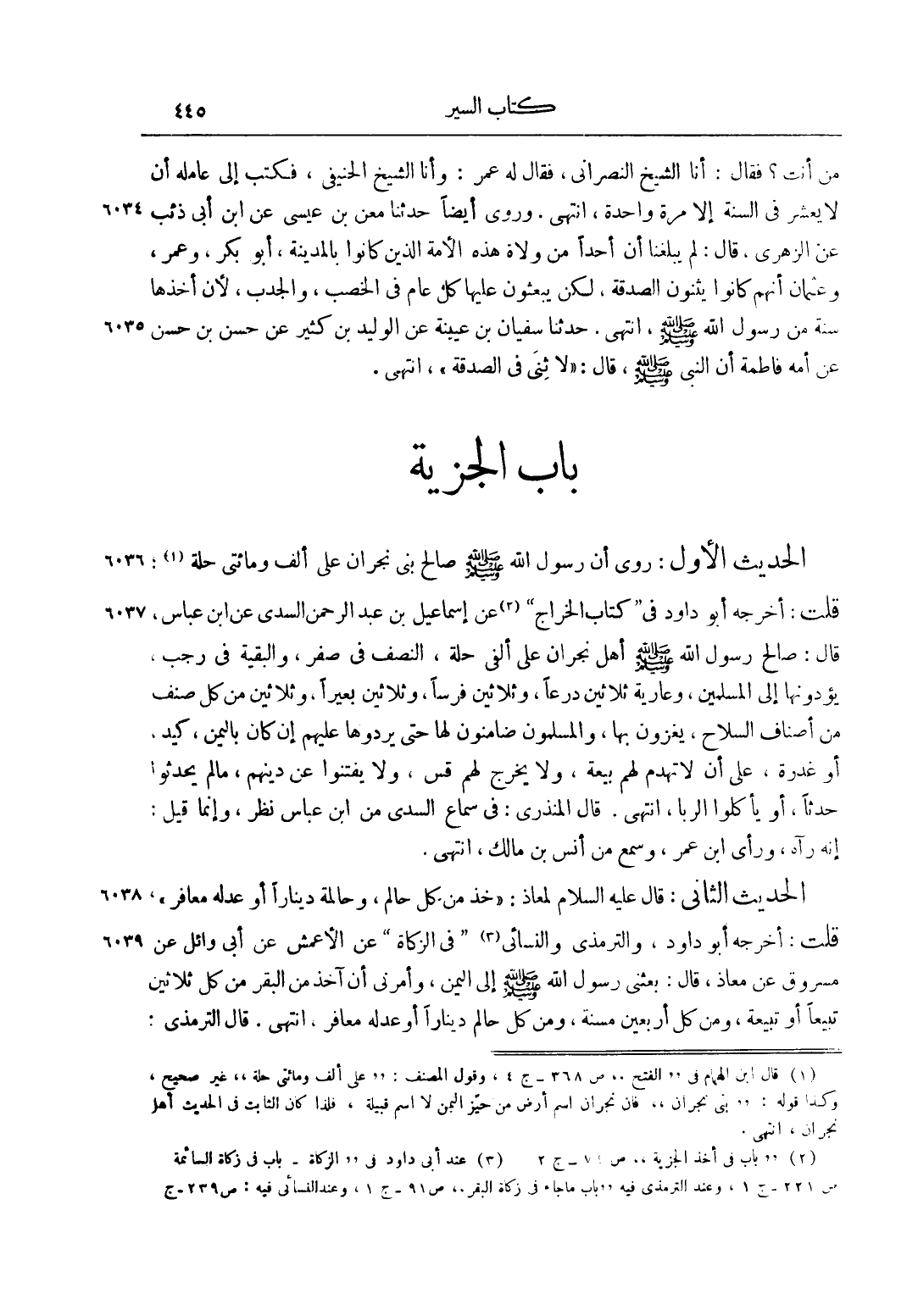 1 قال ابن الهمام في "الفتح" ص 368 - ج 4، وقول المصنف: على "ألف ومائتي حلة" غير صحيح، وكذا قوله: "بني نجران" فإن نجران اسم أرض من حتز اليمن لا اسم قبيلة، فلذا كان الثابت في الحديث أهل نجران، انتهى.