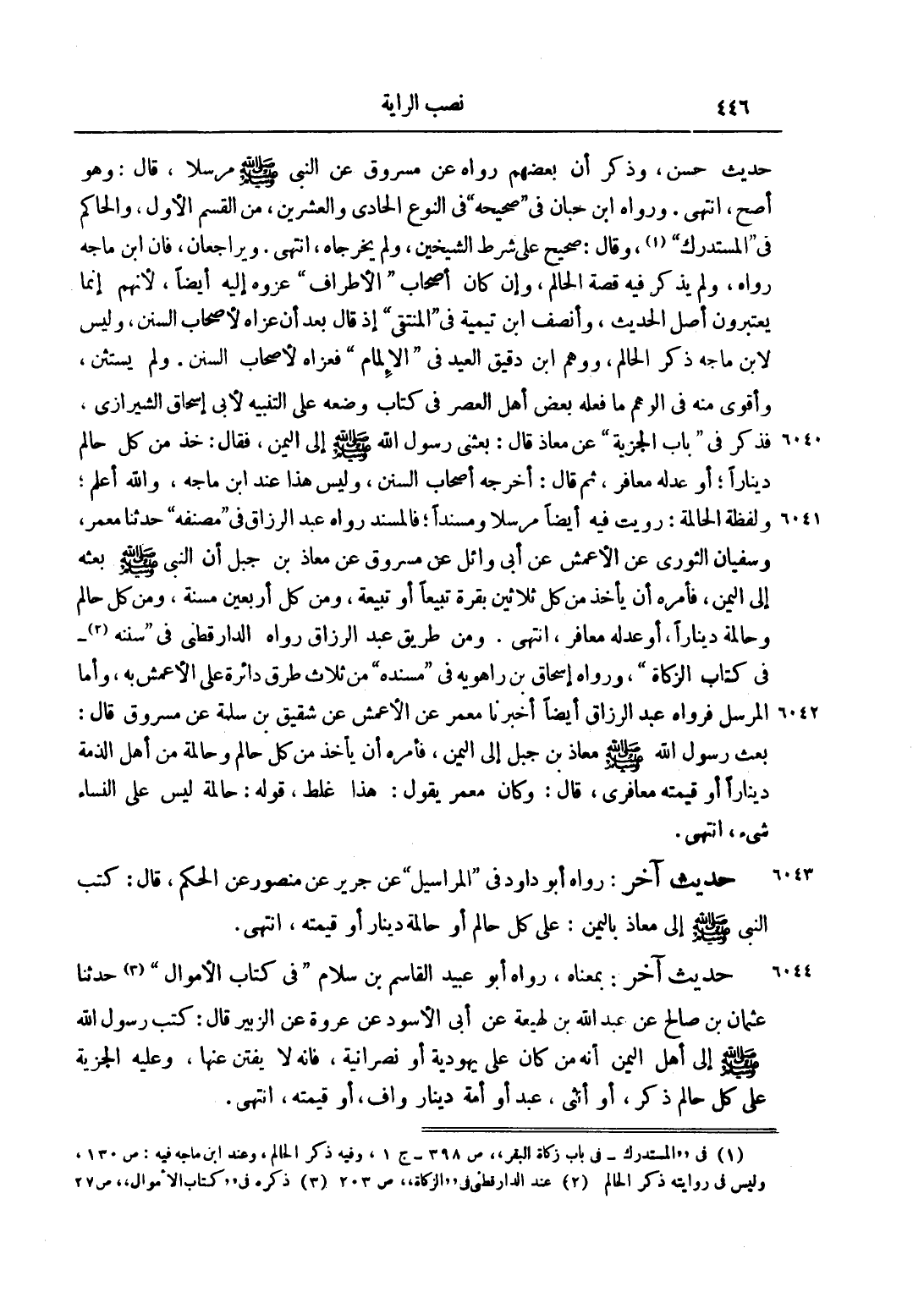حَدِيثٌ حَسَنٌ، وَذَكَرَ أَنَّ بَعْضَهُمْ رَوَاهُ عَنْ مَسْرُوقٍ عَنْ النَّبِيِّ صَلَّى اللَّهُ عَلَيْهِ وَسَلَّمَ مُرْسَلًا، قَالَ: وَهُوَ أَصَحُّ، انْتَهَى. وَرَوَاهُ ابْنُ حِبَّانَ فِي "صَحِيحِهِ" فِي النَّوْعِ الْحَادِي وَالْعِشْرِينَ، مِنْ الْقِسْمِ الْأَوَّلِ، وَالْحَاكِمُ فِي "الْمُسْتَدْرَكِ"1، وَقَالَ: صَحِيحٌ عَلَى شَرْطِ الشَّيْخَيْنِ، وَلَمْ يُخَرِّجَاهُ، انْتَهَى. وَيُرَاجَعَانِ، فَإِنَّ ابْنَ مَاجَهْ رَوَاهُ، وَلَمْ يَذْكُرْ فِيهِ قِصَّةَ الْحَالِمِ، وَإِنْ كَانَ أَصْحَابُ "الْأَطْرَافِ" عَزَوْهُ إلَيْهِ أَيْضًا، لِأَنَّهُمْ إنَّمَا يَعْتَبِرُونَ أَصْلَ الْحَدِيثِ، وَأَنْصَفَ ابْنُ تَيْمِيَّةَ فِي "الْمُنْتَقَى" إذْ قَالَ بَعْدَ أَنْ عَزَاهُ لِأَصْحَابِ السُّنَنِ، وَلَيْسَ لِابْنِ مَاجَهْ ذِكْرُ الْحَالِمِ، وَوَهَمَ ابْنُ دَقِيقِ الْعِيدِ فِي "الْإِلْمَامِ" فَعَزَاهُ لِأَصْحَابِ السُّنَنِ، وَلَمْ يَسْتَثْنِ، وَأَقْوَى مِنْهُ فِي الْوَهْمِ مَا فَعَلَهُ بَعْضُ أَهْلِ الْعَصْرِ فِي كِتَابٍ وَضَعَهُ عَلَى التَّنْبِيهِ لِأَبِي إسْحَاقَ الشِّيرَازِيِّ، فَذَكَرَ فِي "بَابِ الْجِزْيَةِ" عَنْ مُعَاذٍ قَالَ: بَعَثَنِي رَسُولُ اللَّهِ صَلَّى اللَّهُ عَلَيْهِ وَسَلَّمَ إلَى الْيَمَنِ، فَقَالَ: "خُذْ مِنْ كُلِّ حَالِمٍ دِينَارًا، أَوْ عِدْلَهُ مَعَافِرَ"، ثُمَّ قَالَ: أَخْرَجَهُ أَصْحَابُ السُّنَنِ، وَلَيْسَ هَذَا عِنْدَ ابْنِ مَاجَهْ، وَاَللَّهُ أَعْلَمُ، وَلَفْظَةُ الْحَالِمَةِ: رُوِيَتْ فِيهِ أَيْضًا مُرْسَلًا وَمُسْنَدًا، فَالْمُسْنَدُ رَوَاهُ عَبْدُ الرَّزَّاقِ فِي "مُصَنَّفِهِ" حَدَّثَنَا مَعْمَرٌ، وَسُفْيَانُ الثَّوْرِيُّ عَنْ الْأَعْمَشِ عَنْ أَبِي وَائِلٍ عَنْ مَسْرُوقٍ عَنْ مُعَاذِ بْنِ جَبَلٍ أَنَّ النَّبِيَّ صَلَّى اللَّهُ عَلَيْهِ وَسَلَّمَ بَعَثَهُ إلَى الْيَمَنِ، فَأَمَرَهُ أَنْ يَأْخُذَ مِنْ كُلِّ ثَلَاثِينَ بَقَرَةً تَبِيعًا أَوْ تَبِيعَةً، وَمِنْ كُلِّ أَرْبَعِينَ مُسِنَّةً، وَمِنْ كُلِّ حَالِمٍ وَحَالِمَةٍ دِينَارًا، أَوْ عِدْلَهُ مَعَافِرَ، انْتَهَى. وَمِنْ طَرِيقِ عَبْدِ الرَّزَّاقِ رَوَاهُ الدَّارَقُطْنِيُّ فِي "سُنَنِهِ 2 - فِي كِتَابِ الزَّكَاةِ"، وَرَوَاهُ إسْحَاقُ بْنُ رَاهْوَيْهِ فِي "مُسْنَدِهِ" مِنْ ثَلَاثِ طُرُقٍ دَائِرَةٍ عَلَى الْأَعْمَشِ بِهِ، وَأَمَّا الْمُرْسَلُ فَرَوَاهُ عَبْدُ الرَّزَّاقِ أَيْضًا أَخْبَرَنَا مَعْمَرٌ عَنْ الْأَعْمَشِ عَنْ شَقِيقِ بْنِ سَلَمَةَ عَنْ مَسْرُوقٍ قَالَ: بَعَثَ رَسُولُ اللَّهِ صَلَّى اللَّهُ عَلَيْهِ وَسَلَّمَ مُعَاذَ بْنَ جَبَلٍ إلَى اليمن، وأمره أَنْ يَأْخُذَ مِنْ كُلِّ حَالِمٍ وَحَالِمَةٍ مِنْ أَهْلِ الذِّمَّةِ دِينَارًا أَوْ قِيمَتَهُ مَعَافِرِيَّ، قَالَ: وَكَانَ مَعْمَرٌ يَقُولُ: هَذَا غَلَطٌ، قَوْلُهُ: حَالِمَةٍ لَيْسَ عَلَى النِّسَاءِ شَيْءٌ، انْتَهَى.