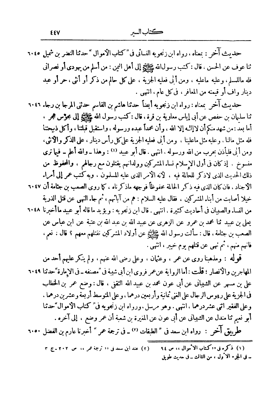 حَدِيثٌ آخَرُ: بِمَعْنَاهُ: رَوَاهُ ابْنُ زَنْجُوَيْهِ أَيْضًا حَدَّثَنَا هَاشِمُ بن القاسم حدثني المرجا بْنُ رَجَاءٍ ثَنَا سُلَيْمَانُ بْنُ حَفْصٍ عَنْ أَبِي إيَاسٍ مُعَاوِيَةَ بْنِ قُرَّةَ، قَالَ: كَتَبَ رَسُولُ اللَّهِ صَلَّى اللَّهُ عَلَيْهِ وَسَلَّمَ إلَى مَجُوسِ هَجَرَ، أَمَّا بَعْدُ: "مَنْ شَهِدَ مِنْكُمْ أَنْ لَا إلَهَ إلَّا اللَّهُ، وَأَنَّ مُحَمَّدًا عَبْدُهُ وَرَسُولُهُ، وَاسْتَقْبَلَ قِبْلَتَنَا، وَأَكَلَ ذبيحتنا فله مثل مالنا، وَعَلَيْهِ مِثْلُ مَا عَلَيْنَا، وَمَنْ أَبَى فَعَلَيْهِ الْجِزْيَةُ عَلَى كُلِّ رَأْسٍ دِينَارٌ، عَلَى الذَّكَرِ وَالْأُنْثَى، وَمَنْ أَبَى فَلْيَأْذَنْ بِحَرْبٍ مِنْ اللَّهِ وَرَسُولِهِ"، انْتَهَى. قَالَ أَبُو عُبَيْدٍ 1: وَهَذَا - وَاَللَّهُ أَعْلَمُ - فِيمَا نَرَى مَنْسُوخٌ، إذْ كَانَ فِي أَوَّلِ الْإِسْلَامِ نِسَاءُ الْمُشْرِكِينَ وَوِلْدَانُهُمْ يُقْتَلُونَ مَعَ رِجَالِهِمْ، وَالْمَحْفُوظُ مِنْ ذَلِكَ الْحَدِيثُ الَّذِي لَا ذِكْرَ لِلْحَالِمَةِ فِيهِ، لِأَنَّهُ الْأَمْرُ الَّذِي عَلَيْهِ الْمُسْلِمُونَ، وَبِهِ كَتَبَ عُمَرُ إلَى أُمَرَاءِ الْأَجْنَادِ، فَإِنْ كَانَ الَّذِي فِيهِ ذِكْرُ الْحَالِمَةِ مَحْفُوظًا فَوَجْهُهُ مَا ذَكَرْنَاهُ، كَمَا رَوَى الصَّعْبُ بْنُ جَثَّامَةَ أَنَّ خَيْلًا أَصَابَتْ مِنْ أَبْنَاءِ الْمُشْرِكِينَ، فَقَالَ عليه السلام: "هُمْ مِنْ آبَائِهِمْ"، ثُمَّ جَاءَ النَّهْيُ عَنْ قَتْلِ الذُّرِّيَّةِ مِنْ النِّسَاءِ وَالصِّبْيَانِ فِي أَحَادِيثَ كَثِيرَةٍ، انْتَهَى. قَالَ ابْنُ زَنْجُوَيْهِ: وَيُؤَيِّدُ مَا قَالَهُ أَبُو عُبَيْدٍ مَا أَخْبَرَنَا يَعْلَى بْنُ عُبَيْدٍ ثَنَا مُحَمَّدُ بْنُ عَمْرٍو عَنْ الزُّهْرِيِّ عَنْ عُبَيْدِ اللَّهِ بْنِ عُتْبَةَ عَنْ ابْنِ عَبَّاسٍ عَنْ الصَّعْبِ بْنِ جَثَّامَةَ، قَالَ: سَأَلْت النبي صَلَّى اللَّهُ عَلَيْهِ وَسَلَّمَ عَنْ أَوْلَادِ الْمُشْرِكِينَ نَقْتُلُهُمْ مَعَهُمْ؟ قَالَ: " نَعَمْ، فَإِنَّهُمْ مِنْهُمْ"، ثُمَّ نَهَى عَنْ قَتْلِهِمْ يَوْمَ خَيْبَرَ، انْتَهَى.