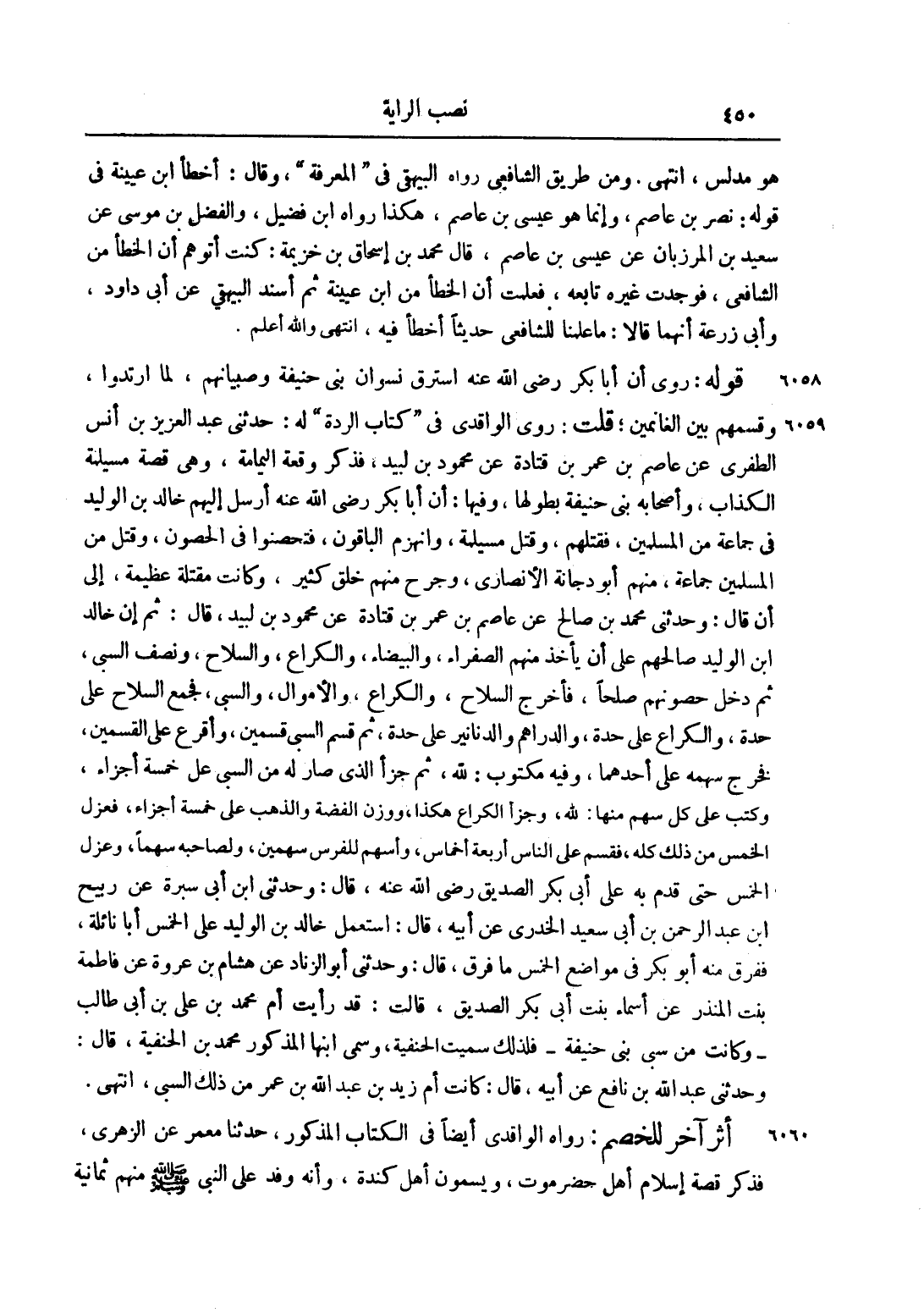 قَوْله: رُوِيَ أَنَّ أَبَا بَكْرٍ رضي الله عنه اسْتَرَقَّ نِسْوَانَ بَنِي حَنِيفَةَ وَصِبْيَانَهُمْ، لَمَّا ارْتَدُّوا، وَقَسَّمَهُمْ بَيْنَ الْغَانِمِينَ، قُلْت: رَوَى الْوَاقِدِيُّ فِي "كِتَابِ الرِّدَّةِ" لَهُ: حَدَّثَنِي عَبْدُ الْعَزِيزِ بْنُ أَنَسٍ الطَّفْرِيُّ عَنْ عَاصِمِ بْنِ عُمَرَ بْنِ قَتَادَةَ عَنْ مَحْمُودِ بْنِ لَبِيدٍ، فَذَكَرَ وَقْعَةَ الْيَمَامَةِ، وَهِيَ قِصَّةُ مُسَيْلِمَةَ الْكَذَّابِ، وَأَصْحَابِهِ بَنِي حَنِيفَةَ بِطُولِهَا، وَفِيهَا: أَنَّ أَبَا بَكْرٍ رضي الله عنه أَرْسَلَ إلَيْهِمْ خَالِدَ بْنَ الْوَلِيدِ فِي جَمَاعَةٍ مِنْ الْمُسْلِمِينَ، فَقَتَلَهُمْ، وَقَتَلَ مُسَيْلِمَةَ، وَانْهَزَمَ الْبَاقُونَ، فَتَحَصَّنُوا فِي الْحُصُونِ، وَقُتِلَ مِنْ الْمُسْلِمِينَ جَمَاعَةٌ، مِنْهُمْ أَبُو دُجَانَةَ الْأَنْصَارِيُّ، وَجُرِحَ مِنْهُمْ خَلْقٌ كَثِيرٌ، وَكَانَتْ مَقْتَلَةً عَظِيمَةً، إلَى أَنْ قَالَ: وَحَدَّثَنِي مُحَمَّدُ بْنُ صَالِحٍ عَنْ عَاصِمِ بْنِ عُمَرَ بْنِ قَتَادَةَ عَنْ مَحْمُودِ بْنِ لَبِيدٍ، قَالَ: ثُمَّ إنَّ خَالِدَ بْنَ الْوَلِيدِ صَالَحَهُمْ عَلَى أَنْ يَأْخُذَ مِنْهُمْ الصَّفْرَاءَ، وَالْبَيْضَاءَ، وَالْكُرَاعَ، وَالسِّلَاحَ، وَنِصْفَ السَّبْيِ، ثُمَّ دَخَلَ حُصُونَهُمْ صُلْحًا، فَأَخْرَجَ السِّلَاحَ، وَالْكُرَاعَ، وَالْأَمْوَالَ، وَالسَّبْيَ، فَجَمَعَ السِّلَاحَ عَلَى حِدَةٍ، وَالْكُرَاعَ عَلَى حِدَةٍ، وَالدَّرَاهِمَ وَالدَّنَانِيرَ عَلَى حِدَةٍ، ثُمَّ قَسَمَ السَّبْيَ قِسْمَيْنِ، وَأَقْرَعَ عَلَى الْقِسْمَيْنِ، فَخَرَجَ سَهْمُهُ عَلَى أَحَدِهِمَا، وَفِيهِ مَكْتُوبٌ: لِلَّهِ، ثُمَّ جَزَّأَ الَّذِي صَارَ لَهُ مِنْ السَّبْيِ عَلَى خَمْسَةِ أَجْزَاءٍ، وَكَتَبَ عَلَى كُلِّ سَهْمٍ مِنْهَا: لِلَّهِ، وَجَزَّأَ الْكُرَاعَ هَكَذَا، وَوَزَنَ الْفِضَّةَ وَالذَّهَبَ، فَعَزَلَ الْخُمُسَ مِنْ ذَلِكَ كُلِّهِ، فَقَسَّمَ عَلَى النَّاسِ أَرْبَعَةَ أَخْمَاسٍ، وَأَسْهَمَ لِلْفَرَسِ سَهْمَيْنِ، وَلِصَاحِبِهِ سَهْمًا، وَعَزَلَ الْخُمُسَ حَتَّى قَدِمَ بِهِ عَلَى أَبِي بَكْرٍ الصِّدِّيقِ رضي الله عنه، قَالَ: وَحَدَّثَنِي ابْنُ أَبِي سَبْرَةَ عَنْ رُبَيْحِ بْنِ عَبْدِ الرَّحْمَنِ بْنِ أَبِي سَعِيدٍ الْخُدْرِيِّ عَنْ أَبِيهِ، قَالَ: اسْتَعْمَلَ خَالِدُ بْنُ الْوَلِيدِ عَلَى الْخُمُسِ أَبَا نَائِلَةَ، فَفَرَّقَ مِنْهُ أَبُو بَكْرٍ فِي مَوَاضِعِ الْخُمُسِ مَا فَرَّقَ، قَالَ: وَحَدَّثَنِي أَبُو الزِّنَادِ عَنْ هِشَامِ بْنِ عُرْوَةَ عَنْ فَاطِمَةَ بِنْتِ الْمُنْذِرِ عَنْ أَسْمَاءَ بِنْتِ أَبِي بَكْرٍ الصِّدِّيقِ، قَالَتْ: قَدْ رَأَيْت أُمَّ مُحَمَّدِ بْنِ عَلِيِّ بْنِ أَبِي طَالِبٍ - وَكَانَتْ مِنْ سَبْيِ بَنِي حَنِيفَةَ - فَلِذَلِكَ سَمَّتْهُ الْحَنَفِيَّةَ، وَسُمِّيَ ابْنُهَا الْمَذْكُورُ مُحَمَّدَ بْنَ الْحَنَفِيَّةِ، قَالَ: وَحَدَّثَنِي عَبْدُ اللَّهِ بْنُ نَافِعٍ عَنْ أَبِيهِ، قَالَ: كَانَتْ أُمُّ زَيْدِ بْنِ عَبْدِ اللَّهِ بْنِ عُمَرَ مِنْ ذَلِكَ السَّبْيِ، انْتَهَى.
