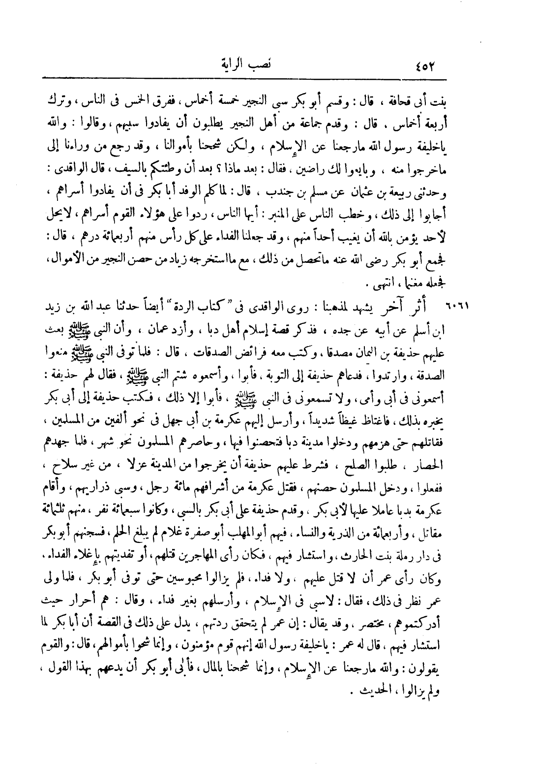 أَثَرٌ آخَرُ يَشْهَدُ لِمَذْهَبِنَا: رَوَى الْوَاقِدِيُّ فِي "كِتَابِ الرِّدَّةِ" أَيْضًا حَدَّثَنَا عَبْدُ اللَّهِ بْنُ زَيْدِ بْنِ أَسْلَمَ عَنْ أَبِيهِ عَنْ جَدِّهِ، فَذَكَرَ قِصَّةَ إسْلَامِ أَهْلِ دَبَا، وَأَزْدِ عُمَانَ، وَأَنَّ النَّبِيَّ صَلَّى اللَّهُ عَلَيْهِ وَسَلَّمَ بَعَثَ عَلَيْهِمْ حُذَيْفَةَ بْنَ الْيَمَانِ مُصَدِّقًا، وَكَتَبَ مَعَهُ فَرَائِضَ الصَّدَقَاتِ، قَالَ: فَلَمَّا تُوُفِّيَ النَّبِيُّ صَلَّى اللَّهُ عَلَيْهِ وَسَلَّمَ مَنَعُوا الصَّدَقَةَ، وارتدوا، فدعاهم إلى التوبة، وَأَسْمَعُوهُ شَتْمَ النَّبِيِّ صَلَّى اللَّهُ عَلَيْهِ وَسَلَّمَ، فَقَالَ لَهُمْ حُذَيْفَةُ: أَسْمِعُونِي فِي أَبِي وَأُمِّي، وَلَا تُسْمِعُونِي فِي النَّبِيِّ صَلَّى اللَّهُ عَلَيْهِ وَسَلَّمَ، فَأَبَوْا إلَّا ذَلِكَ، فَكَتَبَ حُذَيْفَةُ إلَى أبو بَكْرٍ يُخْبِرُهُ بِذَلِكَ، فَاغْتَاظَ غَيْظًا شَدِيدًا، وَأَرْسَلَ إلَيْهِمْ عِكْرِمَةَ بْنَ أَبِي جَهْلٍ فِي نَحْوِ أَلْفَيْنِ مِنْ الْمُسْلِمِينَ، فَقَاتَلُوهُمْ حَتَّى هَزَمَهُمْ وَدَخَلُوا مَدِينَةَ دَبَا فَتَحَصَّنُوا فِيهَا، وَحَاصَرَهُمْ الْمُسْلِمُونَ نَحْوَ شَهْرٍ، فَلَمَّا جَهَدَهُمْ الْحِصَارُ، طَلَبُوا الصُّلْحَ، فَشَرَطَ عَلَيْهِمْ حُذَيْفَةُ أَنْ يَخْرُجُوا مِنْ الْمَدِينَةِ عُزْلًا، مِنْ غَيْرِ سِلَاحٍ، فَفَعَلُوا، وَدَخَلَ الْمُسْلِمُونَ حِصْنَهُمْ، فَقَتَلَ عِكْرِمَةُ مِنْ أَشْرَافِهِمْ مِائَةَ رَجُلٍ، وَسَبَى ذَرَارِيَّهُمْ، وَأَقَامَ عِكْرِمَةُ بِدَبَا عَامِلًا عَلَيْهَا لِأَبِي بَكْرٍ، وَقَدِمَ حُذَيْفَةُ عَلَى أَبِي بَكْرٍ بِالسَّبْيِ، وَكَانُوا سَبْعَمِائَةِ نفر، منهم ثلثمائة مُقَاتِلٍ، وَأَرْبَعُمِائَةٍ مِنْ الذُّرِّيَّةِ وَالنِّسَاءِ، فِيهِمْ أَبُو الْمُهَلَّبِ أَبُو صُفْرَةَ غُلَامٌ لَمْ يَبْلُغْ الْحُلُمَ، فَسَجَنَهُمْ أَبُو بَكْرٍ فِي دَارِ رَمْلَةَ بِنْتِ الْحَارِثِ، وَاسْتَشَارَ فِيهِمْ، فَكَانَ رَأْيُ الْمُهَاجِرِينَ قَتْلَهُمْ، أَوْ تَفْدِيَتَهُمْ بِإِغْلَاءِ الْفِدَاءِ، وَكَانَ رَأْيُ عُمَرَ أَنْ لَا قَتْلَ عَلَيْهِمْ، وَلَا فِدَاءَ، فَلَمْ يَزَالُوا مَحْبُوسِينَ حَتَّى تُوُفِّيَ أَبُو بَكْرٍ، فَلَمَّا وَلِيَ عُمَرُ نَظَرَ فِي ذَلِكَ، فَقَالَ لَا سَبْيَ فِي الْإِسْلَامِ، وَأَرْسَلَهُمْ بِغَيْرِ فِدَاءٍ، وَقَالَ: هُمْ أَحْرَارٌ حَيْثُ أَدْرَكْتُمُوهُمْ، مُخْتَصَرٌ، وقد يقال: إنَّ عُمَرَ لَمْ يَتَحَقَّقْ رِدَّتَهُمْ، يَدُلُّ عَلَى ذَلِكَ فِي الْقِصَّةِ أَنَّ أَبَا بَكْرٍ لَمَّا اسْتَشَارَ فِيهِمْ، قَالَ لَهُ عُمَرُ: يَا خَلِيفَةَ رَسُولِ اللَّهِ إنَّهُمْ قَوْمٌ مُؤْمِنُونَ، وَإِنَّمَا شَحُّوا بِأَمْوَالِهِمْ، قَالَ: وَالْقَوْمُ يَقُولُونَ: وَاَللَّهِ مَا رَجَعْنَا عَنْ الْإِسْلَامِ، وَإِنَّمَا شَحَحْنَا بِالْمَالِ، فَأَبَى أَبُو بَكْرٍ أَنْ يَدَعَهُمْ بِهَذَا الْقَوْلِ، وَلَمْ يَزَالُوا، الْحَدِيثُ.