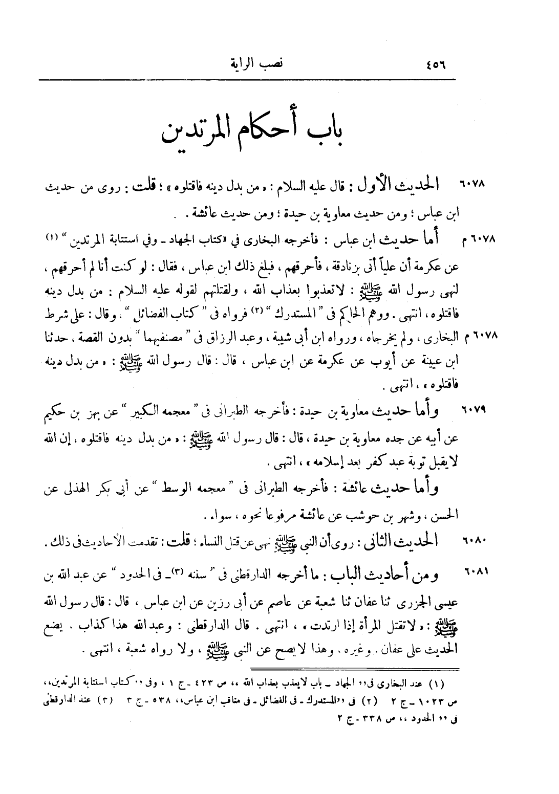 أَمَّا حَدِيثُ ابْنِ عَبَّاسٍ: فَأَخْرَجَهُ الْبُخَارِيُّ فِي "كِتَابِ الْجِهَادِ - فِي اسْتِتَابَةِ الْمُرْتَدِّينَ" 1 عَنْ عِكْرِمَةَ أَنَّ عَلِيًّا أُتِيَ بِزَنَادِقَةٍ، فَأَحْرَقَهُمْ، فَبَلَغَ ذَلِكَ ابْنَ عَبَّاسٍ، فَقَالَ: لَوْ كُنْت أَنَا لَمْ أُحْرِقْهُمْ، لِنَهْيِ رَسُولِ اللَّهِ صَلَّى اللَّهُ عَلَيْهِ وَسَلَّمَ: " لَا تُعَذِّبُوا بِعَذَابِ اللَّهِ"، وَلَقَتَلْتُهُمْ لِقَوْلِهِ عليه السلام: "مَنْ بَدَّلَ دِينَهُ فَاقْتُلُوهُ"، انْتَهَى. وَوَهَمَ الْحَاكِمُ فِي "الْمُسْتَدْرَكِ" 2 فَرَوَاهُ فِي "كِتَابِ الْفَضَائِلِ"، وَقَالَ: عَلَى شَرْطِ الْبُخَارِيِّ، وَلَمْ يُخَرِّجَاهُ، وَرَوَاهُ ابْنُ أَبِي شَيْبَةَ، وَعَبْدُ الرَّزَّاقِ فِي "مُصَنَّفَيْهِمَا" بِدُونِ الْقِصَّةِ، حَدَّثَنَا ابْنُ عُيَيْنَةَ عَنْ أَيُّوبَ عَنْ عِكْرِمَةَ عَنْ ابْنِ عَبَّاسٍ، قَالَ: قَالَ رَسُولُ اللَّهِ صَلَّى اللَّهُ عَلَيْهِ وَسَلَّمَ: "مَنْ بَدَّلَ دِينَهُ فَاقْتُلُوهُ"، انْتَهَى.