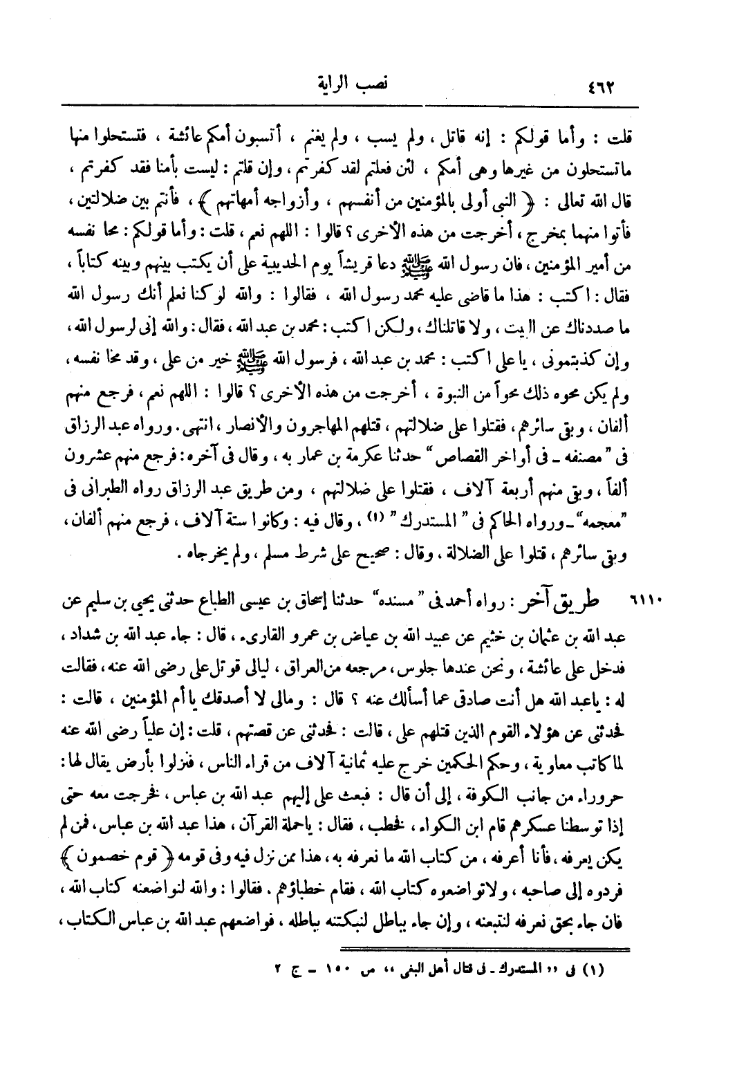 قُلْتُ: وَأَمَّا قَوْلُكُمْ: إنَّهُ قَاتَلَ، وَلَمْ يَسْبِ، وَلَمْ يَغْنَمْ، أَتَسْبُونَ أُمَّكُمْ عَائِشَةَ، فَتَسْتَحِلُّوا مِنْهَا مَا تَسْتَحِلُّونَ مِنْ غَيْرِهَا وَهِيَ أُمُّكُمْ، لَئِنْ فَعَلْتُمْ لَقَدْ كَفَرْتُمْ، وَإِنْ قُلْتُمْ: لَيْسَتْ بِأُمِّنَا فَقَدْ كَفَرْتُمْ، قَالَ اللَّهُ تَعَالَى: {النَّبِيُّ أَوْلَى بِالْمُؤْمِنِينَ مِنْ أَنْفُسِهِمْ وَأَزْوَاجُهُ أُمَّهَاتُهُمْ} ، فَأَنْتُمْ بَيْنَ ضَلَالَتَيْنِ، فَأْتُوا مِنْهُمَا بِمَخْرَجٍ، أَخَرَجْتُ مِنْ هَذِهِ الْأُخْرَى؟ قَالُوا: اللَّهُمَّ نَعَمْ، قُلْت: وَأَمَّا قَوْلُكُمْ: مَحَا نَفْسَهُ مِنْ أَمِيرِ الْمُؤْمِنِينَ، فَإِنَّ رَسُولَ اللَّهِ صَلَّى اللَّهُ عَلَيْهِ وَسَلَّمَ دَعَا قُرَيْشًا يَوْمَ الْحُدَيْبِيَةِ عَلَى أَنْ يَكْتُبَ بَيْنَهُمْ وَبَيْنَهُ كِتَابًا، فَقَالَ: " اُكْتُبْ: هَذَا ما قضى عَلَيْهِ مُحَمَّدٌ رَسُولُ اللَّهِ"، فَقَالُوا: وَاَللَّهِ لَوْ كُنَّا نَعْلَمُ أَنَّك رَسُولُ اللَّهِ مَا صَدَدْنَاك عَنْ الْبَيْتِ، وَلَا قَاتَلْنَاك، وَلَكِنْ اُكْتُبْ: مُحَمَّدُ بْنُ عَبْدِ اللَّهِ، فقال: " وإني لَرَسُولُ اللَّهِ، وَإِنْ كَذَّبْتُمُونِي، يَا عَلِيُّ اُكْتُبْ: مُحَمَّدُ بْنُ عَبْدِ اللَّهِ"، فَرَسُولُ اللَّهِ صَلَّى اللَّهُ عَلَيْهِ وَسَلَّمَ خَيْرٌ مِنْ عَلِيٍّ، وَقَدْ مَحَا نَفْسَهُ، وَلَمْ يَكُنْ مَحْوُهُ ذَلِكَ مَحْوًا مِنْ النُّبُوَّةِ، أَخَرَجْتُ مِنْ هَذِهِ الْأُخْرَى؟ قَالُوا: اللَّهُمَّ نَعَمْ، فَرَجَعَ مِنْهُمْ أَلْفَانِ، وَبَقِيَ سَائِرُهُمْ، فَقُتِلُوا عَلَى ضَلَالَتِهِمْ، قَتَلَهُمْ الْمُهَاجِرُونَ وَالْأَنْصَارُ، انْتَهَى. وَرَوَاهُ عَبْدُ الرَّزَّاقِ فِي "مُصَنَّفِهِ - فِي أَوَاخِرِ الْقِصَاصِ" حَدَّثَنَا عِكْرِمَةُ بْنُ عَمَّارٍ بِهِ، وَقَالَ فِي آخِرِهِ: فَرَجَعَ مِنْهُمْ عِشْرُونَ أَلْفًا، وَبَقِيَ مِنْهُمْ أَرْبَعَةُ آلَافٍ، فَقُتِلُوا عَلَى ضَلَالَتِهِمْ، وَمِنْ طَرِيقِ عَبْدِ الرَّزَّاقِ رَوَاهُ الطَّبَرَانِيُّ فِي "مُعْجَمِهِ" - وَرَوَاهُ الْحَاكِمُ فِي "الْمُسْتَدْرَكِ"1، وَقَالَ فِيهِ: وَكَانُوا سِتَّةَ آلَافٍ، فَرَجَعَ مِنْهُمْ أَلْفَانِ، وَبَقِيَ سَائِرُهُمْ، قُتِلُوا عَلَى ضلالة، وَقَالَ: صَحِيحٌ عَلَى شَرْطِ مُسْلِمٍ، وَلَمْ يُخَرِّجَاهُ.