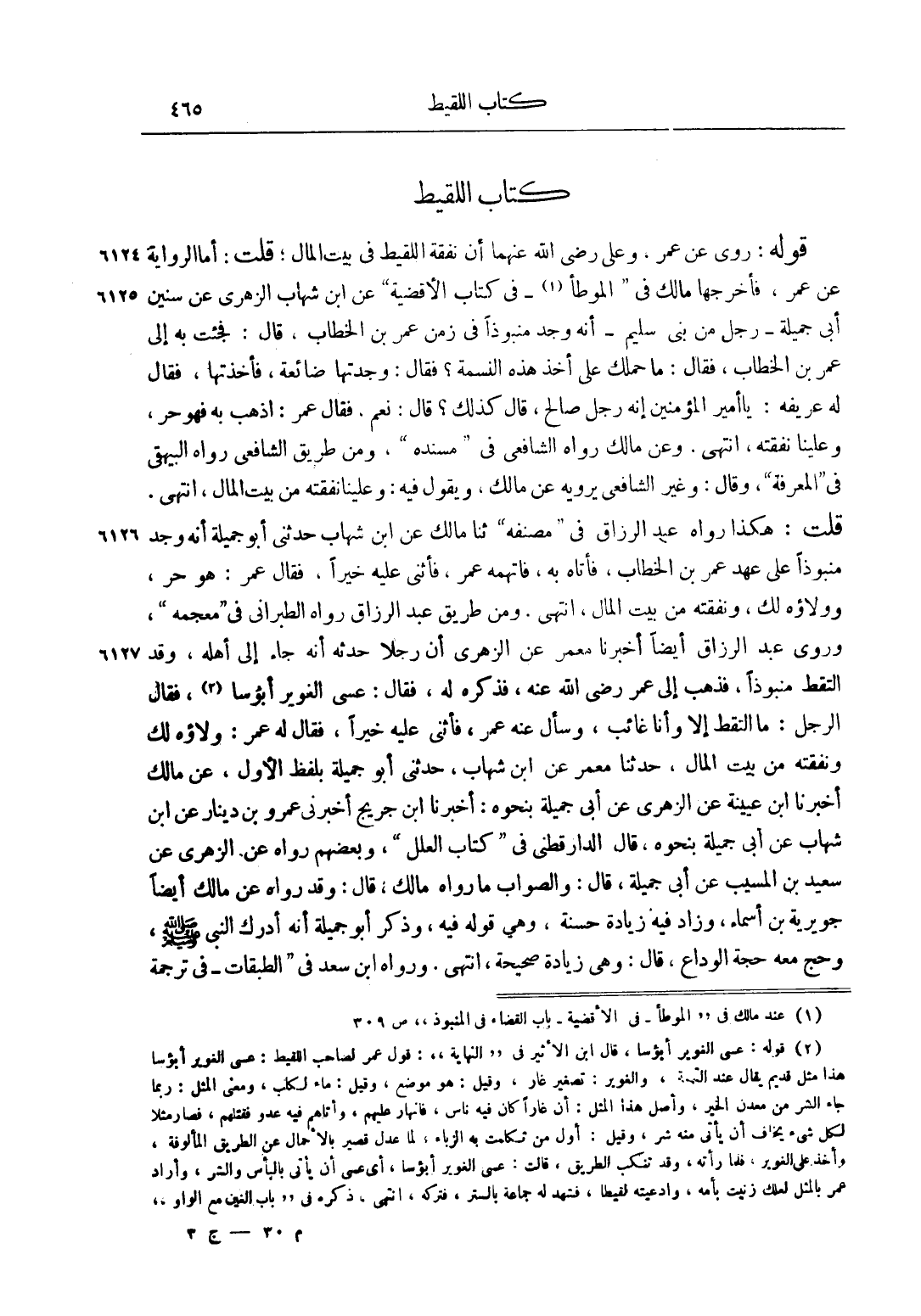 قَوْلُهُ: رُوِيَ عَنْ عُمَرَ، وَعَلِيٍّ رضي الله عنهما أَنَّ نَفَقَةَ اللَّقِيطِ فِي بَيْتِ الْمَالِ، قُلْت: أَمَّا الرِّوَايَةُ عَنْ عُمَرَ، فَأَخْرَجَهَا مَالِكٌ فِي "الْمُوَطَّإِ 1 - فِي كِتَابِ الْأَقْضِيَةِ" عَنْ ابْنِ شِهَابٍ الزُّهْرِيِّ عَنْ سُنَيْنٍ أَبِي جَمِيلَةَ - رَجُلٍ مِنْ بَنِي سُلَيْمٍ - أَنَّهُ وَجَدَ مَنْبُوذًا فِي زَمَنِ عُمَرَ بْنِ الْخَطَّابِ، قَالَ: فَجِئْت بِهِ إلَى عُمَرَ بْنِ الْخَطَّابِ، فَقَالَ: مَا حَمَلَك عَلَى أَخْذِ هَذِهِ النَّسَمَةِ؟ فَقَالَ: وَجَدْتُهَا ضَائِعَةً، فَأَخَذْتُهَا، فَقَالَ لَهُ عَرِيفُهُ: يَا أَمِيرَ الْمُؤْمِنِينَ إنَّهُ رَجُلٌ صَالِحٌ، قَالَ: كَذَلِكَ؟ قَالَ: نَعَمْ، فَقَالَ عُمَرُ: اذْهَبْ بِهِ فَهُوَ حُرٌّ، وَعَلَيْنَا نَفَقَتُهُ، انْتَهَى. وَعَنْ مَالِكٍ رَوَاهُ الشَّافِعِيُّ فِي "مُسْنَدِهِ"، وَمِنْ طَرِيقِ الشَّافِعِيِّ رَوَاهُ الْبَيْهَقِيُّ فِي "الْمَعْرِفَةِ"، وَقَالَ: وَغَيْرُ الشَّافِعِيِّ يَرْوِيهِ عَنْ مَالِكٍ، وَيَقُولُ فِيهِ: وَعَلَيْنَا نَفَقَتُهُ مِنْ بَيْتِ الْمَالِ، انْتَهَى. قُلْت: هَكَذَا رَوَاهُ عَبْدُ الرَّزَّاقِ فِي "مُصَنَّفِهِ" ثَنَا مَالِكٌ عَنْ ابْنِ شِهَابٍ حَدَّثَنِي أَبُو جَمِيلَةَ أَنَّهُ وَجَدَ مَنْبُوذًا عَلَى عَهْدِ عُمَرَ بْنِ الْخَطَّابِ، فَأَتَاهُ بِهِ، فَاتَّهَمَهُ عُمَرُ، فَأُثْنِيَ عَلَيْهِ خَيْرًا، فَقَالَ عُمَرُ: هُوَ حُرٌّ، وَوَلَاؤُهُ لَك، وَنَفَقَتُهُ مِنْ بَيْتِ الْمَالِ، انْتَهَى. وَمِنْ طَرِيقِ عَبْدِ الرَّزَّاقِ رَوَاهُ الطَّبَرَانِيُّ فِي "مُعْجَمِهِ"، وَرَوَى عَبْدُ الرَّزَّاقِ أَيْضًا أَخْبَرَنَا مَعْمَرٌ عَنْ الزُّهْرِيِّ أَنَّ رَجُلًا حَدَّثَهُ أَنَّهُ جَاءَ إلَى أَهْلِهِ، وَقَدْ الْتَقَطَ مَنْبُوذًا، فَذَهَبَ إلَى عُمَرَ رضي الله عنه، فَذَكَرَهُ لَهُ، فَقَالَ: عَسَى الْغُوَيْرُ أَبُؤْسًا2، فَقَالَ الرَّجُلُ: مَا الْتَقَطَ إلَّا وَأَنَا غَائِبٌ، وَسَأَلَ عَنْهُ عُمَرُ، فَأُثْنِي عَلَيْهِ خَيْرًا، فَقَالَ لَهُ عُمَرُ: وَلَاؤُهُ لَك وَنَفَقَتُهُ مِنْ بَيْتِ الْمَالِ، حَدَّثَنَا مَعْمَرٌ عَنْ ابْنِ شِهَابٍ، حَدَّثَنِي أَبُو جَمِيلَةَ بِلَفْظِ الْأَوَّلِ، عَنْ مَالِكٍ أَخْبَرَنَا ابْنُ عُيَيْنَةَ عَنْ الزُّهْرِيِّ عَنْ أَبِي جَمِيلَةَ بِنَحْوِهِ: أَخْبَرَنَا ابْنُ جُرَيْجٍ أَخْبَرَنِي عَمْرُو بْنُ دِينَارٍ عَنْ ابْنِ شِهَابٍ عَنْ أَبِي جَمِيلَةَ بِنَحْوِهِ، قَالَ الدَّارَقُطْنِيُّ فِي "كِتَابِ الْعِلَلِ"، وَبَعْضُهُمْ رَوَاهُ عَنْ الزُّهْرِيِّ عَنْ سَعِيدِ بْنِ الْمُسَيِّبِ عَنْ أَبِي جَمِيلَةَ، قَالَ: وَالصَّوَابُ مَا رَوَاهُ مَالِكٌ، قَالَ: وَقَدْ رَوَاهُ عَنْ مَالِكٍ أَيْضًا جَوَيْرِيَةَ بْنُ أَسْمَاءَ، وَزَادَ فِيهِ زِيَادَةً حَسَنَةً، وَبَيَّنَ قَوْلَهُ فِيهِ، وَذَكَرَ أَبُو جَمِيلَةَ أَنَّهُ أَدْرَكَ النَّبِيَّ صَلَّى اللَّهُ عَلَيْهِ وَسَلَّمَ، وَحَجَّ مَعَهُ حَجَّةَ الْوَدَاعِ، قَالَ: وَهِيَ زِيَادَةٌ صَحِيحَةٌ، انْتَهَى. وَرَوَاهُ ابْنُ سَعْدٍ فِي "الطَّبَقَاتِ - فِي تَرْجَمَةِ