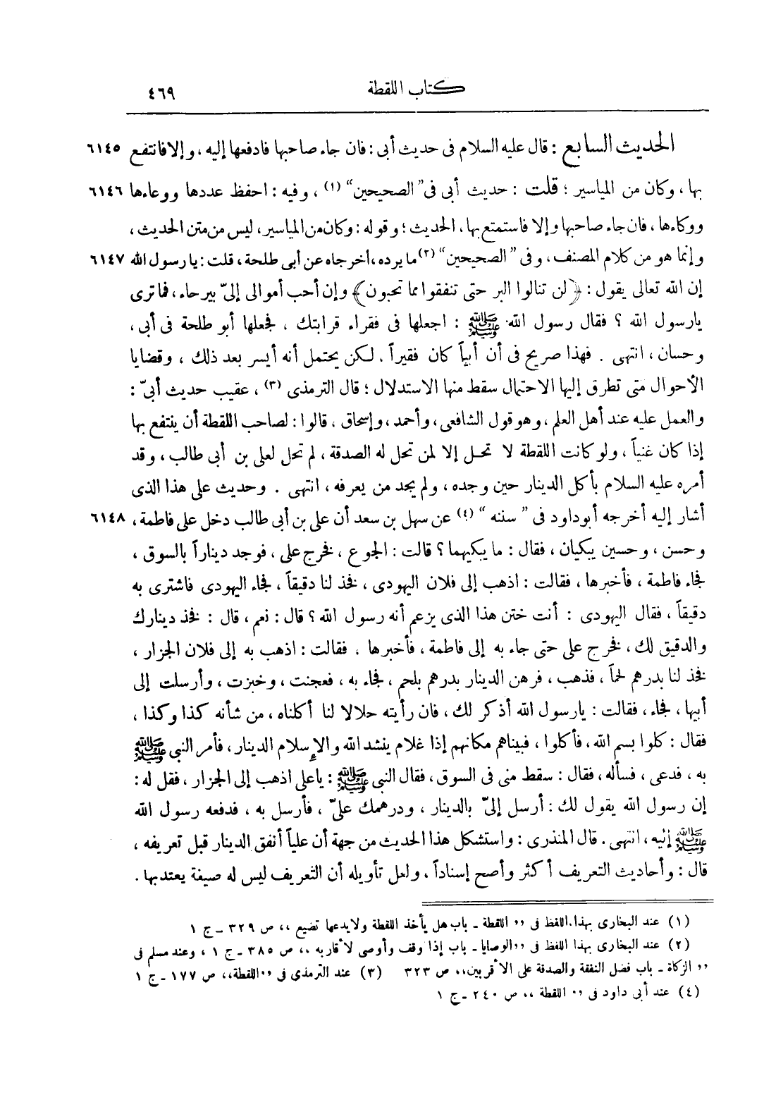 الْحَدِيثُ السَّابِعُ: قَالَ عليه السلام فِي حَدِيثِ أُبَيٍّ: "فَإِنْ جَاءَ صَاحِبُهَا فَادْفَعْهَا إلَيْهِ، وَإِلَّا فَانْتَفِعْ بِهَا"، وَكَانَ مِنْ الْمَيَاسِيرِ، قُلْت: حَدِيثُ أُبَيٍّ فِي "الصَّحِيحَيْنِ"1، وَفِيهِ: احْفَظْ عددها ووعائها وَوِكَاءَهَا، فَإِنْ جَاءَ صَاحِبُهَا وَإِلَّا فَاسْتَمْتِعْ بِهَا، الْحَدِيثُ، وَقَوْلُهُ: وَكَانَ مِنْ الْمَيَاسِيرِ، لَيْسَ مِنْ مَتْنِ الْحَدِيثِ، وَإِنَّمَا هُوَ مِنْ كَلَامِ الْمُصَنِّفِ، وَفِي "الصَّحِيحَيْنِ" 2 مَا يَرُدُّهُ، أَخْرَجَا عَنْ أَبِي طَلْحَةَ، قُلْت: يَا رَسُولَ اللَّهِ إنَّ اللَّهَ تَعَالَى يَقُولُ: {لَنْ تَنَالُوا الْبِرَّ حَتَّى تُنْفِقُوا مِمَّا تُحِبُّونَ} وَإِنَّ أَحَبَّ أَمْوَالِي إلَيَّ بَيْرُحَاءُ، فَمَا تَرَى يَا رَسُولَ اللَّهِ؟ فَقَالَ رَسُولُ اللَّهِ صَلَّى اللَّهُ عَلَيْهِ وَسَلَّمَ: " اجْعَلْهَا فِي فُقَرَاءِ قَرَابَتِك"، فَجَعَلَهَا أَبُو طَلْحَةَ فِي أُبَيٍّ، وَحَسَّانَ، انْتَهَى. فهذا صريح بأن أُبَيًّا كَانَ فَقِيرًا، لَكِنْ يُحْتَمَلُ أَنَّهُ أَيْسَرَ بَعْدَ ذَلِكَ، وَقَضَايَا الْأَحْوَالِ مَتَى تَطَرَّقَ إلَيْهَا الِاحْتِمَالُ سَقَطَ مِنْهَا الِاسْتِدْلَال، قَالَ التِّرْمِذِيُّ3، عَقِيبَ حَدِيثِ أُبَيٍّ: وَالْعَمَلُ عَلَيْهِ عِنْدَ أَهْلِ الْعِلْمِ، وَهُوَ قَوْلُ الشَّافِعِيِّ، وَأَحْمَدَ، وَإِسْحَاقَ، قَالُوا: لِصَاحِبِ اللُّقَطَةِ أَنْ يَنْتَفِعَ بِهَا إذَا كَانَ غَنِيًّا، وَلَوْ كَانَتْ اللُّقَطَةُ لَا تَحِلُّ، إلَّا لِمَنْ تَحِلُّ لَهُ الصَّدَقَةُ، لَمْ تَحِلَّ لِعَلِيِّ بْنِ أَبِي طَالِبٍ، وَقَدْ أَمَرَهُ عليه السلام بِأَكْلِ الدِّينَارِ حِينَ وَجَدَهُ، وَلَمْ يَجِدْ مَنْ يَعْرِفُهُ، انْتَهَى. وَحَدِيثُ عَلِيٍّ هَذَا الَّذِي أَشَارَ إلَيْهِ أَخْرَجَهُ أَبُو دَاوُد فِي "سُنَنِهِ"4 عَنْ سَهْلِ بْنِ سَعْدٍ أَنَّ عَلِيَّ بْنَ أَبِي طَالِبٍ دَخَلَ عَلَى فَاطِمَةَ، وَحَسَنٌ، وَحُسَيْنٌ يَبْكِيَانِ، فَقَالَ: مَا يُبْكِيهِمَا؟ قَالَتْ: الْجُوعُ، فَخَرَجَ عَلِيٌّ، فَوَجَدَ دِينَارًا بِالسُّوقِ، فَجَاءَ فَاطِمَةَ، فَأَخْبَرَهَا، فَقَالَتْ: اذْهَبْ إلَى فُلَانٍ الْيَهُودِيِّ، فَخُذْ لَنَا دَقِيقًا، فَجَاءَ الْيَهُودِيُّ فَاشْتَرَى بِهِ دَقِيقًا، فَقَالَ الْيَهُودِيُّ: أَنْتَ خَتَنُ هَذَا الَّذِي يَزْعُمُ أَنَّهُ رَسُولُ اللَّهِ؟ قَالَ: نَعَمْ، قَالَ: فَخُذْ دِينَارَك وَالدَّقِيقُ لَك، فَخَرَجَ عَلِيٌّ حَتَّى جَاءَ بِهِ إلَى فَاطِمَةَ، فَأَخْبَرَهَا، فَقَالَتْ: اذْهَبْ بِهِ إلَى فُلَانٍ الْجَزَّارِ، فَخُذْ لَنَا بِدِرْهَمٍ لَحْمًا، فَذَهَبَ، فَرَهَنَ الدِّينَارَ بِدِرْهَمٍ بِلَحْمٍ، فَجَاءَ بِهِ، فَعَجَنَتْ، وَخَبَزَتْ، وَأَرْسَلَتْ إلَى أَبِيهَا، فَجَاءَ، فَقَالَتْ: يَا رَسُولَ اللَّهِ أَذْكُرُ لَك، فَإِنْ رَأَيْتَهُ حَلَالًا لَنَا أَكَلْنَاهُ، مِنْ شَأْنِهِ كَذَا وَكَذَا، فَقَالَ: " كُلُوا باسم الله"، فأكلوا، فبيناهم مَكَانَهُمْ إذَا غُلَامٌ يُنْشِدُ اللَّهَ وَالْإِسْلَامَ الدِّينَارَ، فَأَمَرَ النَّبِيُّ صَلَّى اللَّهُ عَلَيْهِ وَسَلَّمَ بِهِ، فَدُعِيَ، فَسَأَلَهُ، فَقَالَ: سَقَطَ مِنِّي فِي السُّوقِ، فَقَالَ النَّبِيُّ صَلَّى اللَّهُ عَلَيْهِ وَسَلَّمَ: " يَا عَلِيُّ اذْهَبْ إلَى الْجَزَّارِ، فَقُلْ لَهُ: إنَّ رَسُولَ اللَّهِ يَقُولُ لَك: أَرْسِلْ إلَيَّ بِالدِّينَارِ، وَدِرْهَمُك عَلَيَّ"، فَأَرْسَلَ بِهِ، فَدَفَعَهُ رَسُولُ اللَّهِ صَلَّى اللَّهُ عَلَيْهِ وَسَلَّمَ إلَيْهِ، انْتَهَى. قَالَ الْمُنْذِرِيُّ: وَاسْتُشْكِلَ هَذَا الْحَدِيثُ مِنْ جِهَةِ أَنَّ عَلِيًّا أَنْفَقَ الدِّينَارَ قَبْلَ تَعْرِيفِهِ، قَالَ: وَأَحَادِيثُ التَّعْرِيفِ أَكْثَرُ وَأَصَحُّ إسْنَادًا، وَلَعَلَّ ت