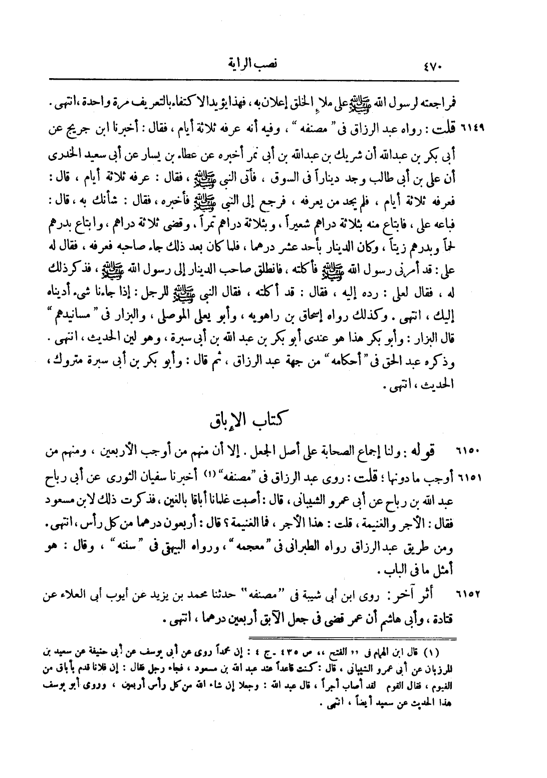 1 قال ابن الهمام في "الفتح" ص 335 - ج 4: إن محمداً روى عن أبي يوسف عن أبي حنيفة عن سعيد بن المرزبان عن أبي عمرو الشيباني، قال: كنت قاعداً عند عبد الله بن مسعود، فجاء رجل فقال: إن فلاناً قدم بأباق من الفيوم، فقال القوم لقد أصاب أجراً، قال عبد الله: وجعلا إن شاء الله من كل رأس أربعين، وروى أبو يوسف هذا الحديث عن سعيد أيضاً، انتهى.