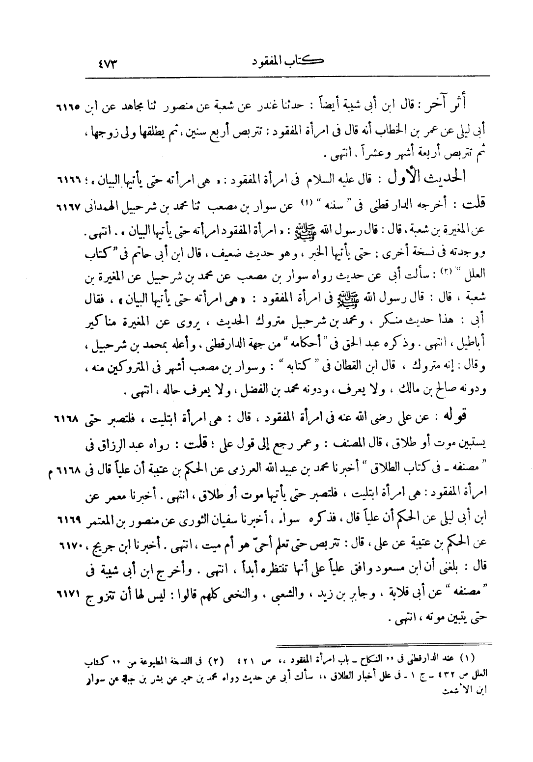 الْحَدِيثُ الْأَوَّلُ: قَالَ عليه السلام فِي امْرَأَةِ الْمَفْقُودِ: "هِيَ امْرَأَتُهُ حَتَّى يَأْتِيَهَا الْبَيَانُ"، قُلْت: أَخْرَجَهُ الدَّارَقُطْنِيُّ فِي "سُنَنِهِ"1 عَنْ سَوَّارِ بْنِ مُصْعَبٍ ثَنَا مُحَمَّدُ بْنُ شُرَحْبِيلَ الْهَمْدَانِيُّ عَنْ الْمُغِيرَةِ بْنِ شُعْبَةَ، قَالَ: قَالَ رَسُولُ اللَّهِ صَلَّى اللَّهُ عَلَيْهِ وَسَلَّمَ: "امْرَأَةُ الْمَفْقُودِ امْرَأَتُهُ حَتَّى يَأْتِيَهَا الْبَيَانُ"، انْتَهَى. وَوَجَدْتُهُ فِي نُسْخَةٍ أُخْرَى: حَتَّى يَأْتِيَهَا الْخَبَرُ، وَهُوَ حَدِيثٌ ضَعِيفٌ، قَالَ ابْنُ أَبِي حَاتِمٍ فِي "كِتَابِ الْعِلَلِ" 2: سَأَلْت أَبِي عَنْ حَدِيثٍ رَوَاهُ سَوَّارُ بْنُ مُصْعَبٍ عَنْ مُحَمَّدِ بْنِ شُرَحْبِيلَ عَنْ الْمُغِيرَةِ بْنِ شُعْبَةَ، قَالَ: قَالَ رَسُولُ اللَّهِ صَلَّى اللَّهُ عَلَيْهِ وَسَلَّمَ فِي امْرَأَةِ الْمَفْقُودِ: "هِيَ امْرَأَتُهُ حَتَّى يَأْتِيَهَا الْبَيَانُ"، فَقَالَ أَبِي: هَذَا حَدِيثٌ مُنْكَرٌ، وَمُحَمَّدُ بْنُ شُرَحْبِيلَ مَتْرُوكُ الْحَدِيثِ، يَرْوِي عَنْ الْمُغِيرَةِ مَنَاكِيرَ أَبَاطِيلَ، انْتَهَى. وَذَكَرَهُ عَبْدُ الْحَقِّ فِي "أَحْكَامِهِ" مِنْ جِهَةِ الدَّارَقُطْنِيِّ، وَأَعَلَّهُ بِمُحَمَّدِ بْنِ شُرَحْبِيلَ، وَقَالَ: إنَّهُ مَتْرُوكٌ، قَالَ ابْنُ الْقَطَّانِ فِي "كِتَابِهِ": وَسَوَّارُ بْنُ مُصْعَبٍ أَشْهَرُ فِي الْمَتْرُوكِينَ مِنْهُ، وَدُونَهُ صَالِحُ بْنُ مَالِكٍ، وَلَا يُعْرَفُ، وَدُونَهُ مُحَمَّدُ بْنُ الْفَضْلِ، وَلَا يُعْرَفُ حَالُهُ، انْتَهَى.