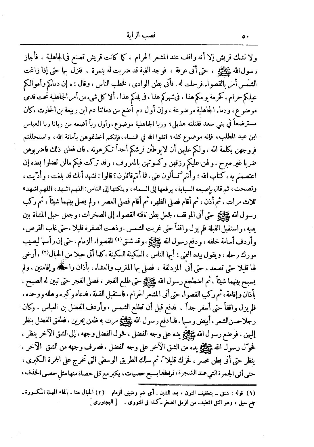 وَلَا تَشُكُّ قُرَيْشٌ إلَّا أَنَّهُ وَاقِفٌ عِنْدَ الْمَشْعَرِ الْحَرَامِ، كَمَا كَانَتْ قُرَيْشٌ تَصْنَعُ فِي الْجَاهِلِيَّةِ، فَأَجَازَ رَسُولُ اللَّهِ صَلَّى اللَّهُ عَلَيْهِ وَسَلَّمَ، حَتَّى أَتَى عَرَفَةَ، فَوَجَدَ الْقُبَّةَ قَدْ ضُرِبَتْ لَهُ بِنَمِرَةَ، فَنَزَلَ بِهَا حَتَّى إذَا زَاغَتْ الشَّمْسُ أَمَرَ بِالْقَصْوَاءِ فَرُحِلَتْ لَهُ، فَأَتَى بَطْنَ الْوَادِي، فَخَطَبَ النَّاسَ، وَقَالَ: "إنَّ دِمَاءَكُمْ وَأَمْوَالَكُمْ عَلَيْكُمْ حَرَامٌ، كَحُرْمَةِ يَوْمِكُمْ هَذَا، فِي شَهْرِكُمْ هَذَا، فِي بَلَدِكُمْ هَذَا، أَلَا كُلُّ شَيْءٍ مِنْ أَمْرِ الْجَاهِلِيَّةِ تَحْتَ قَدَمَيَّ مَوْضُوعٌ، وَدِمَاءُ الْجَاهِلِيَّةِ مَوْضُوعَةٌ، وَإِنَّ أَوَّلَ دَمٍ أَضَعُ مِنْ دِمَائِنَا دَمُ ابْنِ رَبِيعَةَ بْنِ الْحَارِثِ، كَانَ مُسْتَرْضَعًا فِي بَنِي سَعْدٍ فَقَتَلَتْهُ هُذَيْلٌ، وَرِبَا الْجَاهِلِيَّةِ مَوْضُوعٌ، وَأَوَّلُ رِبًا أَضَعُ مِنْ رِبَانَا رِبَا الْعَبَّاسِ بْنِ عَبْدِ الْمُطَّلِبِ، فَإِنَّهُ مَوْضُوعٌ كُلُّهُ، وَاتَّقُوا اللَّهَ فِي النِّسَاءِ، فَإِنَّكُمْ أَخَذْتُمُوهُنَّ بِأَمَانِ اللَّهِ، وَاسْتَحْلَلْتُمْ فُرُوجَهُنَّ بكلمة الله، ولكم عليهن أَنْ لَا يُوطِئْنَ فُرُشَكُمْ أَحَدًا تَكْرَهُونَهُ، فَإِنْ فَعَلْنَ ذَلِكَ فَاضْرِبُوهُنَّ ضَرْبًا غَيْرَ مُبَرِّحٍ، وَلَهُنَّ عَلَيْكُمْ رِزْقُهُنَّ وَكِسْوَتُهُنَّ بِالْمَعْرُوفِ، وَقَدْ تَرَكْت فِيكُمْ مَا لَنْ تَضِلُّوا بَعْدَهُ إنْ اعْتَصَمْتُمْ بِهِ، كِتَابَ اللَّهِ، وَأَنْتُمْ تُسْأَلُونَ عَنِّي، فَمَا أَنْتُمْ قَائِلُونَ؟ قَالُوا: نَشْهَدُ أَنَّك قَدْ بَلَّغْت، وَأَدَّيْت، وَنَصَحْت، فَقَالَ بِإِصْبَعِهِ السَّبَّابَةِ، يَرْفَعُهَا إلَى السَّمَاءِ، وَيَنْكُتُهَا إلَى النَّاسِ: اللَّهُمَّ اشْهَدْ، اللَّهُمَّ اشْهَدْ - ثَلَاثَ مَرَّاتٍ-"، ثُمَّ أَذَّنَ، ثُمَّ أَقَامَ فَصَلَّى الظُّهْرَ، ثُمَّ أَقَامَ فَصَلَّى الْعَصْرَ، وَلَمْ يُصَلِّ بَيْنَهُمَا شَيْئًا، ثُمَّ رَكِبَ رَسُولُ اللَّهِ صَلَّى اللَّهُ عَلَيْهِ وَسَلَّمَ حَتَّى أَتَى الْمَوْقِفَ، فَجَعَلَ بَطْنَ نَاقَتِهِ الْقَصْوَاءِ إلَى الصَّخَرَاتِ، وَجَعَلَ حَبْلَ الْمُشَاةِ بَيْنَ يَدَيْهِ، وَاسْتَقْبَلَ الْقِبْلَةَ فَلَمْ يَزَلْ وَاقِفًا حَتَّى غَرَبَتْ الشَّمْسُ، وَذَهَبَتْ الصُّفْرَةُ قَلِيلًا، حَتَّى غَابَ الْقُرْصُ، وَأَرْدَفَ أُسَامَةَ خَلْفَهُ، وَدَفَعَ رَسُولُ اللَّهِ صَلَّى اللَّهُ عَلَيْهِ وَسَلَّمَ، وَقَدْ شَنَقَ1 لِلْقَصْوَاءِ الزِّمَامَ، حَتَّى إنَّ رَأْسَهَا لَيُصِيبُ مَوْرِكَ رَحْلِهِ، وَيَقُولُ بِيَدِهِ الْيُمْنَى: أَيُّهَا النَّاسُ، السَّكِينَةَ السَّكِينَةَ، كُلَّمَا أَتَى حَبْلًا مِنْ الْحِبَالِ2، أَرْخَى لَهَا قَلِيلًا حَتَّى تَصْعَدَ، حَتَّى أَتَى الْمُزْدَلِفَةَ، فَصَلَّى بِهَا الْمَغْرِبَ وَالْعِشَاءَ، بِأَذَانٍ وَاحِدٍ، وَإِقَامَتَيْنِ، وَلَمْ يُسَبِّحْ بَيْنَهُمَا شَيْئًا، ثُمَّ اضْطَجَعَ رَسُولُ اللَّهِ صَلَّى اللَّهُ عَلَيْهِ وَسَلَّمَ حَتَّى طَلَعَ الْفَجْرُ، فَصَلَّى الْفَجْرَ حَتَّى تَبَيَّنَ لَهُ الصُّبْحُ، بِأَذَانٍ وَإِقَامَةٍ، ثُمَّ رَكِبَ الْقَصْوَاءَ، حَتَّى أَتَى الْمَشْعَرَ الْحَرَامَ، فَاسْتَقْبَلَ الْقِبْلَةَ، فَدَعَاهُ وَكَبَّرَهُ وَهَلَّلَهُ وَوَحَّدَهُ، فَلَمْ يَزَلْ وَاقِفًا حَتَّى أَسْفَرَ جِدًّا، فَدَفَعَ قَبْلَ أَنْ تَطْلُعَ الشَّمْسُ، وَأَرْدَفَ الْفَضْلَ بْنَ الْعَبَّاسِ، وَكَانَ رَجُلًا حَسَنَ الشَّعْرِ، أَبْيَضَ وَسِيمًا، فَلَمَّا دَفَعَ رَسُولُ اللَّهِ صَلَّى اللَّهُ عَلَيْهِ وَسَلَّمَ مَرَّتْ بِهِ ظُعُنٌ يَجْرِينَ، فَطَفِقَ الْفَضْلُ يَنْظُرُ إلَيْهِنَّ، فَوَضَعَ رَس