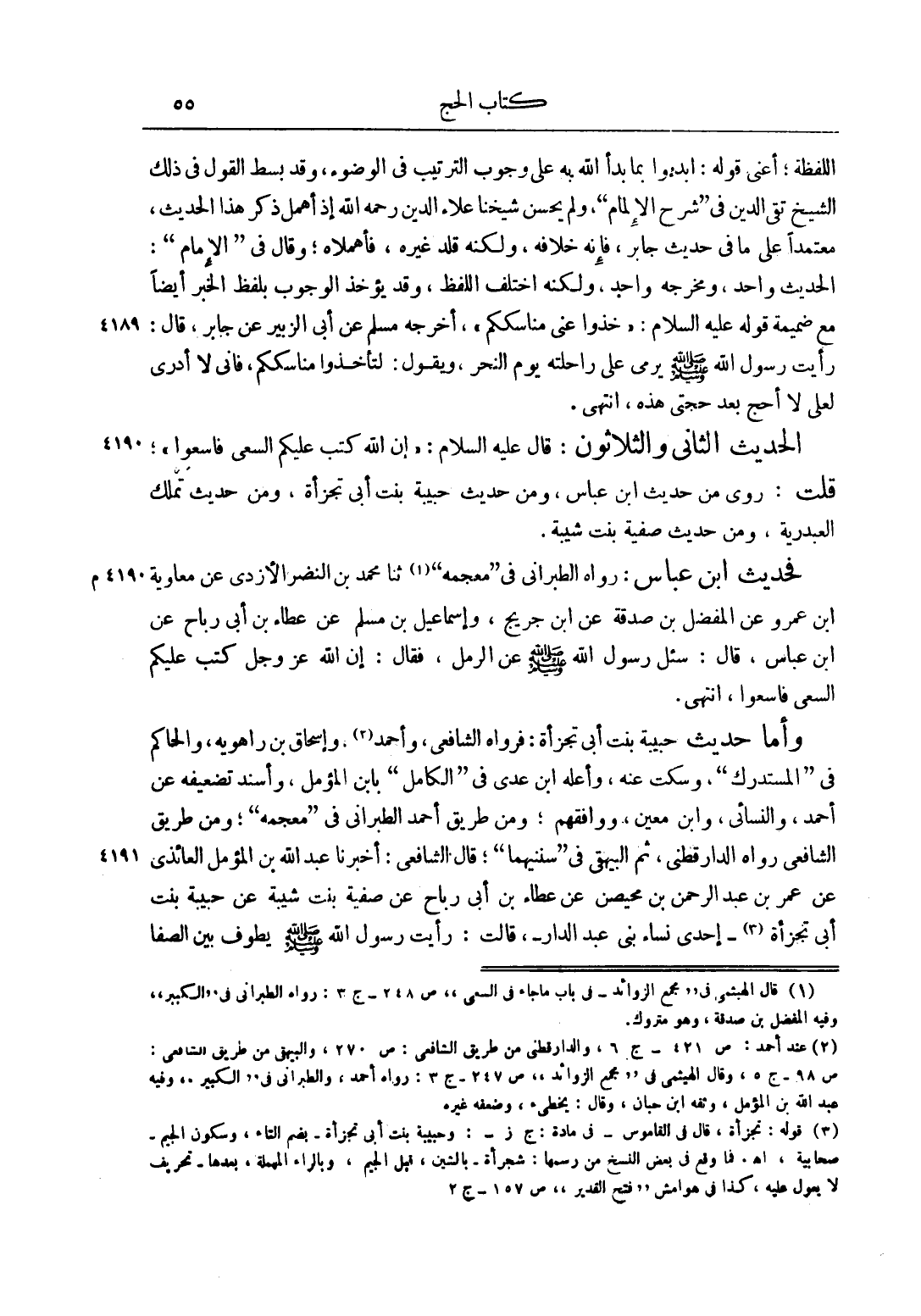 الْحَدِيثُ الثَّانِي وَالثَّلَاثُونَ: قَالَ عليه السلام: "إنَّ اللَّهَ كَتَبَ عَلَيْكُمْ السَّعْيَ فَاسْعَوْا"، قُلْت: رُوِيَ مِنْ حَدِيثِ ابْنِ عَبَّاسٍ، وَمِنْ حَدِيثِ حَبِيبَةَ بِنْتِ أَبِي تُجْزَأَةَ، وَمِنْ حَدِيثِ تَمْلِكَ الْعَبْدَرِيَّةِ، وَمِنْ حَدِيثِ صَفِيَّةَ بِنْتِ شَيْبَةَ.