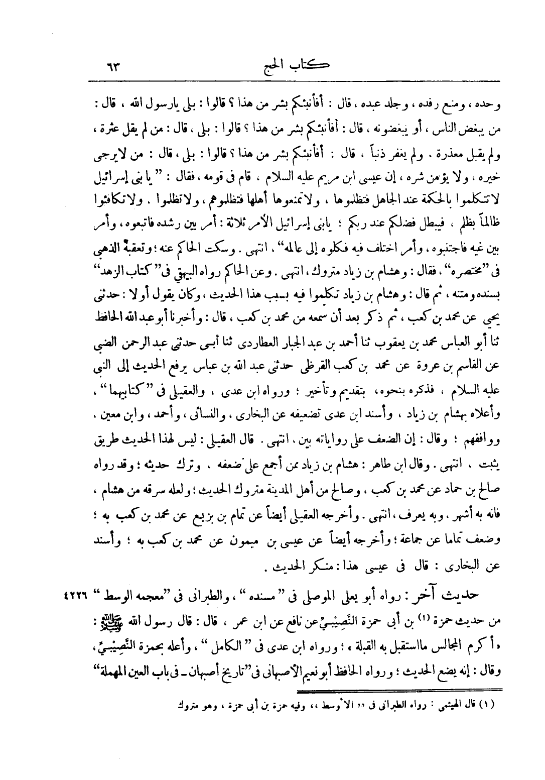 وَحْدَهُ، وَمَنَعَ رِفْدَهُ، وَجَلَدَ عَبْدَهُ، قَالَ: أَفَأُنَبِّئُكُمْ بِشَرٍّ مِنْ هَذَا؟ قَالُوا: بَلَى يَا رَسُولَ اللَّهِ، قَالَ: مَنْ يَبْغُضُ النَّاسَ، أَوْ يَبْغُضُونَهُ، قَالَ: أَفَأُنَبِّئُكُمْ بِشَرٍّ مِنْ هَذَا؟ قَالُوا: بَلَى، قَالَ: مَنْ لَمْ يُقِلْ عَثْرَةً، وَلَمْ يَقْبَلْ مَعْذِرَةً، وَلَمْ يَغْفِرْ ذَنْبًا، قَالَ: أَفَأُنَبِّئُكُمْ بِشَرٍّ مِنْ هَذَا؟ قَالُوا: بَلَى، قَالَ: مَنْ لَا يُرْجَى خَيْرُهُ، وَلَا يُؤْمَنُ شَرُّهُ، إنَّ عِيسَى ابْنَ مَرْيَمَ عليه السلام، قَامَ فِي قَوْمِهِ، فَقَالَ: "يَا بَنِي إسْرَائِيلَ لَا تَتَكَلَّمُوا بِالْحِكْمَةِ عِنْدَ الْجَاهِلِ فَتَظْلِمُوهَا، وَلَا تَمْنَعُوهَا أَهْلَهَا فَتَظْلِمُوهُمْ، وَلَا تَظْلِمُوا، وَلَا تُكَافِئُوا ظَالِمًا بِظُلْمٍ، فَيَبْطُلُ فَضْلُكُمْ عِنْدَ رَبِّكُمْ، يَا بَنِي إسْرَائِيلَ الْأَمْرُ ثَلَاثَةٌ: أَمْرٌ بَيِّنٌ رُشْدُهُ فَاتَّبِعُوهُ، وَأَمْرٌ بَيِّنٌ غَيُّهُ فَاجْتَنِبُوهُ، وَأَمْرٌ اُخْتُلِفَ فِيهِ فَكِلُوهُ إلَى عَالِمِهِ"، انْتَهَى. وَسَكَتَ الْحَاكِمُ عَنْهُ، وَتَعَقَّبَهُ الذَّهَبِيُّ فِي "مُخْتَصَرِهِ"، فَقَالَ: وَهِشَامُ بْنُ زِيَادٍ مَتْرُوكٌ، انْتَهَى. وَعَنْ الْحَاكِمِ رَوَاهُ الْبَيْهَقِيُّ فِي "كِتَابِ الزُّهْدِ" بِسَنَدِهِ وَمَتْنِهِ، ثُمَّ قَالَ: وَهِشَامُ بْنُ زِيَادٍ تَكَلَّمُوا فِيهِ بِسَبَبِ هَذَا الْحَدِيثِ، وَكَانَ يَقُولُ أَوَّلًا: حَدَّثَنِي يَحْيَى عَنْ مُحَمَّدِ بْنِ كَعْبٍ، ثُمَّ ذَكَرَ بَعْدَ أَنْ سَمِعَهُ مِنْ مُحَمَّدِ بْنِ كَعْبٍ، قَالَ: وَأَخْبَرَنَا أَبُو عَبْدِ اللَّهِ الْحَافِظُ ثَنَا أَبُو الْعَبَّاسِ مُحَمَّدُ بْنُ يَعْقُوبَ ثَنَا أَحْمَدُ بْنُ عَبْدِ الْجَبَّارِ الْعُطَارِدِيُّ ثَنَا أَبِي حَدَّثَنِي عَبْدُ الرَّحْمَنِ الضَّبِّيُّ عن قاسم بْنِ عُرْوَةَ عَنْ مُحَمَّدِ بْنِ كَعْبٍ الْقُرَظِيِّ حَدَّثَنِي عَبْدُ اللَّهِ بْنُ عَبَّاسٍ يَرْفَعُ الْحَدِيثَ إلَى النَّبِيِّ عليه السلام، فَذَكَرَ بِنَحْوِهِ، بِتَقْدِيمٍ وَتَأْخِيرٍ، وَرَوَاهُ ابْنُ عَدِيٍّ، وَالْعُقَيْلِيُّ فِي "كِتَابَيْهِمَا"، وَأَعَلَّاهُ بِهِشَامِ بْنِ زِيَادٍ، وَأَسْنَدَ ابْنُ عَدِيٍّ تَضْعِيفَهُ عَنْ الْبُخَارِيِّ، وَالنَّسَائِيُّ، وَأَحْمَدَ، وَابْنِ مَعِينٍ، وَوَافَقَهُمْ، وَقَالَ: إنَّ الضَّعْفَ عَلَى رِوَايَاتِهِ بَيِّنٌ، انْتَهَى. قَالَ الْعُقَيْلِيُّ: لَيْسَ لِهَذَا الْحَدِيثِ طَرِيقٌ يَثْبُتُ، انْتَهَى. وَقَالَ ابْنُ طَاهِرٍ: هِشَامُ بْنُ زِيَادٍ مِمَّنْ أُجْمِعَ عَلَى ضَعْفِهِ، وَتَرْكِ حَدِيثِهِ، وَقَدْ رَوَاهُ صَالِحُ بْنُ حَمَّادٍ عَنْ مُحَمَّدِ بْنِ كَعْبٍ، وَصَالِحٌ مِنْ أَهْلِ الْمَدِينَةِ مَتْرُوكُ الْحَدِيثِ، وَلَعَلَّهُ سَرَقَهُ مِنْ هِشَامٍ، فَإِنَّهُ بِهِ أَشْهَرُ، وَبِهِ يُعْرَفُ، انْتَهَى. وَأَخْرَجَهُ الْعُقَيْلِيُّ أَيْضًا عَنْ تَمَّامِ بْنِ بَزِيعٍ عَنْ مُحَمَّدِ بْنِ كَعْبٍ بِهِ، وَضَعَّفَ تَمَّامًا عَنْ جَمَاعَةٍ، وَأَخْرَجَهُ أَيْضًا عَنْ عِيسَى بْنِ مَيْمُونٍ عَنْ مُحَمَّدِ بْنِ كَعْبٍ بِهِ، وَأَسْنَدَ عَنْ الْبُخَارِيِّ: قَالَ فِي عِيسَى هَذَا: مُنْكَرُ الْحَدِيثِ.