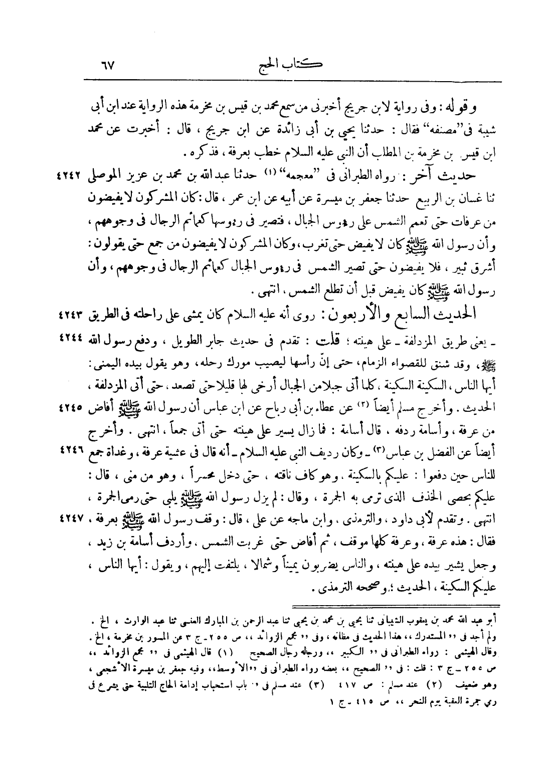 الْحَدِيثُ السَّابِعُ وَالْأَرْبَعُونَ: رُوِيَ أَنَّهُ عليه السلام كَانَ يَمْشِي عَلَى رَاحِلَتِهِ فِي الطَّرِيقِ - يَعْنِي طَرِيقَ الْمُزْدَلِفَةِ - عَلَى هِينَتِهِ، قُلْت: تَقَدَّمَ فِي حَدِيثِ جَابِرٍ الطَّوِيلِ، وَدَفَعَ رَسُولُ اللَّهِ صَلَّى اللَّهُ عَلَيْهِ وَسَلَّمَ، وَقَدْ شَنَقَ لِلْقَصْوَاءِ الزِّمَامَ، حَتَّى رَأْسَهَا لِيُصِيبَ مَوْرِكَ رَحْلِهِ، وَهُوَ يَقُولُ بِيَدِهِ الْيُمْنَى: "أَيُّهَا النَّاسُ، السَّكِينَةَ السَّكِينَةَ"، كُلَّمَا أَتَى جَبَلًا مِنْ الْجِبَالِ أَرْخَى لَهَا قَلِيلًا حَتَّى تَصْعَدَ، حَتَّى أَتَى الْمُزْدَلِفَةَ، الْحَدِيثَ. وَأَخْرَجَ مُسْلِمٌ أَيْضًا 2 عَنْ عَطَاءِ بْنِ أَبِي رَبَاحٍ عَنْ ابْنِ عَبَّاسٍ أَنَّ رَسُولَ اللَّهِ صَلَّى اللَّهُ عَلَيْهِ وَسَلَّمَ أَفَاضَ مِنْ عَرَفَةَ، وَأُسَامَةُ رِدْفَهُ، قَالَ أُسَامَةُ: فَمَا زَالَ يَسِيرُ عَلَى هِينَتِهِ حَتَّى أَتَى جَمْعًا، انْتَهَى. وَأَخْرَجَ أَيْضًا عَنْ الْفَضْلِ بْنِ عَبَّاسٍ 3 - وَكَانَ رَدِيفَ النَّبِيِّ عليه السلام - أَنَّهُ قَالَ فِي عَشِيَّةِ عَرَفَةَ، وَغَدَاةِ جَمْعٍ لِلنَّاسِ حِينَ دَفَعُوا: " عَلَيْكُمْ بِالسَّكِينَةِ"، وَهُوَ كَافٌّ نَاقَتَهُ، حَتَّى دَخَلَ مُحَسِّرًا، وَهُوَ مِنْ مِنًى، قَالَ: " عَلَيْكُمْ بِحَصَى الْخَذْفِ الَّذِي تُرْمَى بِهِ الْجَمْرَةُ"، وَقَالَ: لَمْ يَزَلْ رَسُولُ اللَّهِ صَلَّى اللَّهُ عَلَيْهِ وَسَلَّمَ يُلَبِّي حَتَّى أَتَى الْجَمْرَةَ، انْتَهَى. وَتَقَدَّمَ لِأَبِي دَاوُد، وَالتِّرْمِذِيِّ، وَابْنِ مَاجَهْ عَنْ عَلِيٍّ، قَالَ: وَقَفَ رَسُولُ اللَّهِ صَلَّى اللَّهُ عَلَيْهِ وَسَلَّمَ بِعَرَفَةَ، فَقَالَ: " هَذِهِ عَرَفَةُ، وَعَرَفَةُ كُلُّهَا مَوْقِفٌ"، ثُمَّ أَفَاضَ حَتَّى غَرَبَتْ الشَّمْسُ، وَأَرْدَفَ أُسَامَةَ بْنَ زَيْدٍ، وَجَعَلَ يُشِيرُ بِيَدِهِ عَلَى هِينَتِهِ، وَالنَّاسُ يَضْرِبُونَ يَمِينًا وَشِمَالًا، يَلْتَفِتُ إلَيْهِمْ، وَيَقُولُ: "أيها الناس، عليكم بالسكينة"، الْحَدِيثَ، وَصَحَّحَهُ التِّرْمِذِيُّ.