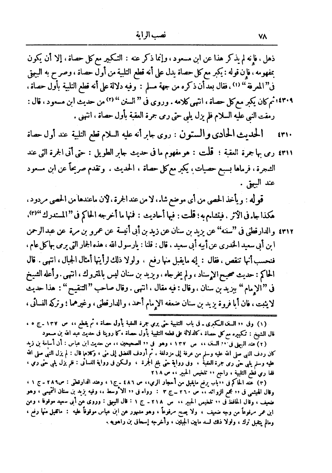1 وفي "السنن الكبرى - في باب التلبية حتى يرمي جمرة العقبة بأول حصاة، ثم يقطع" ص 137 - ج 5، قال الشيخ: تكبيره مع كل حصاة، كالدلالة على قطعه التلبية بأول حصاة، كما روينا في حديث عبد الله بن مسعود.