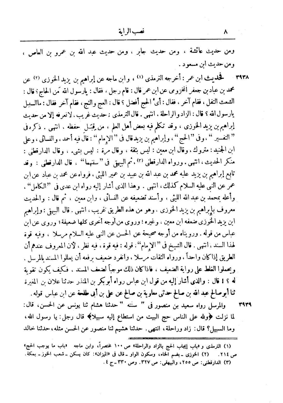 فَحَدِيثُ ابْنِ عُمَرَ: أَخْرَجَهُ التِّرْمِذِيُّ1، وَابْنُ مَاجَهْ عَنْ إبْرَاهِيمَ بْنِ يَزِيدَ الْخُوزِيِّ 2 عَنْ مُحَمَّدِ بْنِ عَبَّادِ بْنِ جَعْفَرٍ الْمَخْزُومِيِّ عَنْ ابْنِ عُمَرَ قَالَ: قَامَ رَجُلٌ، فَقَالَ: يَا رَسُولَ اللَّهِ مَنْ الْحَاجُّ؟ قَالَ: الشَّعِثُ التَّفِلُ، فَقَامَ آخَرُ، فَقَالَ: أَيُّ الْحَجِّ أَفْضَلُ؟ قَالَ: الْعَجُّ وَالثَّجُّ، فَقَامَ آخَرُ فَقَالَ: مَا السَّبِيلُ يَا رَسُولَ اللَّهِ؟ قَالَ: الزَّادُ وَالرَّاحِلَةُ، انْتَهَى. قَالَ التِّرْمِذِيُّ: حَدِيثٌ غَرِيبٌ، لَا نَعْرِفُهُ إلَّا مِنْ حَدِيثِ إبْرَاهِيمَ بْنِ يَزِيدَ الْخُوزِيِّ، وَقَدْ تَكَلَّمَ فِيهِ بَعْضُ أَهْلِ الْعِلْمِ، مِنْ قِبَلِ حِفْظِهِ، انْتَهَى. ذَكَرَهُ فِي "التَّفْسِيرِ"، وَفِي "الْحَجِّ"، وَإِبْرَاهِيمُ بْنُ يَزِيدَ قَالَ فِي "الْإِمَامِ": قَالَ فِيهِ أَحْمَدُ، وَالنَّسَائِيُّ، وَعَلِيُّ بْنُ الْجُنَيْدِ: مَتْرُوكٌ، وَقَالَ ابْنُ مَعِينٍ: لَيْسَ بِثِقَةٍ، وَقَالَ مَرَّةً: لَيْسَ بِشَيْءٍ، وَقَالَ الدَّارَقُطْنِيُّ: مُنْكَرُ الْحَدِيثِ، انْتَهَى. وَرَوَاهُ الدَّارَقُطْنِيُّ 3 ثُمَّ الْبَيْهَقِيُّ فِي "سُنَنِهِمَا"، قَالَ الدَّارَقُطْنِيُّ: وَقَدْ تَابَعَ إبْرَاهِيمَ بْنَ يَزِيدَ عَلَيْهِ مُحَمَّدُ بْنُ عَبْدِ اللَّهِ بْنِ عُبَيْدِ بْنِ عُمَيْرٍ اللَّيْثِيُّ فَرَوَاهُ عَنْ مُحَمَّدِ بْنِ عَبَّادٍ عَنْ ابْنِ عُمَرَ عَنْ النَّبِيِّ عليه السلام كَذَلِكَ، انْتَهَى. وَهَذَا الَّذِي أَشَارَ إلَيْهِ رَوَاهُ ابْنُ عَدِيٍّ فِي "الْكَامِلِ"، وَأَعَلَّهُ بِمُحَمَّدِ بْنِ عَبْدِ اللَّهِ اللَّيْثِيِّ، وَأَسْنَدَ تَضْعِيفَهُ عَنْ النَّسَائِيّ، وَابْنِ مَعِينٍ، ثُمَّ قَالَ: وَالْحَدِيثُ مَعْرُوفٌ بِإِبْرَاهِيمَ بْنِ يَزِيدَ الْخُوزِيِّ، وَهُوَ مِنْ هَذِهِ الطَّرِيقِ غَرِيبٌ، انْتَهَى. قَالَ الْبَيْهَقِيُّ: وَإِبْرَاهِيمُ بْنُ يَزِيدَ الْخُوزِيُّ ضَعَّفَهُ ابْنُ مَعِينٍ، وَغَيْرُهُ، وَرُوِيَ مِنْ أَوْجُهٍ أُخْرَى كُلُّهَا ضَعِيفَةٌ، وَرُوِيَ عَنْ ابْنِ عَبَّاسٍ مِنْ قَوْلِهِ: وَرَوَيْنَاهُ مِنْ أَوْجُهٍ صَحِيحَةٍ عَنْ الْحَسَنِ عَنْ النَّبِيِّ عليه السلام مُرْسَلًا، وَفِيهِ قُوَّةٌ لِهَذَا السَّنَدِ، انْتَهَى. قَالَ الشَّيْخُ فِي "الْإِمَامِ"، قَوْلُهُ فِيهِ قُوَّةٌ، فِيهِ نَظَرٌ، لِأَنَّ الْمَعْرُوفَ عِنْدَهُمْ أَنَّ الطَّرِيقَ إذَا كَانَ وَاحِدًا، وَرَوَاهُ الثِّقَاتُ مُرْسَلًا، وَانْفَرَدَ ضَعِيفٌ بِرَفْعِهِ أَنْ يُعَلِّلُوا الْمُسْنَدَ بِالْمُرْسَلِ، وَيَحْمِلُوا الْغَلَطَ عَلَى رِوَايَةِ الضَّعِيفِ، فَإِذَا كَانَ ذَلِكَ مُوجِبًا لِضَعْفِ الْمُسْنَدِ، فَكَيْفَ يَكُونُ تَقْوِيَةً لَهُ؟! قَالَ: وَاَلَّذِي أَشَارَ إلَيْهِ مِنْ قَوْلِ ابْنِ عَبَّاسٍ رَوَاهُ أَبُو بَكْرِ بْنُ الْمُنْذِرِ حَدَّثَنَا عَلَّانُ بْنُ الْمُغِيرَةِ ثَنَا أَبُو صَالِحٍ عَبْدُ اللَّهِ بْنُ صَالِحٍ حَدَّثَنِي مُعَاوِيَةُ بْنُ صَالِحٍ عَنْ عَلِيِّ بْنِ أَبِي طَلْحَةَ عَنْ ابْنِ عَبَّاسٍ. قَوْلُهُ: وَالْمُرْسَلُ رَوَاهُ سَعِيدُ بْنُ مَنْصُورٍ فِي "سُنَنِهِ" حَدَّثَنَا هِشَامٌ ثَنَا يُونُسُ عَنْ الْحَسَنِ، قَالَ: لَمَّا نَزَلَتْ {وَلِلَّهِ عَلَى النَّاسِ حِجُّ الْبَيْتِ مَنْ اسْتَطَاعَ إلَيْهِ سَبِيلًا} قَالَ رَجُلٌ: يَا رَسُولَ اللَّهِ، وَمَا السَّبِيلُ؟ قَالَ: زَادٌ وَرَاحِلَةٌ، انْتَهَى. حَدَّثَنَا الْهَشِيمُ ثَنَا مَنْصُورٌ عَنْ الْحَسَنِ مِثْلَهُ، حَدَّثَنَا خَالِدُ