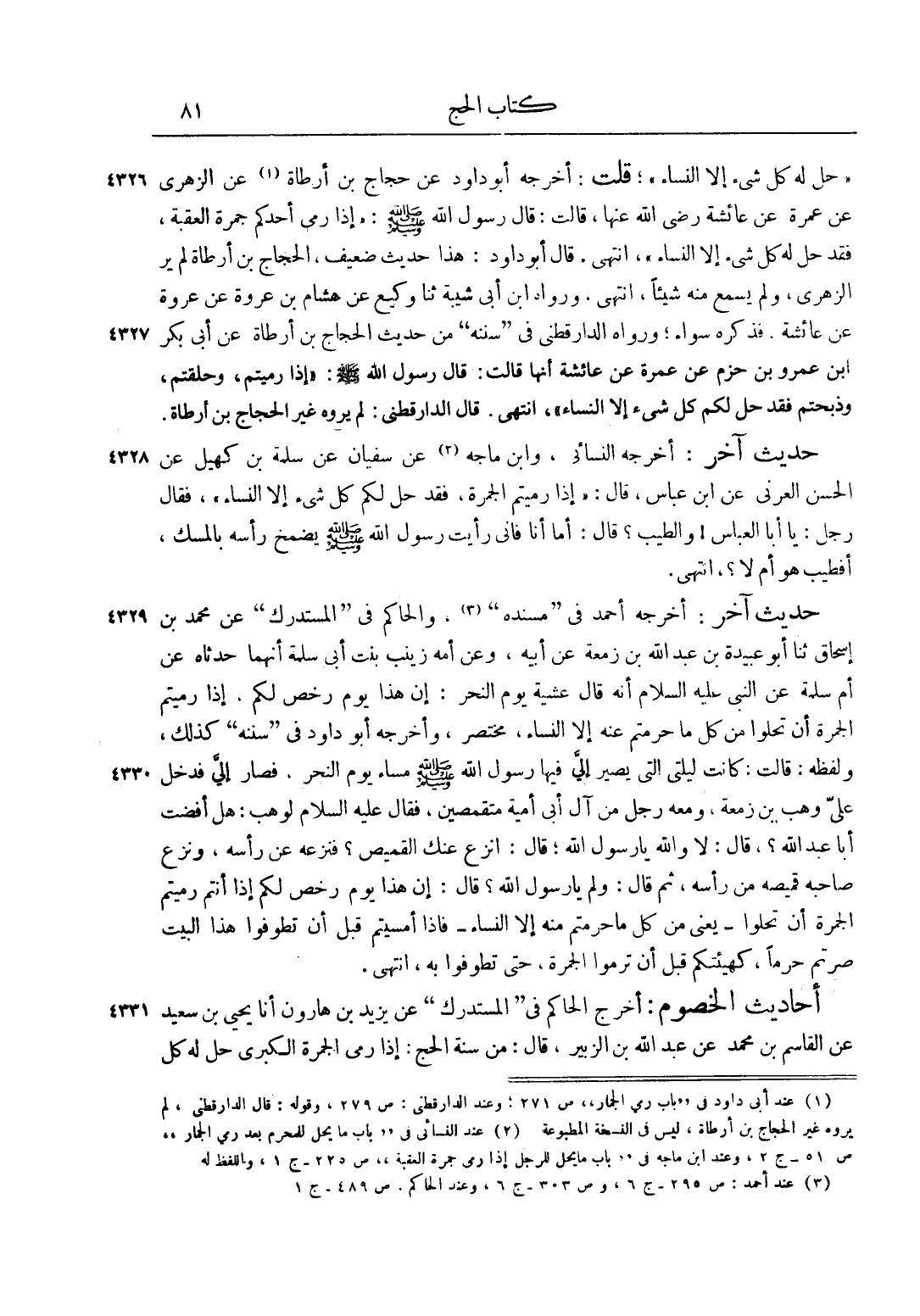 أَحَادِيثُ الْخُصُومِ: أَخْرَجَ الْحَاكِمُ فِي "الْمُسْتَدْرَكِ" عَنْ يَزِيدَ بْنِ هَارُونَ أَنَا يَحْيَى بْنُ سَعِيدٍ عَنْ الْقَاسِمِ بْنِ مُحَمَّدٍ عَنْ عَبْدِ اللَّهِ بْنِ الزُّبَيْرِ، قَالَ: مِنْ سُنَّةِ الْحَجِّ: إذَا رَمَى الْجَمْرَةَ الْكُبْرَى حَلَّ لَهُ كُلُّ
