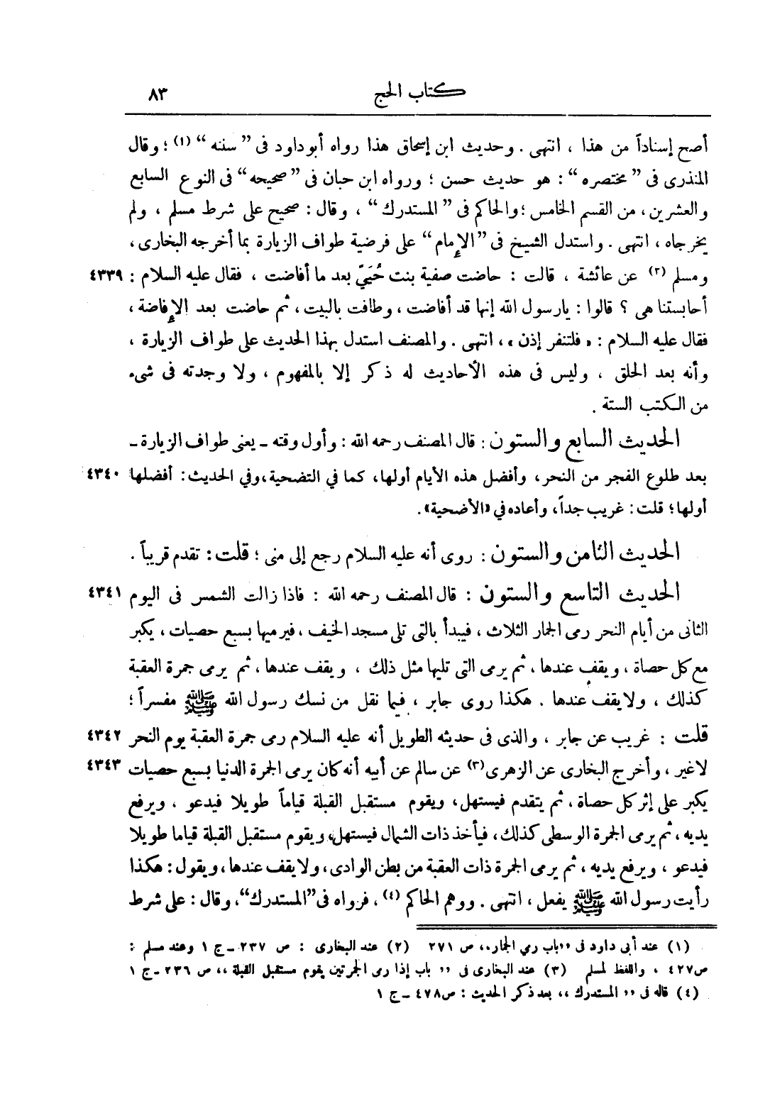 أَصَحُّ إسْنَادًا مِنْ هَذَا، انْتَهَى. وَحَدِيثُ ابْنِ إسْحَاقَ هَذَا رَوَاهُ أَبُو دَاوُد فِي "سُنَنِهِ"1، وَقَالَ الْمُنْذِرِيُّ فِي "مُخْتَصَرِهِ": هُوَ حَدِيثٌ حَسَنٌ، وَرَوَاهُ ابْنُ حِبَّانَ فِي "صَحِيحِهِ" فِي النَّوْعِ الْخَامِسِ وَالْعِشْرِينَ، مِنْ الْقِسْمِ الْخَامِسِ، وَالْحَاكِمُ فِي "الْمُسْتَدْرَكِ"، وَقَالَ: صَحِيحٌ عَلَى شَرْطِ مُسْلِمٍ، وَلَمْ يُخَرِّجَاهُ، انْتَهَى. وَاسْتَدَلَّ الشَّيْخُ فِي "الْإِمَامِ" عَلَى فَرْضِيَّةِ طَوَافِ الزِّيَارَةِ بِمَا أَخْرَجَهُ الْبُخَارِيُّ، وَمُسْلِمٌ 2 عَنْ عَائِشَةَ، قَالَتْ: حَاضَتْ صَفِيَّةُ بِنْتُ حُيَيِّ بعدما أَفَاضَتْ، فَقَالَ عليه السلام: " أَحَابِسَتُنَا هِيَ"؟ قَالُوا: يَا رَسُولَ اللَّهِ إنَّهَا قَدْ أَفَاضَتْ، وَطَافَتْ بِالْبَيْتِ، ثُمَّ حَاضَتْ بَعْدَ الْإِفَاضَةِ، فَقَالَ عليه السلام: "فلتنفر إذاً"، انْتَهَى. وَالْمُصَنِّفُ اسْتَدَلَّ بِهَذَا الْحَدِيثِ عَلَى طَوَافِ الزِّيَارَةِ، وَأَنَّهُ بَعْدَ الْحَلْقِ، وَلَيْسَ فِي هَذِهِ الْأَحَادِيثِ لَهُ ذِكْرٌ إلَّا بِالْمَفْهُومِ، وَلَا وَجَدْته فِي شَيْءٍ مِنْ الْكُتُبِ السِّتَّةِ.