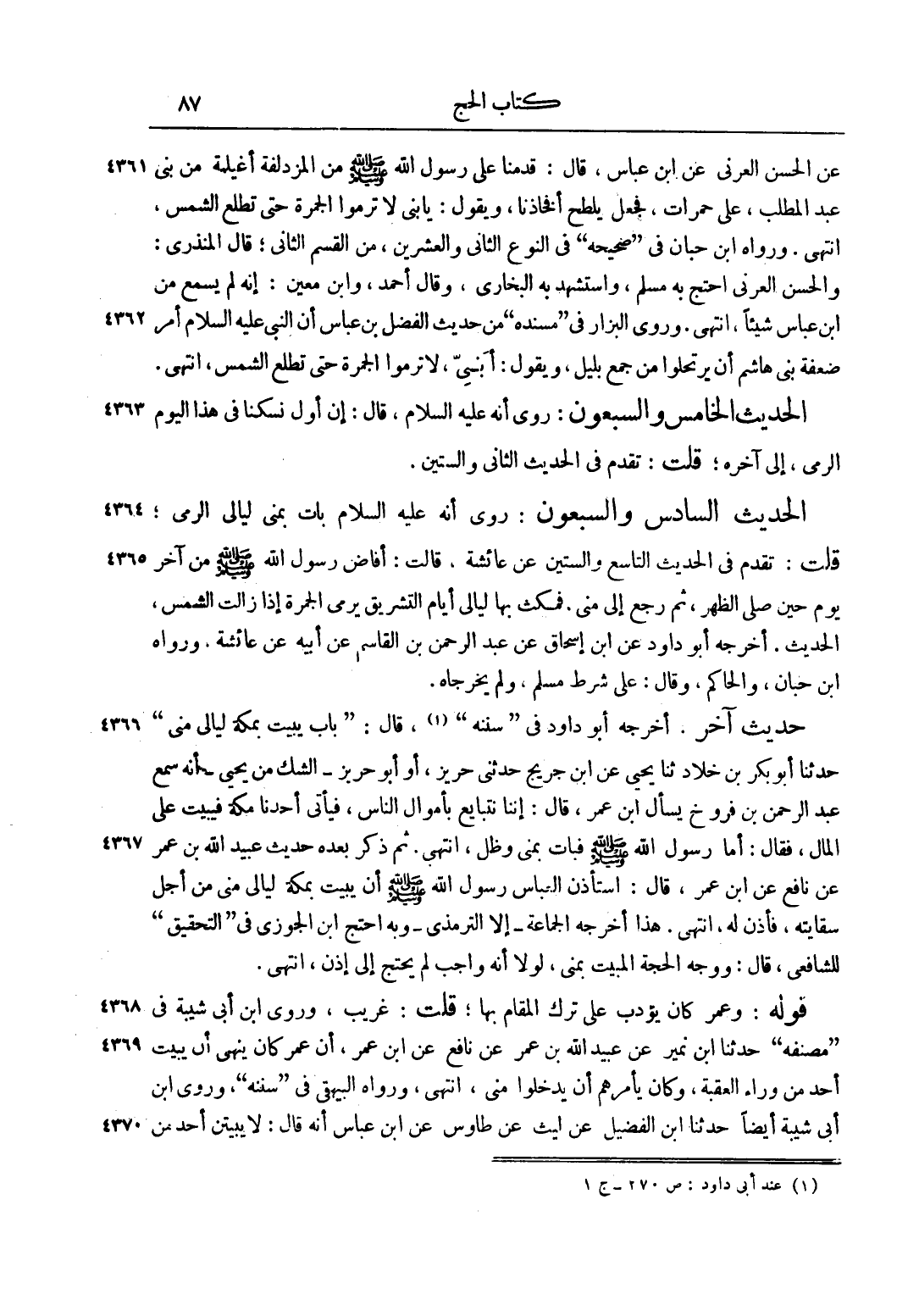 حَدِيثٌ آخَرُ: أَخْرَجَهُ أَبُو دَاوُد فِي "سُنَنِهِ"1، قَالَ: "بَابُ يَبِيتُ بِمَكَّةَ لَيَالِيَ مِنًى" حَدَّثَنَا أَبُو بَكْرِ بْنُ خَلَّادٍ ثَنَا يَحْيَى عَنْ ابْنِ جُرَيْجٍ حَدَّثَنِي حَرِيزٌ، أَوْ أَبُو حَرِيزٍ - الشَّكُّ مِنْ يَحْيَى - أَنَّهُ سَمِعَ عَبْدَ الرَّحْمَنِ بْنَ فَرُّوخَ يَسْأَلُ ابْنَ عُمَرَ، قَالَ: إنَّنَا نَتَبَايَعُ بِأَمْوَالِ النَّاسِ، فَيَأْتِي أَحَدُنَا مَكَّةَ فَيَبِيتُ عَلَى الْمَالِ، فَقَالَ: أَمَّا رَسُولُ اللَّهِ صَلَّى اللَّهُ عَلَيْهِ وَسَلَّمَ فَبَاتَ بِمِنًى وَظَلَّ، انْتَهَى. ثُمَّ ذَكَرَ بَعْدَهُ حَدِيثَ عُبَيْدِ اللَّهِ بْنِ عُمَرَ عَنْ نَافِعٍ عَنْ ابْنِ عُمَرَ، قَالَ: اسْتَأْذَنَ الْعَبَّاسُ رَسُولَ الله صَلَّى اللَّهُ عَلَيْهِ وَسَلَّمَ أن يبيت مكة لَيَالِيَ مِنًى مِنْ أَجْلِ سِقَايَتِهِ، فَأَذِنَ لَهُ، انْتَهَى. هَذَا أَخْرَجَهُ الْجَمَاعَةُ - إلَّا التِّرْمِذِيَّ - وَبِهِ احْتَجَّ ابْنُ الْجَوْزِيِّ فِي "التَّحْقِيقِ" لِلشَّافِعِيِّ، قَالَ: وَوَجْهُ الْحُجَّةِ الْمَبِيتُ بِمِنًى، لَوْلَا أَنَّهُ وَاجِبٌ لَمْ يَحْتَجْ إلَى إذْنٍ، انْتَهَى.