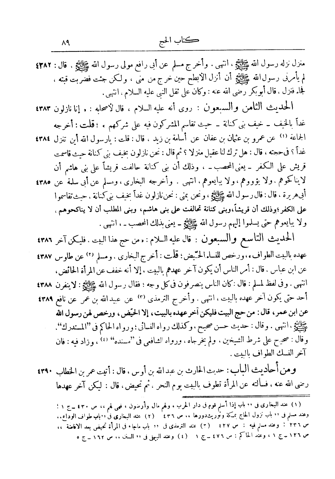 الْحَدِيثُ الثَّامِنُ وَالسَّبْعُونَ: رُوِيَ أَنَّهُ عليه السلام، قَالَ لِأَصْحَابِهِ: "إنَّا نَازِلُونَ غَدًا بِالْخَيْفِ - خَيْفِ بَنِي كنانة - حيث تقاسم المشركين فِيهِ عَلَى شِرْكِهِمْ"، قُلْت: أَخْرَجَهُ الْجَمَاعَةُ 1 عَنْ عَمْرِو بْنِ عُثْمَانَ بْنِ عَفَّانَ عَنْ أُسَامَةَ بْنِ زَيْدٍ، قَالَ: قُلْت: يَا رَسُولَ اللَّهِ أَيْنَ تَنْزِلُ غَدًا؟ فِي حَجَّتِهِ، قَالَ: "هَلْ تَرَكَ لَنَا عَقِيلٌ مَنْزِلًا"؟ ثُمَّ قَالَ: "نَحْنُ نَازِلُونَ بِخَيْفِ بَنِي كِنَانَةَ حَيْثُ قَاسَمَتْ قُرَيْشٌ عَلَى الْكُفْرِ" - يَعْنِي الْمُحَصَّبَ - وَذَلِكَ أَنَّ بَنِي كِنَانَةَ حَالَفَتْ قُرَيْشًا عَلَى بَنِي هَاشِمٍ أَنْ لَا يُنَاكِحُوهُمْ، وَلَا يُؤْوُوهُمْ، وَلَا يُبَايِعُوهُمْ، انْتَهَى. وَأَخْرَجَهُ الْبُخَارِيُّ، وَمُسْلِمٌ عَنْ أَبِي سَلَمَةَ عَنْ أَبِي هُرَيْرَةَ، قَالَ: قَالَ رَسُولُ اللَّهِ صَلَّى اللَّهُ عَلَيْهِ وَسَلَّمَ، وَنَحْنُ بِمِنًى: "نَحْنُ نَازِلُونَ غَدًا بِخَيْفِ بَنِي كِنَانَةَ، حَيْثُ تَقَاسَمُوا عَلَى الْكُفْرِ"، وَذَلِكَ أَنَّ قُرَيْشًا، وَبَنِي كِنَانَةَ حَالَفَتْ عَلَى بَنِي هَاشِمٍ، وَبَنِي الْمُطَّلِبِ أَنْ لَا يُنَاكِحُوهُمْ، وَلَا يُبَايِعُوهُمْ حَتَّى يُسَلِّمُوا إلَيْهِمْ رَسُولَ اللَّهِ صَلَّى اللَّهُ عَلَيْهِ وَسَلَّمَ - يَعْنِي بِذَلِكَ الْمُحَصَّبَ، انْتَهَى.