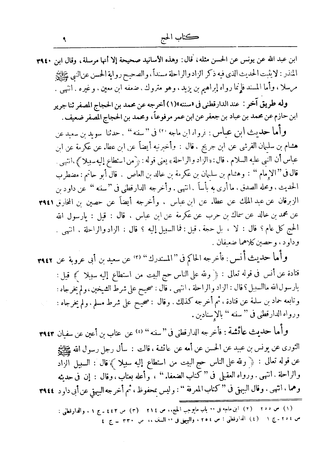 بْنُ عَبْدِ اللَّهِ عَنْ يُونُسَ عَنْ الْحَسَنِ مِثْلَهُ، قَالَ: وَهَذِهِ إسْنَادٌ فِي "صَحِيحِهِ" إلَّا أَنَّهَا مُرْسَلَةٌ، وَقَالَ ابْنُ الْمُنْذِرِ: لَا يَثْبُتُ الْحَدِيثُ الَّذِي فِيهِ ذِكْرُ الزاد والراحلة مُسْنَدًا، وَالصَّحِيحُ رِوَايَةُ الْحَسَنِ عَنْ النَّبِيِّ صَلَّى اللَّهُ عَلَيْهِ وَسَلَّمَ مُرْسَلًا، وَأَمَّا الْمُسْنَدُ فَإِنَّمَا رَوَاهُ إبْرَاهِيمُ بْنُ يَزِيدَ، وَهُوَ مَتْرُوكٌ، ضَعَّفَهُ ابْنُ مَعِينٍ، وَغَيْرُهُ، انْتَهَى.
