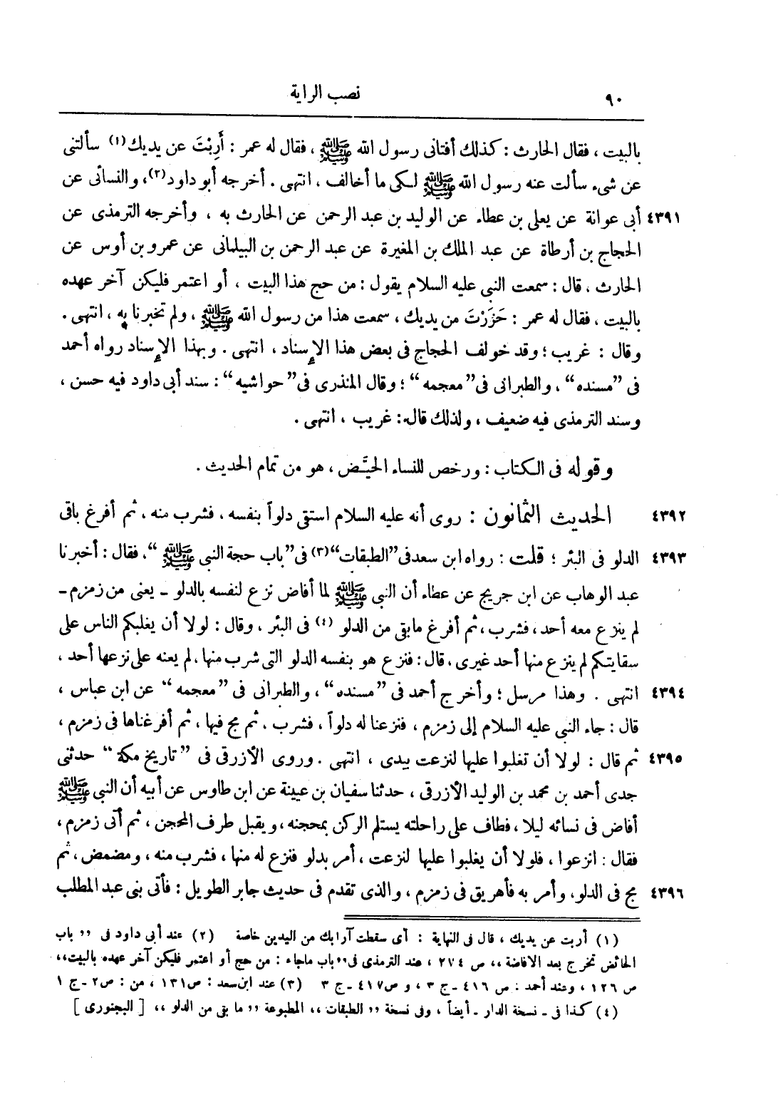 الْحَدِيثُ الثَّمَانُونَ: رُوِيَ أَنَّهُ عليه السلام اسْتَقَى دَلْوًا بِنَفْسِهِ، فَشَرِبَ مِنْهُ، ثُمَّ أَفْرَغَ بَاقِيَ الدَّلْوِ فِي الْبِئْرِ، قُلْت: رَوَاهُ ابْنُ سَعْدٍ فِي "الطَّبَقَاتِ"3 فِي "بَابِ حَجَّةِ النَّبِيِّ صَلَّى اللَّهُ عَلَيْهِ وَسَلَّمَ"، فَقَالَ: أَخْبَرَنَا عَبْدُ الْوَهَّابِ عَنْ ابْنِ جُرَيْجٍ عَنْ عَطَاءٍ أَنَّ النَّبِيَّ صَلَّى اللَّهُ عَلَيْهِ وَسَلَّمَ لَمَّا أَفَاضَ نَزَعَ لِنَفْسِهِ بِالدَّلْوِ - يَعْنِي مِنْ زَمْزَمَ - لَمْ يَنْزِعْ مَعَهُ أَحَدٌ، فَشَرِبَ، ثُمَّ أَفْرَغَ مَا بَقِيَ مِنْ الدَّلْوِ 4 فِي الْبِئْرِ، وَقَالَ: " لَوْلَا أَنْ يَغْلِبَكُمْ النَّاسُ عَلَى سِقَايَتِكُمْ لَمْ يَنْزِعْ مِنْهَا أَحَدٌ غَيْرِي"، قَالَ: فَنَزَعَ هُوَ بِنَفْسِهِ الدَّلْوَ الَّتِي شَرِبَ مِنْهَا، لَمْ يُعِنْهُ عَلَى نَزْعِهَا أَحَدٌ، انْتَهَى. وَهَذَا مُرْسَلٌ، وَأَخْرَجَ أَحْمَدُ فِي "مُسْنَدِهِ"، وَالطَّبَرَانِيُّ فِي "مُعْجَمِهِ" عَنْ ابْنِ عَبَّاسٍ، قَالَ: جَاءَ النَّبِيُّ عليه السلام إلَى زَمْزَمَ، فَنَزَعْنَا لَهُ دَلْوًا، فَشَرِبَ، ثُمَّ مَجَّ فِيهَا، ثُمَّ أَفْرَغْنَاهَا فِي زَمْزَمَ، ثُمَّ قَالَ: " لَوْلَا أَنْ تُغْلَبُوا عَلَيْهَا لَنَزَعْت بِيَدَيَّ"، انْتَهَى. وَرَوَى الْأَزْرَقِيُّ فِي "تَارِيخِ مَكَّةَ" حَدَّثَنِي جَدِّي أَحْمَدُ بْنُ مُحَمَّدِ بْنِ الْوَلِيدِ الْأَزْرَقِيُّ، حَدَّثَنَا سُفْيَانُ بْنُ عُيَيْنَةَ عَنْ ابْنِ طَاوُسٍ عَنْ أَبِيهِ أَنَّ النَّبِيَّ صَلَّى اللَّهُ عَلَيْهِ وَسَلَّمَ أَفَاضَ فِي نِسَائِهِ لَيْلًا، فَطَافَ عَلَى رَاحِلَتِهِ يَسْتَلِمُ الرُّكْنَ بِمِحْجَنِهِ، وَيُقَبِّلُ طَرَفَ الْمِحْجَنِ، ثُمَّ أَتَى زَمْزَمَ، فَقَالَ: "انْزِعُوا، فَلَوْلَا أَنْ يُغْلَبُوا عَلَيْهَا لَنَزَعْت"، أَمَرَ بِدَلْوٍ فَنُزِعَ لَهُ مِنْهَا، فَشَرِبَ مِنْهُ، وَمَضْمَضَ، ثُمَّ مَجَّ فِي الدَّلْوِ، وَأَمَرَ بِهِ فَأُهْرِيقَ فِي زَمْزَمَ، وَاَلَّذِي تَقَدَّمَ فِي حَدِيثِ جَابِرٍ الطَّوِيلِ: فَأَتَى بَنِي عَبْدِ الْمُطَّلِبِ