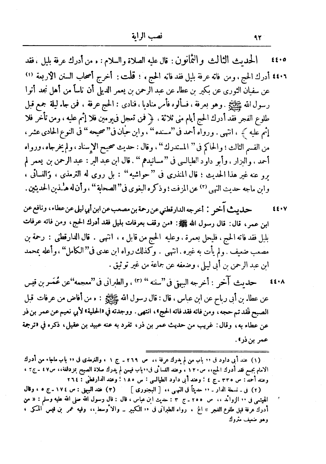حَدِيثٌ آخَرُ: أَخْرَجَهُ الدَّارَقُطْنِيُّ عَنْ رَحْمَةَ بْنِ مُصْعَبٍ عَنْ ابْنِ أَبِي لَيْلَى عَنْ عَطَاءٍ، وَنَافِعٍ عَنْ ابْنِ عُمَرَ، قَالَ: قَالَ رَسُولُ اللَّهِ صَلَّى اللَّهُ عَلَيْهِ وَسَلَّمَ: "مَنْ وَقَفَ بِعَرَفَةَ بِلَيْلٍ فَقَدْ أَدْرَكَ الْحَجَّ، وَمَنْ فَاتَهُ عَرَفَةُ بِلَيْلٍ فَقَدْ فَاتَهُ الْحَجُّ، فَلْيَحِلَّ بِعُمْرَةٍ، وَعَلَيْهِ الْحَجُّ مِنْ قَابِلٍ"، انْتَهَى. قَالَ الدَّارَقُطْنِيُّ: رَحْمَةُ بْنُ مُصْعَبٍ ضَعِيفٌ، وَلَمْ يَأْتِ بِهِ غَيْرُهُ، انْتَهَى. وَكَذَلِكَ رَوَاهُ ابْنُ عَدِيٍّ فِي "الْكَامِلِ"، وَأَعَلَّهُ بِمُحَمَّدِ بْنِ عَبْدِ الرَّحْمَنِ بْنِ أَبِي لَيْلَى، وَضَعَّفَهُ عَنْ جَمَاعَةٍ مِنْ غَيْرِ تَوْثِيقٍ.