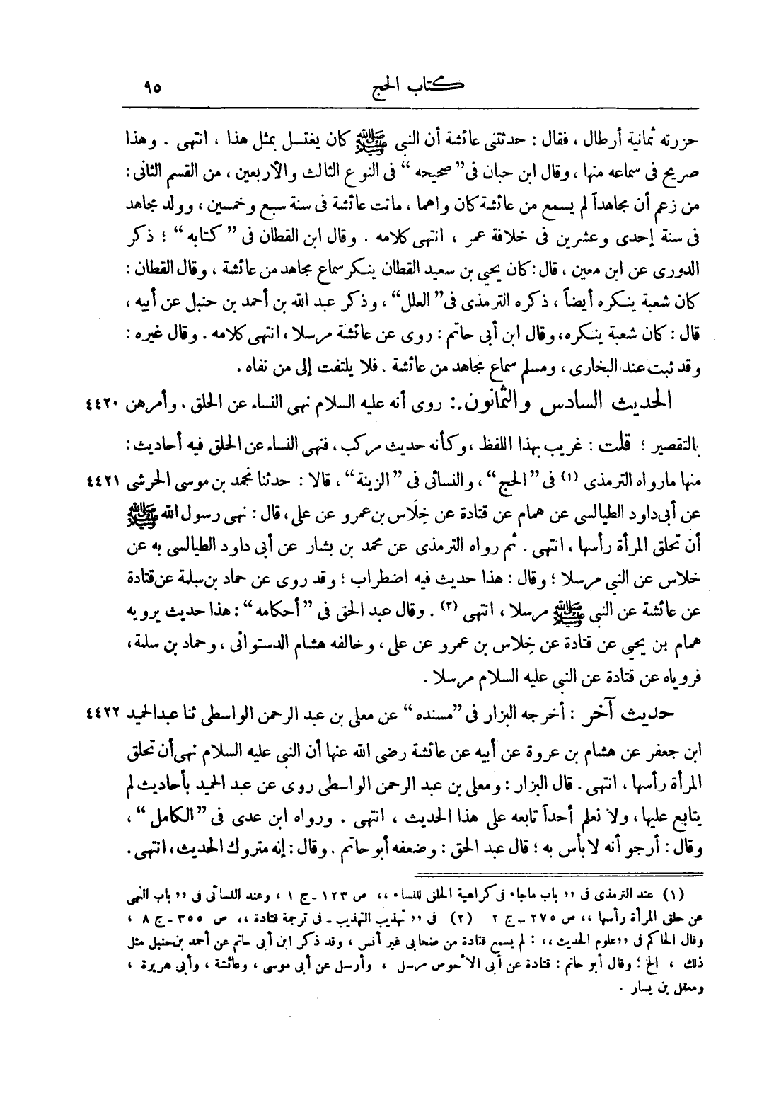 الْحَدِيثُ السَّادِسُ وَالثَّمَانُونَ: رُوِيَ أَنَّهُ عليه السلام نَهَى النِّسَاءَ عَنْ الْحَلْقِ، وَأَمَرَهُنَّ بِالتَّقْصِيرِ، قُلْت: غَرِيبٌ بِهَذَا اللَّفْظِ، وَكَأَنَّهُ حَدِيثٌ مُرَكَّبٌ، فَنَهْيُ النِّسَاءِ عَنْ الْحَلْقِ فِيهِ أَحَادِيثُ: مِنْهَا مَا رَوَاهُ التِّرْمِذِيُّ 1 فِي "الْحَجِّ"، وَالنَّسَائِيُّ فِي "الزِّينَةِ"، قَالَا: حَدَّثَنَا مُحَمَّدُ بْنُ مُوسَى الْحَرَشِيُّ عَنْ أَبِي دَاوُد الطَّيَالِسِيِّ عَنْ هَمَّامٍ عَنْ قَتَادَةَ عَنْ خِلَاسِ بْنِ عَمْرٍو عَنْ عَلِيٍّ، قَالَ: نَهَى رَسُولُ اللَّهِ صَلَّى اللَّهُ عَلَيْهِ وَسَلَّمَ أَنْ تَحْلِقَ الْمَرْأَةُ رَأْسَهَا، انْتَهَى. ثُمَّ رَوَاهُ التِّرْمِذِيُّ عَنْ مُحَمَّدِ بْنِ بَشَّارٍ عَنْ أَبِي دَاوُد الطَّيَالِسِيِّ بِهِ عَنْ خِلَاسٍ عَنْ النَّبِيِّ مُرْسَلًا، وَقَالَ: هَذَا حَدِيثٌ فِيهِ اضْطِرَابٌ، وَقَدْ رُوِيَ عَنْ حَمَّادِ بْنِ سَلَمَةَ عَنْ قَتَادَةَ عَنْ عَائِشَةَ عَنْ النَّبِيِّ صَلَّى اللَّهُ عَلَيْهِ وَسَلَّمَ مُرْسَلًا، انْتَهَى2. وَقَالَ عَبْدُ الْحَقِّ فِي "أَحْكَامِهِ": هَذَا حَدِيثٌ يَرْوِيه هَمَّامٌ عَنْ يَحْيَى عَنْ قَتَادَةَ عَنْ خِلَاسِ بْنِ عَمْرٍو عَنْ عَلِيٍّ، وَخَالَفَهُ هِشَامٌ الدَّسْتُوَائِيُّ، وَحَمَّادُ بْنُ سَلَمَةَ، فَرَوَيَاهُ عَنْ قَتَادَةَ عَنْ النَّبِيِّ عليه السلام مُرْسَلًا.
