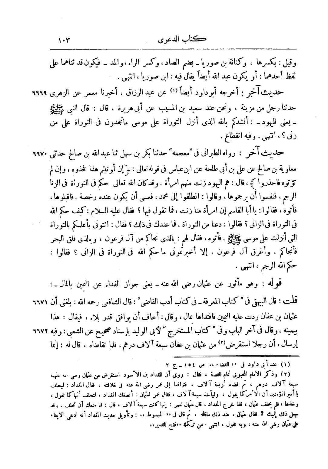 2 وذكر الإمام المحبوبي تمام القصة، فقال: روي أن المقداد بن الأسود استقرض من عثمان رضي الله عنهما سبعة آلاف درهم، ثم قضاه أربعة ألاف، فترافعا إلى عمر رضي الله عنه في خلافته، فقال المقداد ليحلف يا أمير المؤمنين أن الأمر كما يقول، وليأخذ سبعة آلاف، فقال عمر لعثمان: أنصفك المقداد، لتحلف أنها كما تقول، وخذها، فلم يحلف عثمان، فلما خرج المقداد، قال عثمان لعمر: إنها كانت سبعة آلاف، قال: فما منعك أن تحلف، وقد جعل ذلك إليك؟ فقال عثمان، عند ذلك ما قاله، ثم قال في المبسوط: وتأويل حديث المقداد أنه ادعى الإيفاء على عثمان رضي الله عنه، وبه نقول، انتهى. من تكملة فتح القدير.
