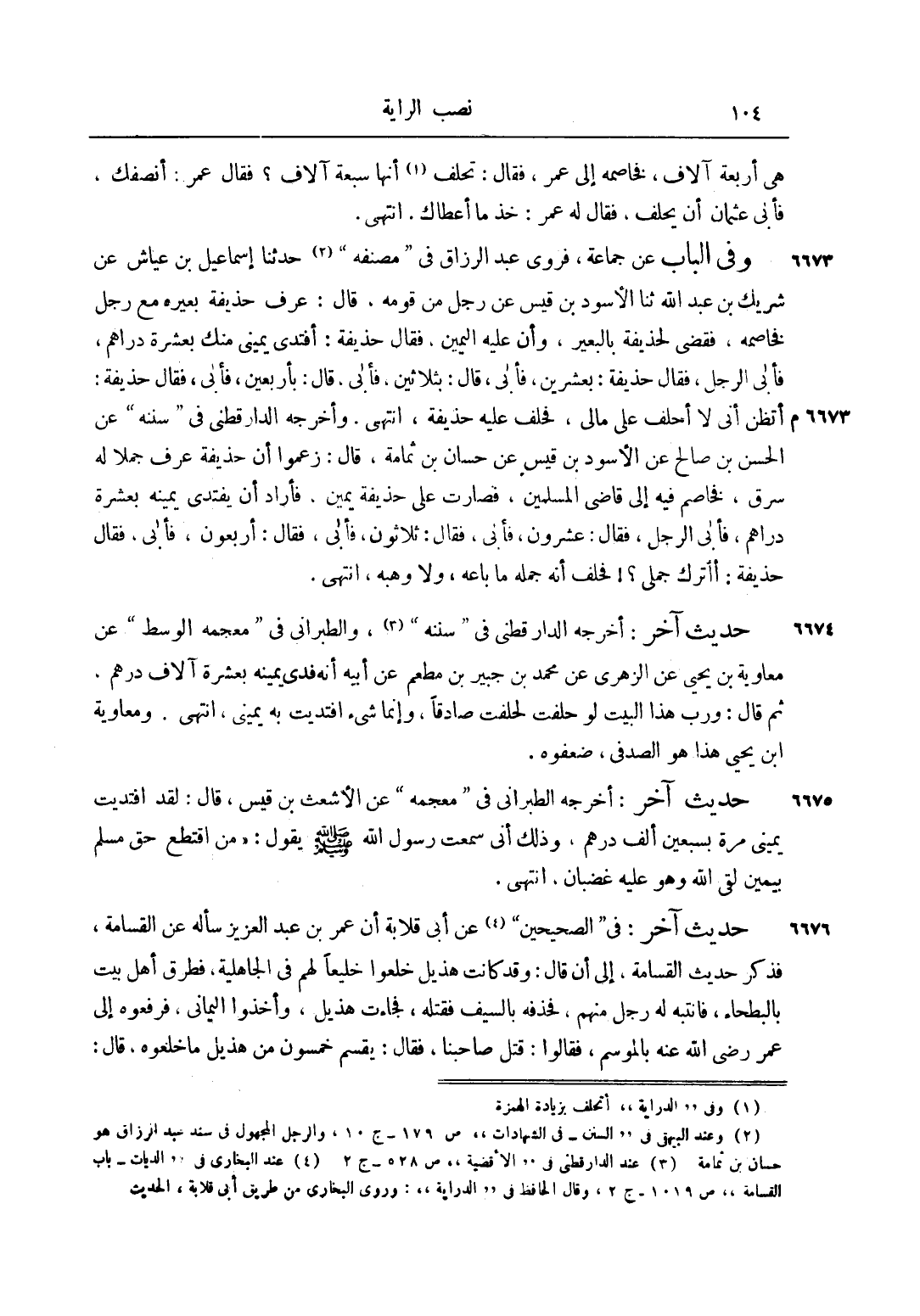 وَفِي الْبَابِ عَنْ جَمَاعَةٍ، فَرَوَى عَبْدُ الرَّزَّاقِ فِي مُصَنَّفِهِ2 حَدَّثَنَا إسْمَاعِيلُ بْنُ عَيَّاشٍ عَنْ شَرِيكِ بْنِ عَبْدِ اللَّهِ ثَنَا الْأَسْوَدُ بْنُ قَيْسٍ عَنْ رَجُلٍ مِنْ قَوْمِهِ، قَالَ: عَرَفَ حُذَيْفَةُ بَعِيرَهُ مَعَ رَجُلٍ فَخَاصَمَهُ، فَقَضَى لِحُذَيْفَةَ بِالْبَعِيرِ، وَأَنَّ عَلَيْهِ الْيَمِينَ، فَقَالَ حُذَيْفَةُ: أَفْتَدِي يَمِينِي مِنْك بِعَشَرَةِ دَرَاهِمَ، فَأَبَى الرَّجُلُ، فَقَالَ حُذَيْفَةُ: بِعِشْرِينَ، فَأَبَى، قَالَ: بِثَلَاثِينَ، فَأَبَى، قَالَ: بِأَرْبَعِينَ، فَأَبَى، فَقَالَ حُذَيْفَةُ: أَتَظُنُّ أَنِّي لَا أَحْلِفُ عَلَى مَالِي، فَحَلَفَ عَلَيْهِ حُذَيْفَةُ، انْتَهَى. وَأَخْرَجَهُ الدَّارَقُطْنِيُّ فِي سُنَنِهِ عَنْ الْحَسَنِ بْنِ صَالِحٍ عَنْ الْأَسْوَدِ بْنِ قَيْسٍ عَنْ حَسَّانَ بْنِ ثُمَامَةَ، قَالَ: زَعَمُوا أَنَّ حُذَيْفَةَ عَرَفَ جَمَلًا لَهُ سُرِقَ، فَخَاصَمَ فِيهِ إلَى قَاضِي الْمُسْلِمِينَ، فَصَارَتْ عَلَى حُذَيْفَةَ يَمِينٌ، فَأَرَادَ أَنْ يَفْتَدِيَ يَمِينَهُ بِعَشَرَةِ دَرَاهِمَ، فَأَبَى الرَّجُلُ، فَقَالَ: عِشْرُونَ، فَأَبَى، فَقَالَ: ثَلَاثُونَ، فَأَبَى، فَقَالَ: أَرْبَعُونَ، فَأَبَى، فَقَالَ حُذَيْفَةُ: أَأَتْرُكُ جَمَلِي؟! فَحَلَفَ أَنَّهُ جَمَلُهُ مَا بَاعَهُ، وَلَا وَهَبَهُ، انْتَهَى.